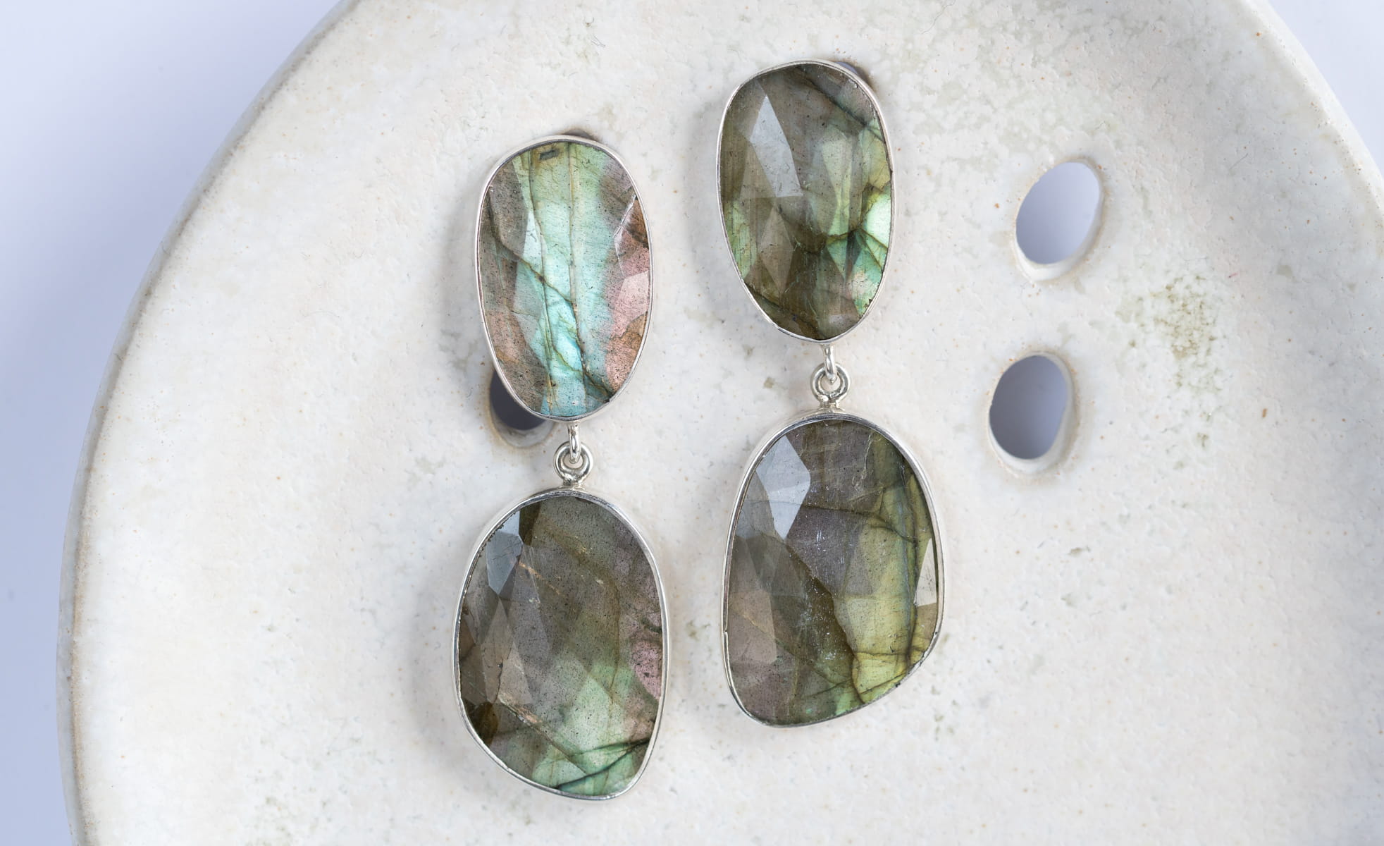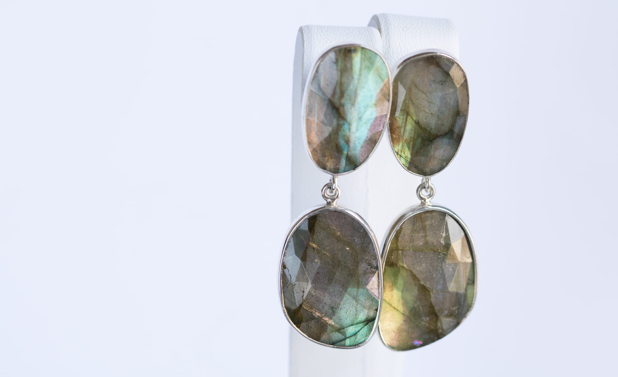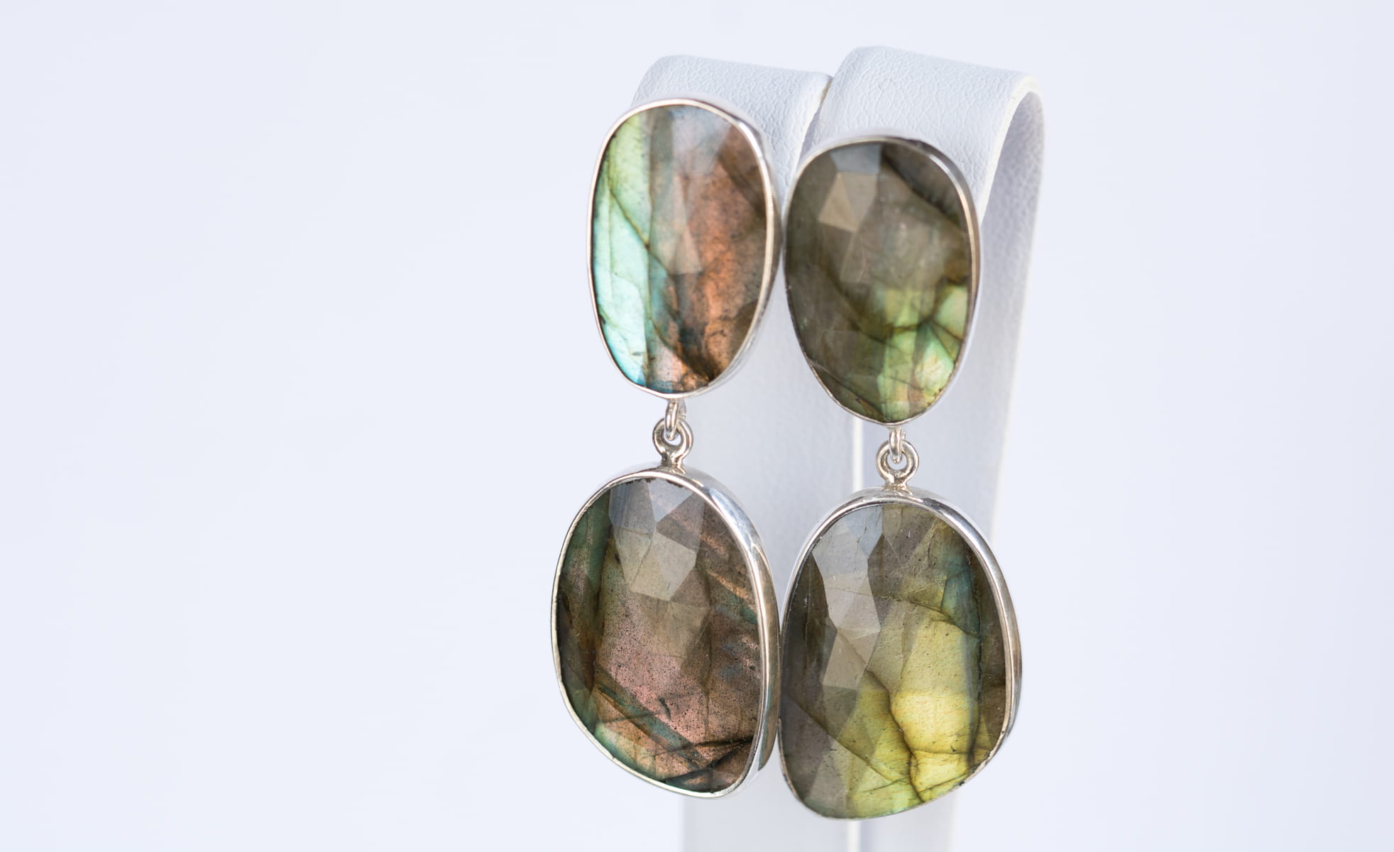 Wiszące kolczyki z fasetowanymi labradorytami w srebrnej oprawie p.925, na sztyft. Długość całkowita kolczyków 45mm.