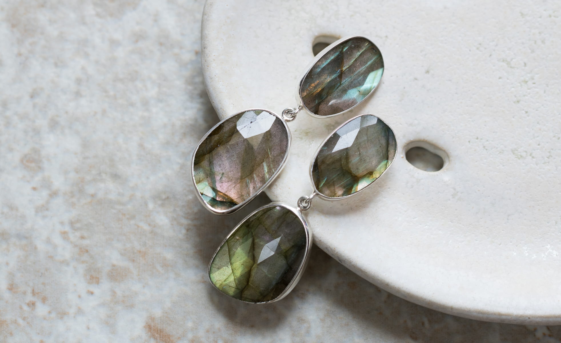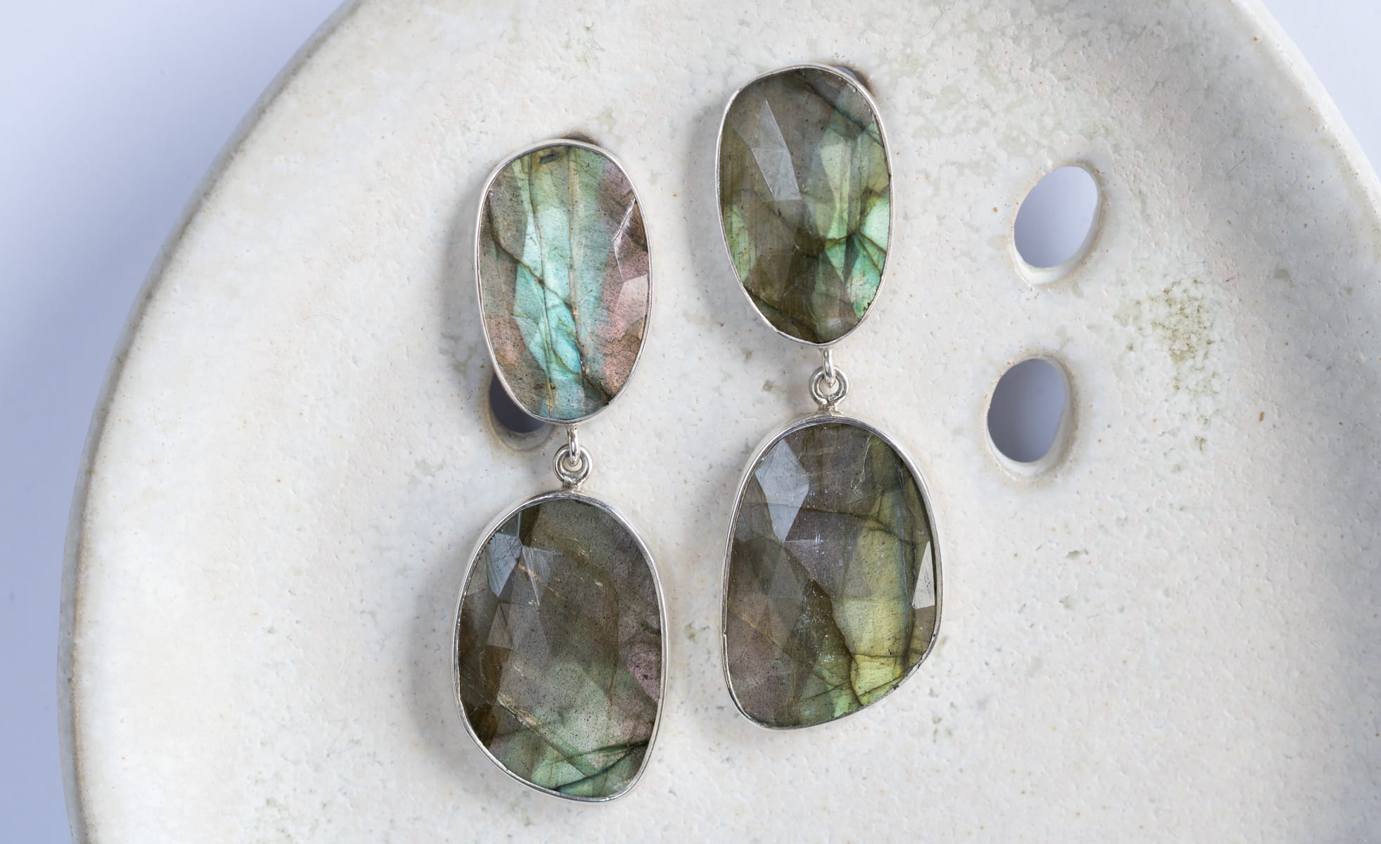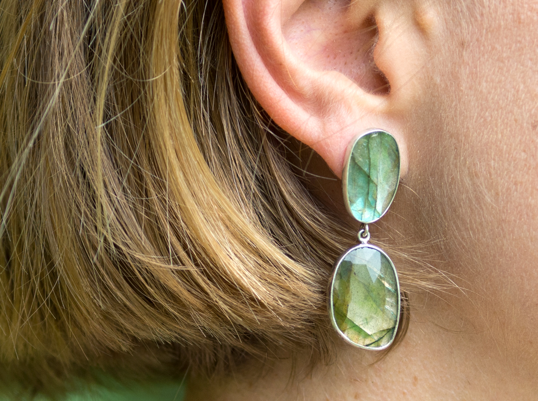 Wiszące kolczyki z fasetowanymi labradorytami w srebrnej oprawie p.925, na sztyft. Długość całkowita kolczyków 45mm.
