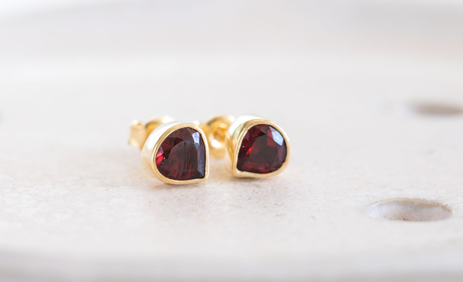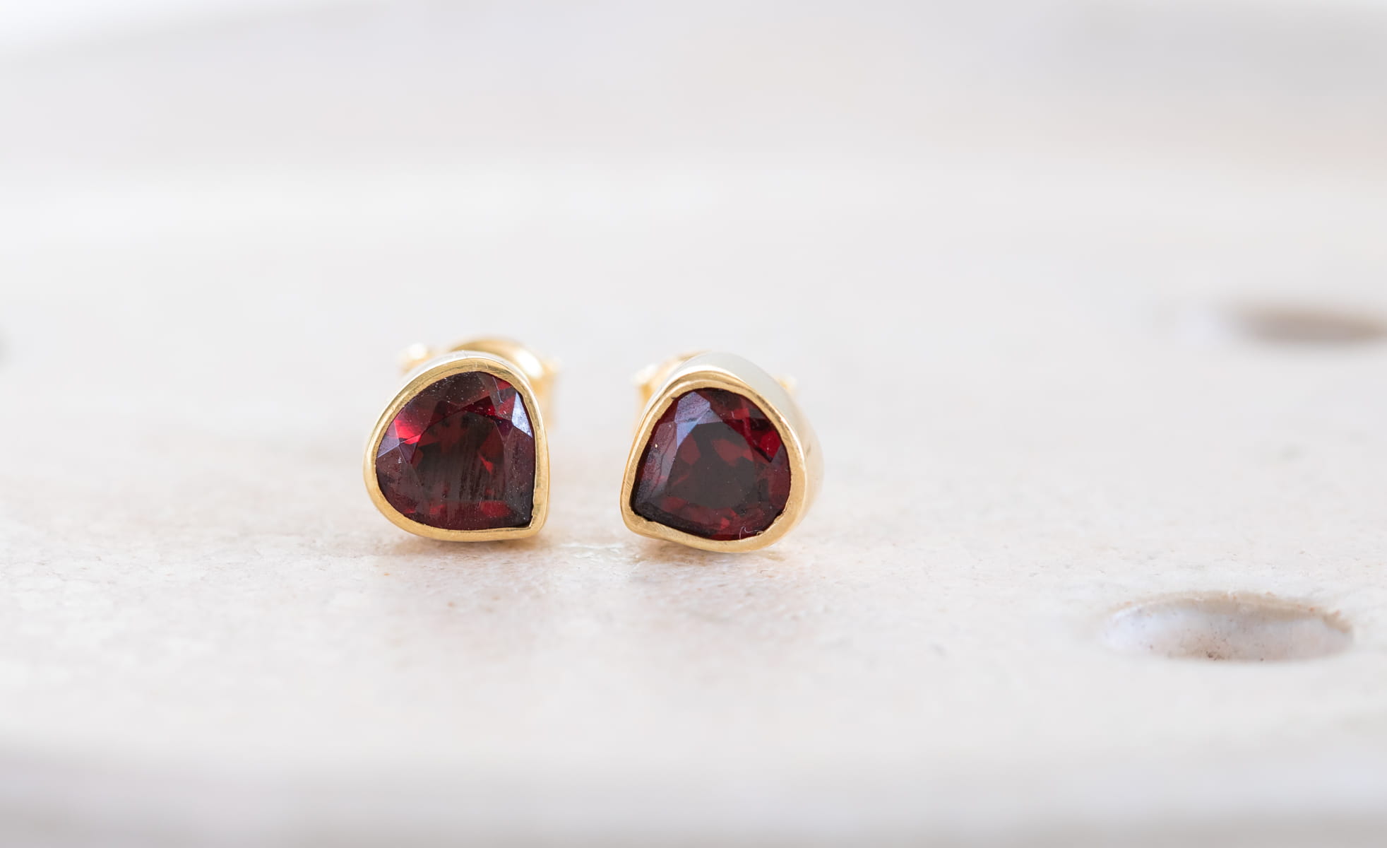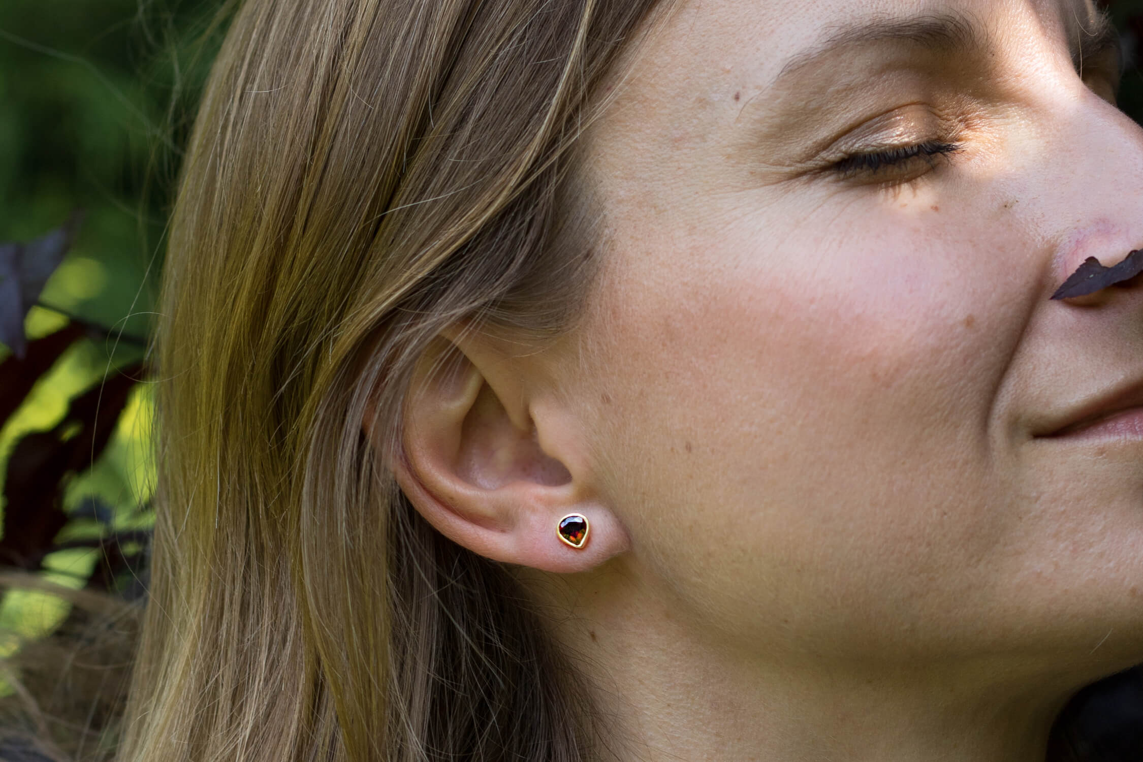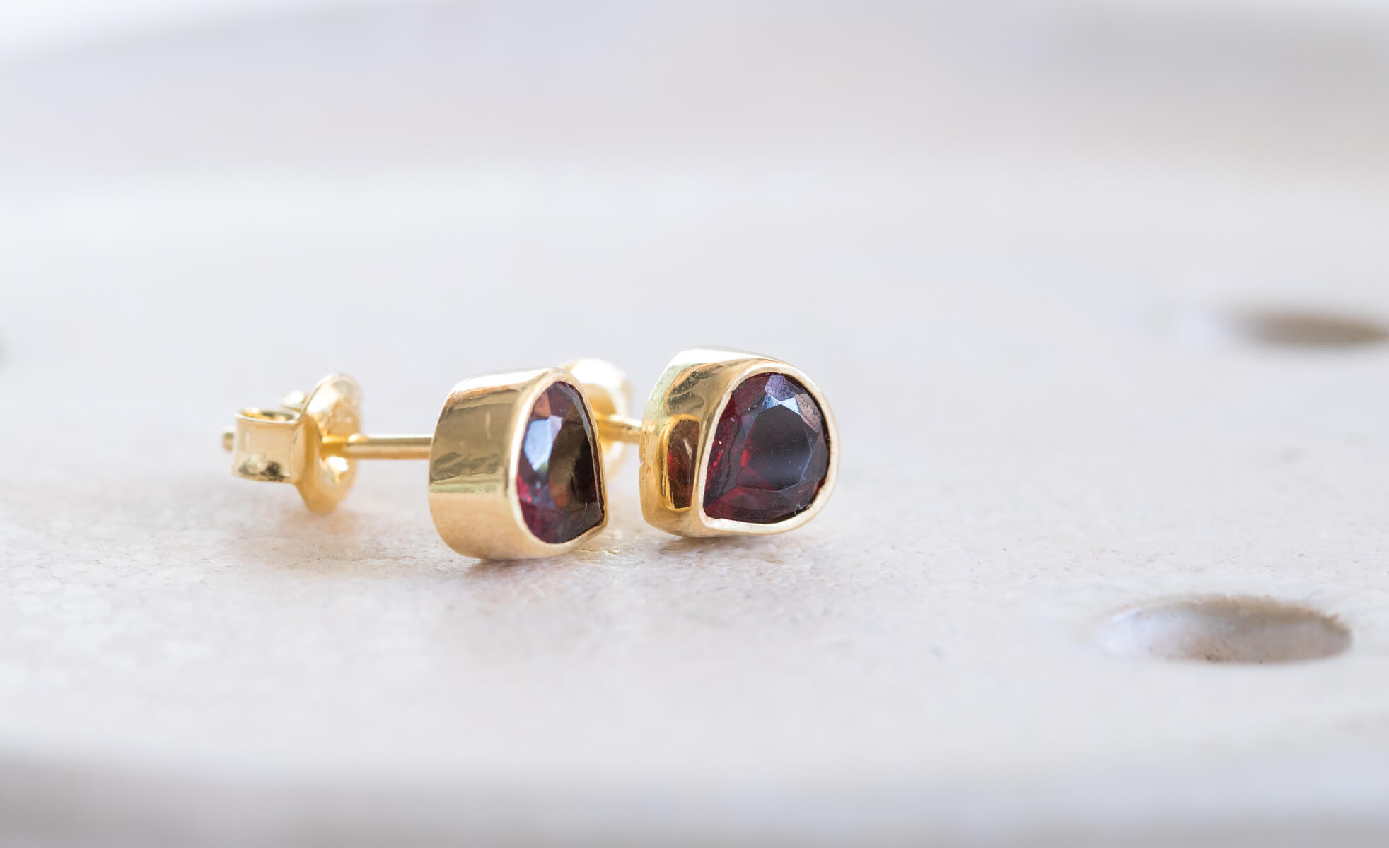 Wyraź swój styl czerwonymi granatami - ich barwa w połączeniu z kolorem złota to uniwersalny styl pasujący do każdej kreacji. Kolczyki w charakterystycznym kształcie w rozmiarze 6x6mm, pozłacane są 24karatowym złotem.