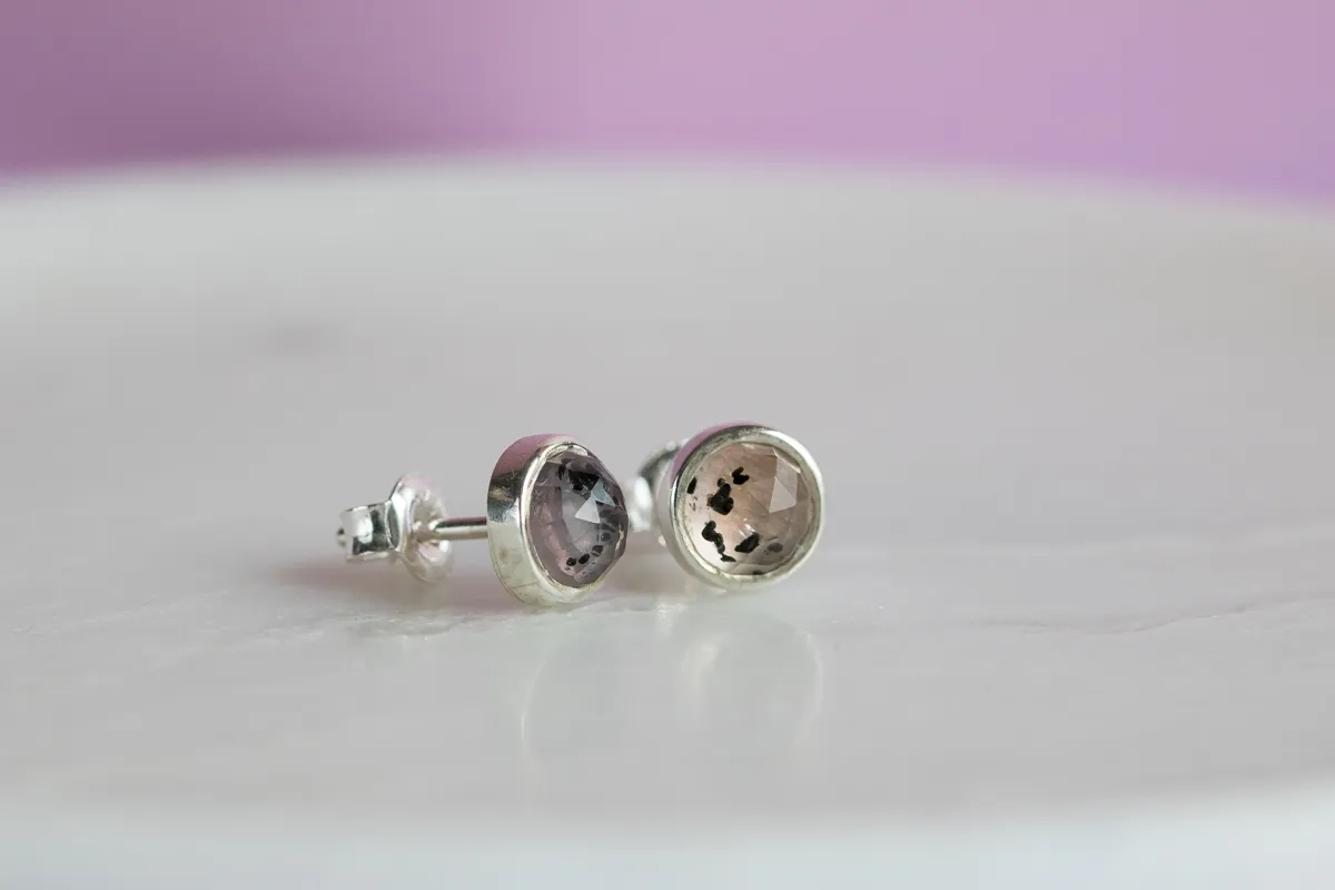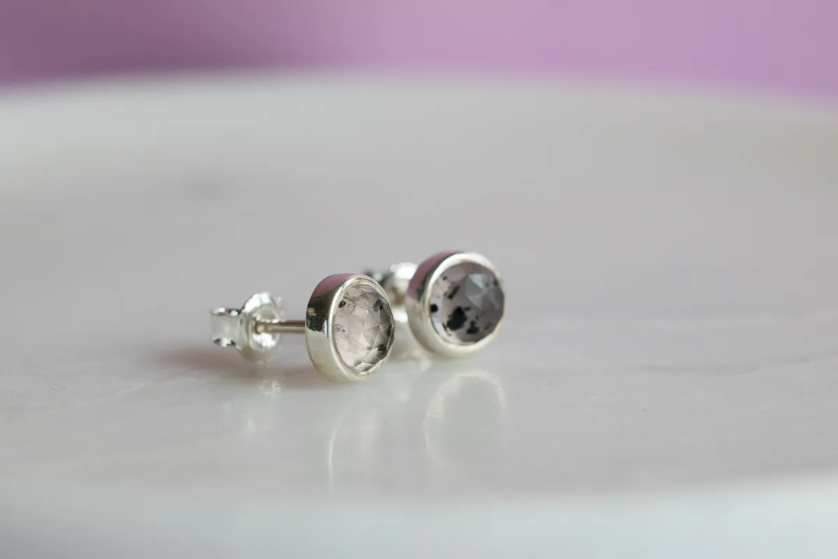 Kolczyki: srebro p.925, kwarc różowy z inkluzjami fasetowany 6mm – sztyfty