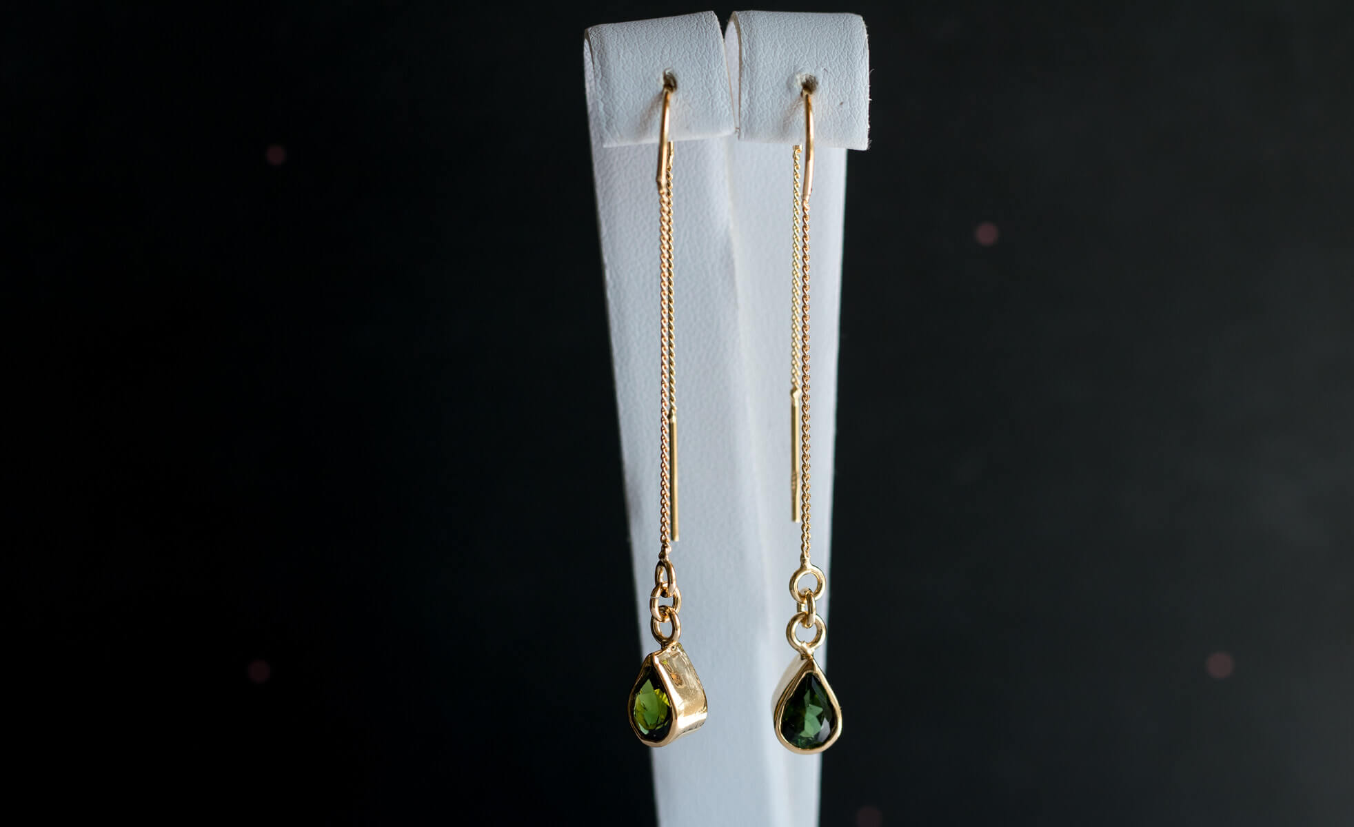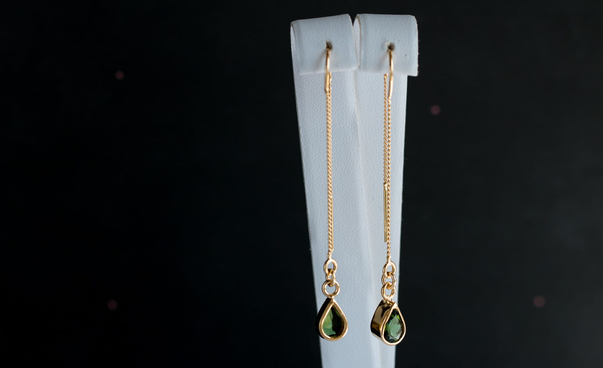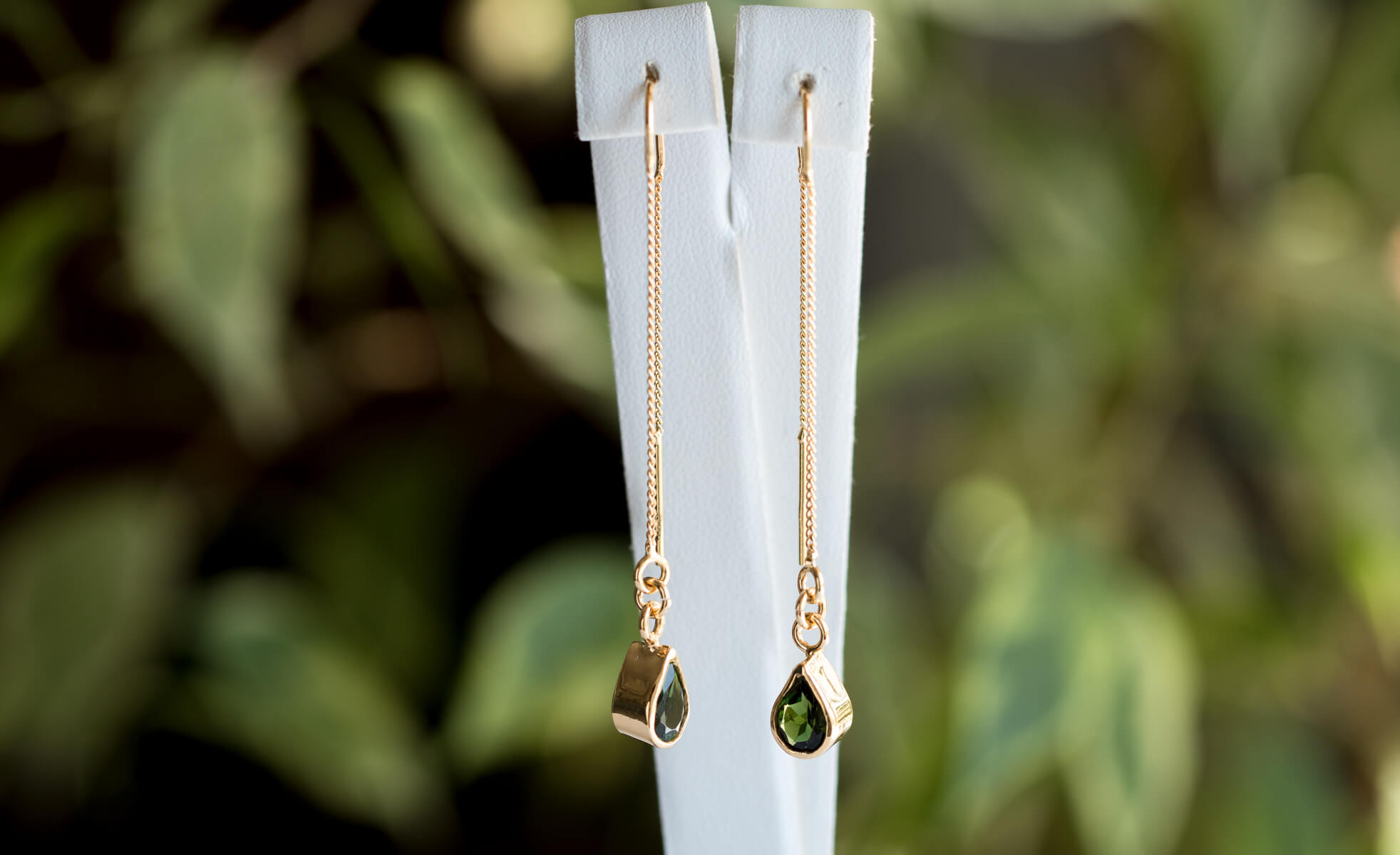 Srebrne przewlekane kolczyki z turmalinami w kolorze butelkowej zieleni, w kształcie łezek 5x7mm.