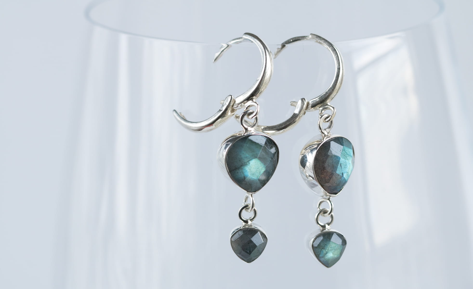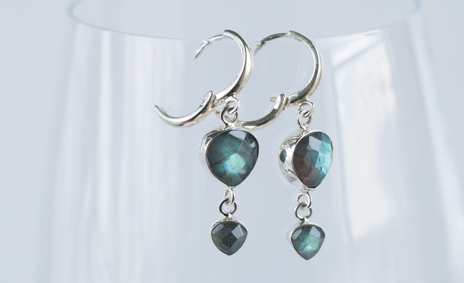 Srebrne kolczyki wiszące fasetowanymi labradorytami o długości 43mm. Kolczyki z zamkniętymi biglami typu 'kajdanki'.