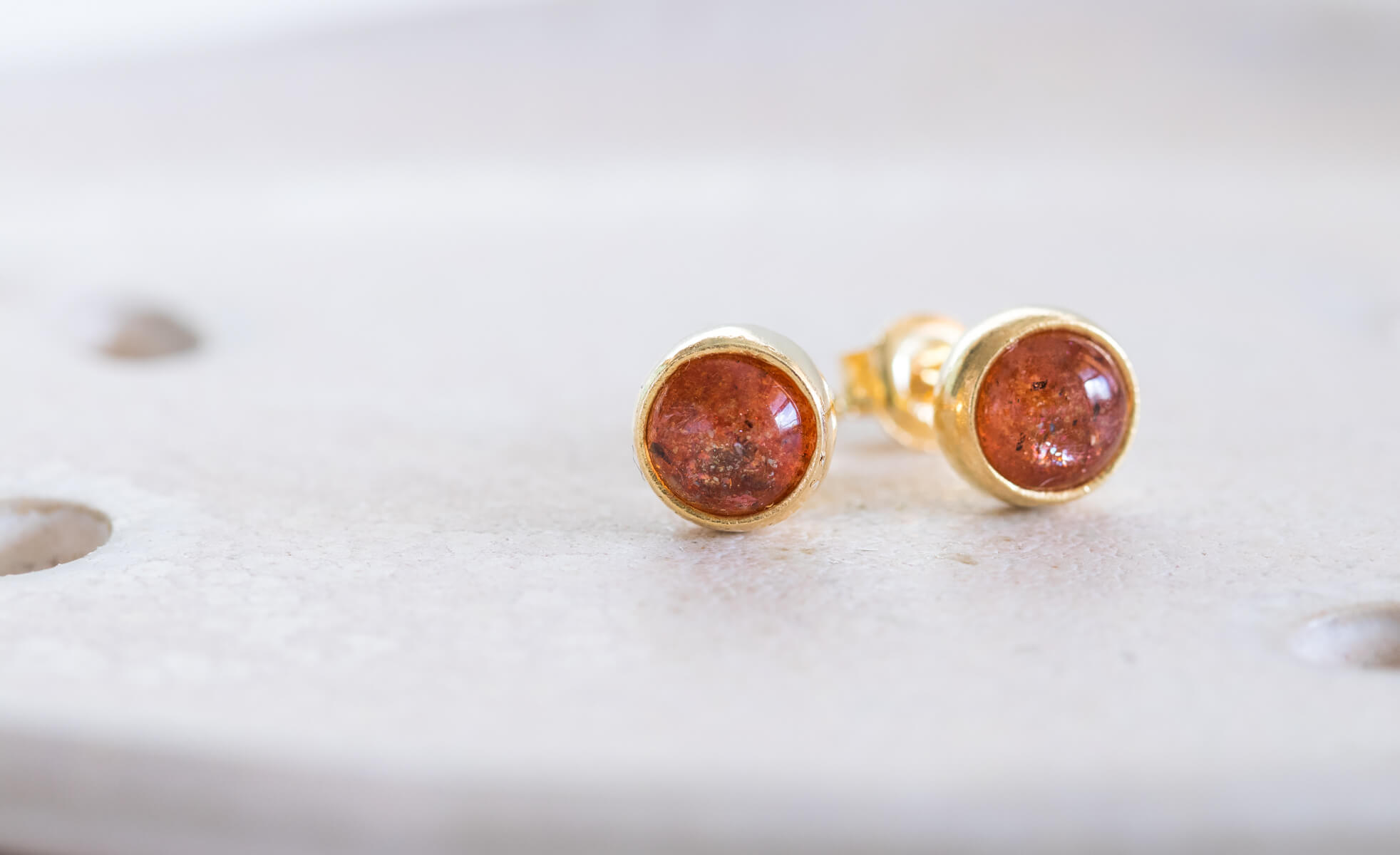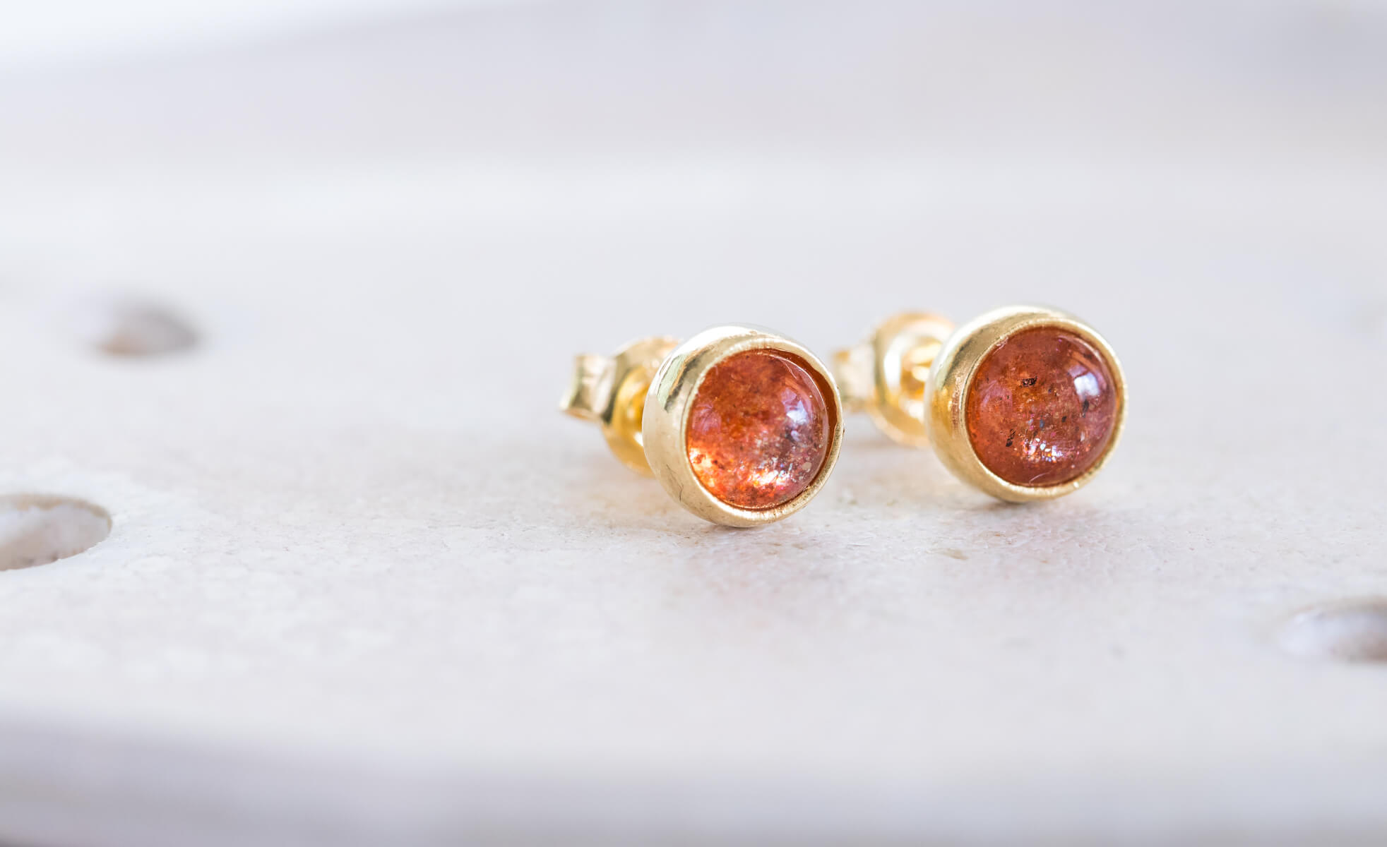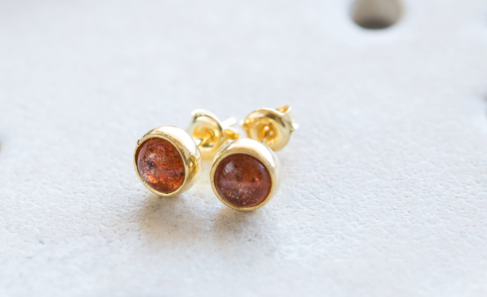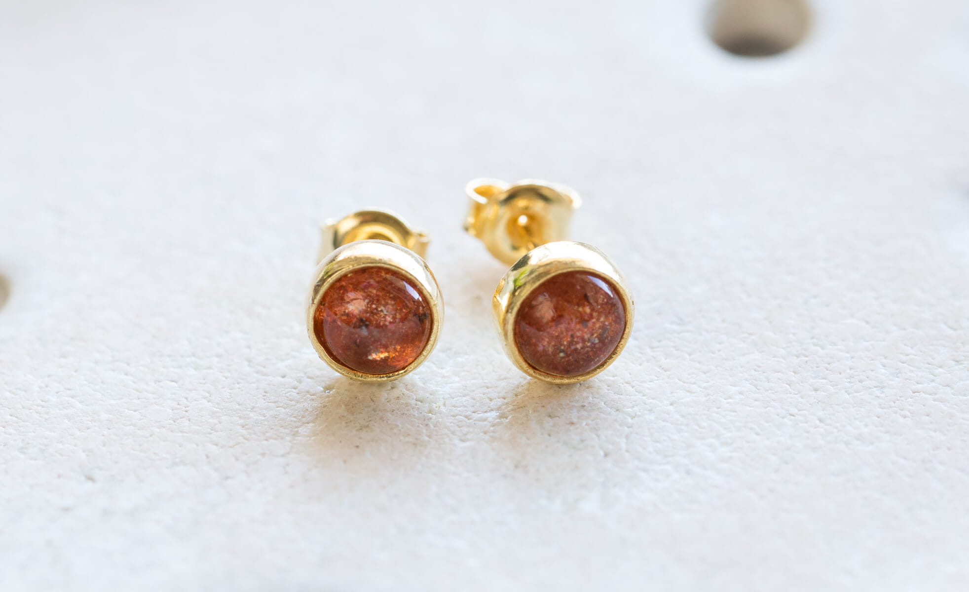 Kolczyki z kamieniem słonecznym 6mm w oprawie srebrnej p.925 pokrytej 24k złotem.