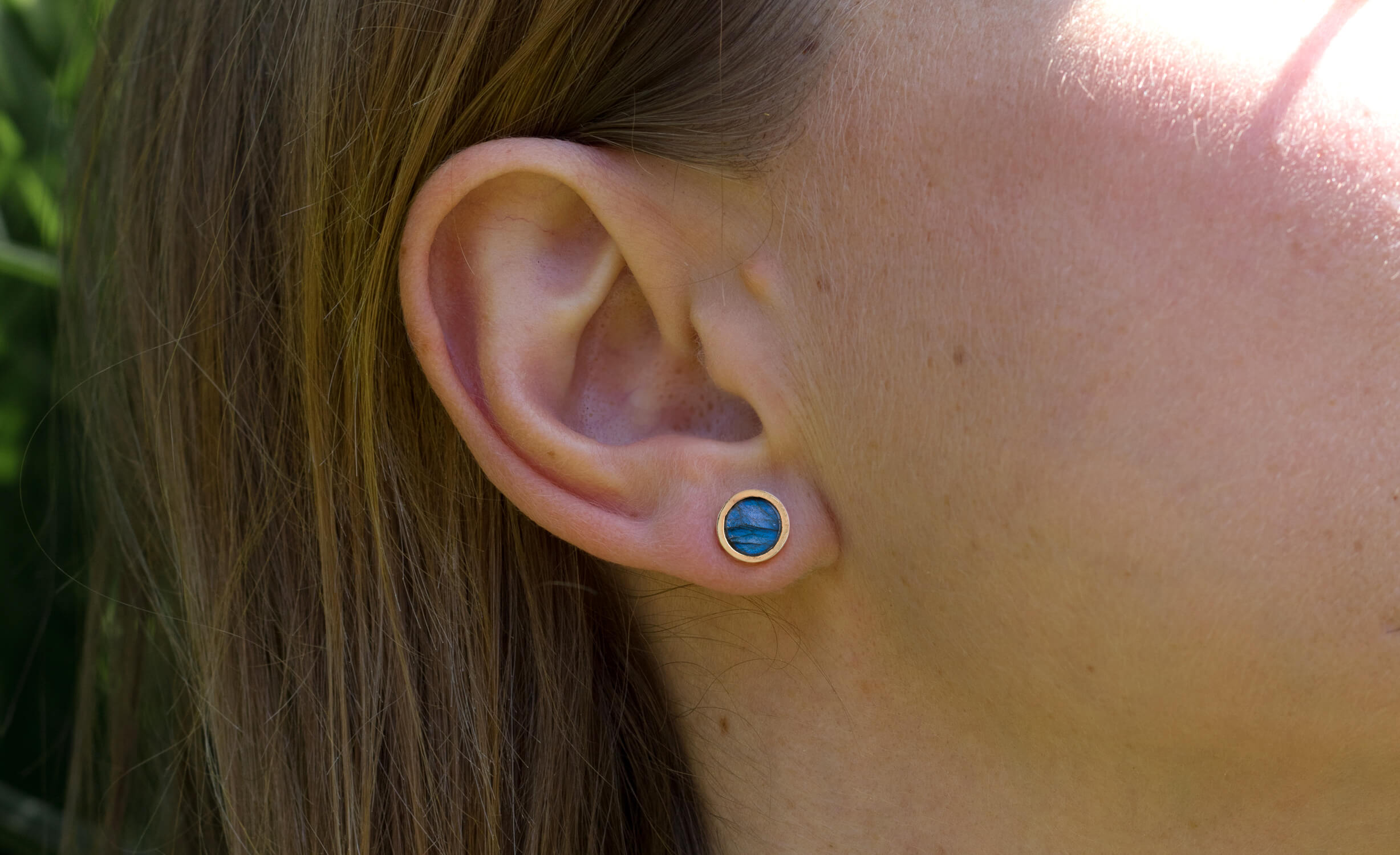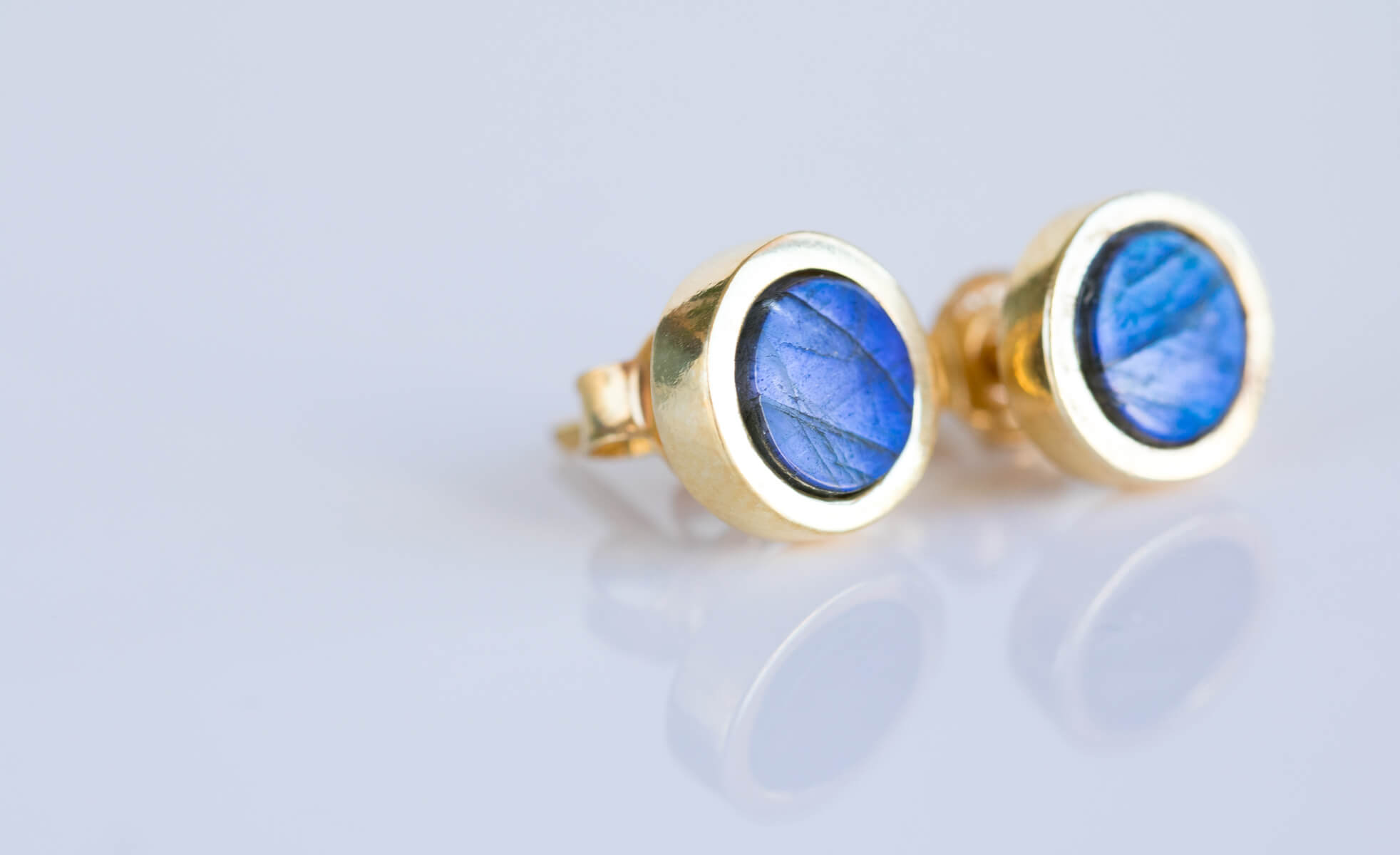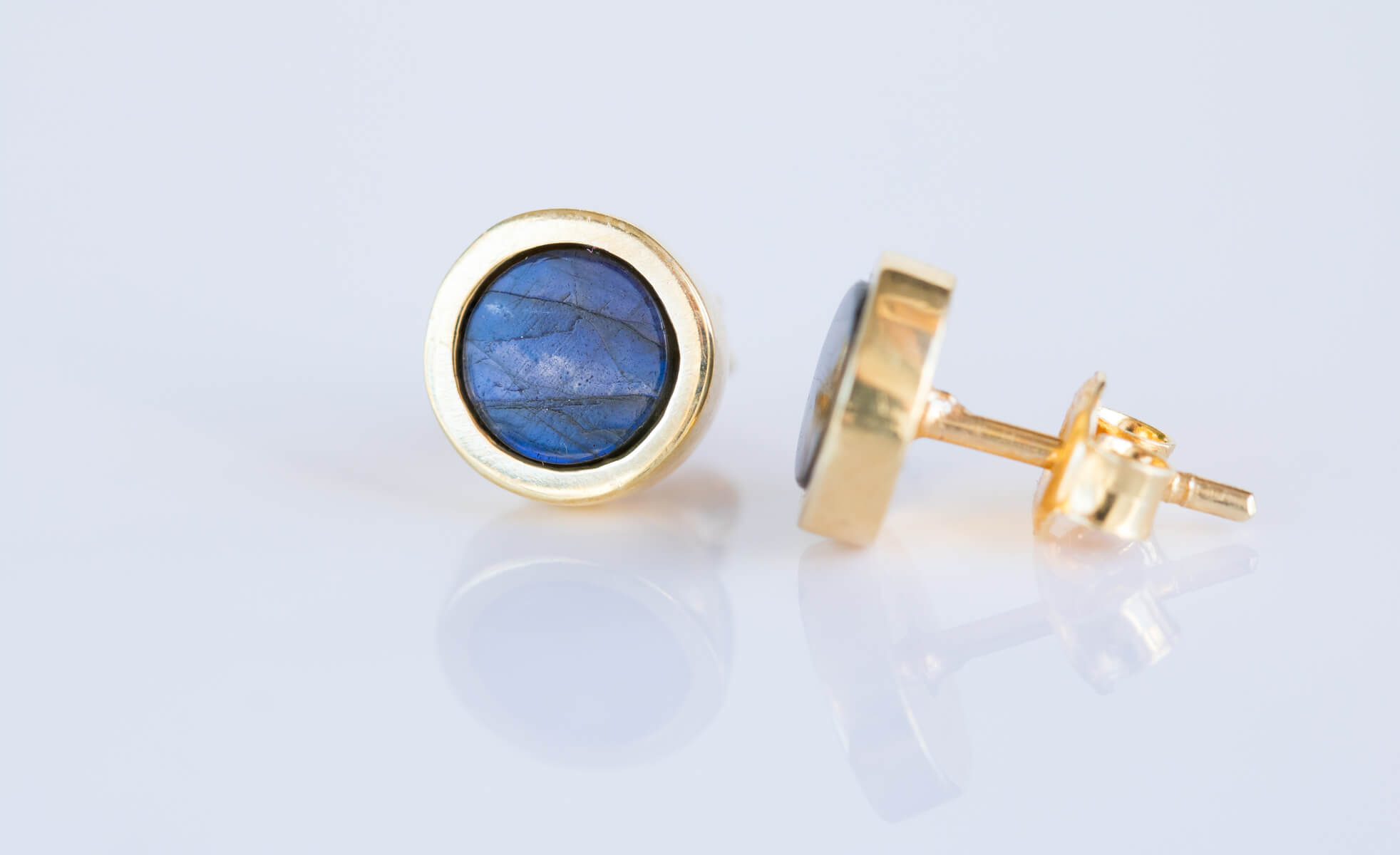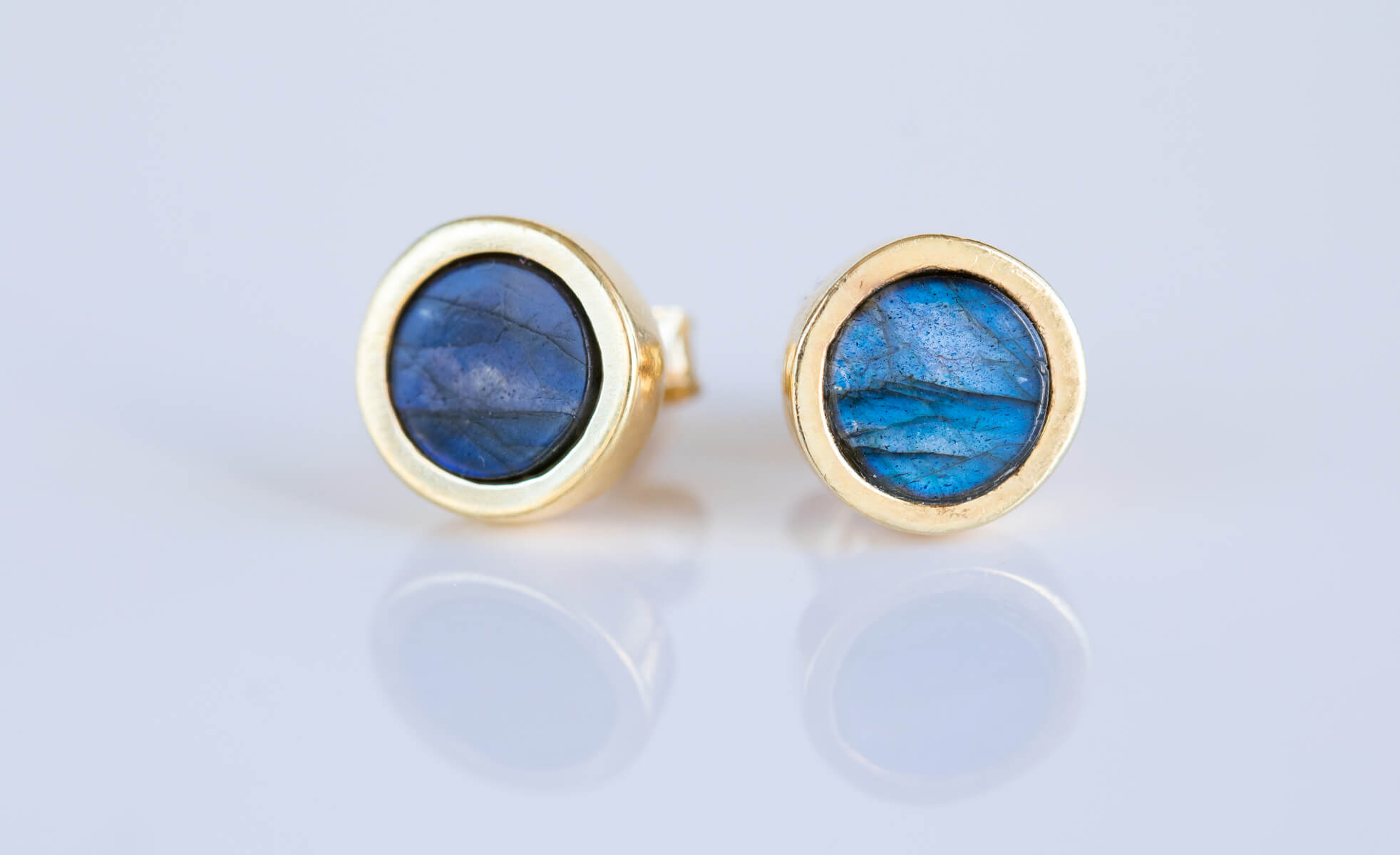 Kolczyki z labradorytem 6mm w oprawie srebrnej p.925 pokrytej 24k złotem.