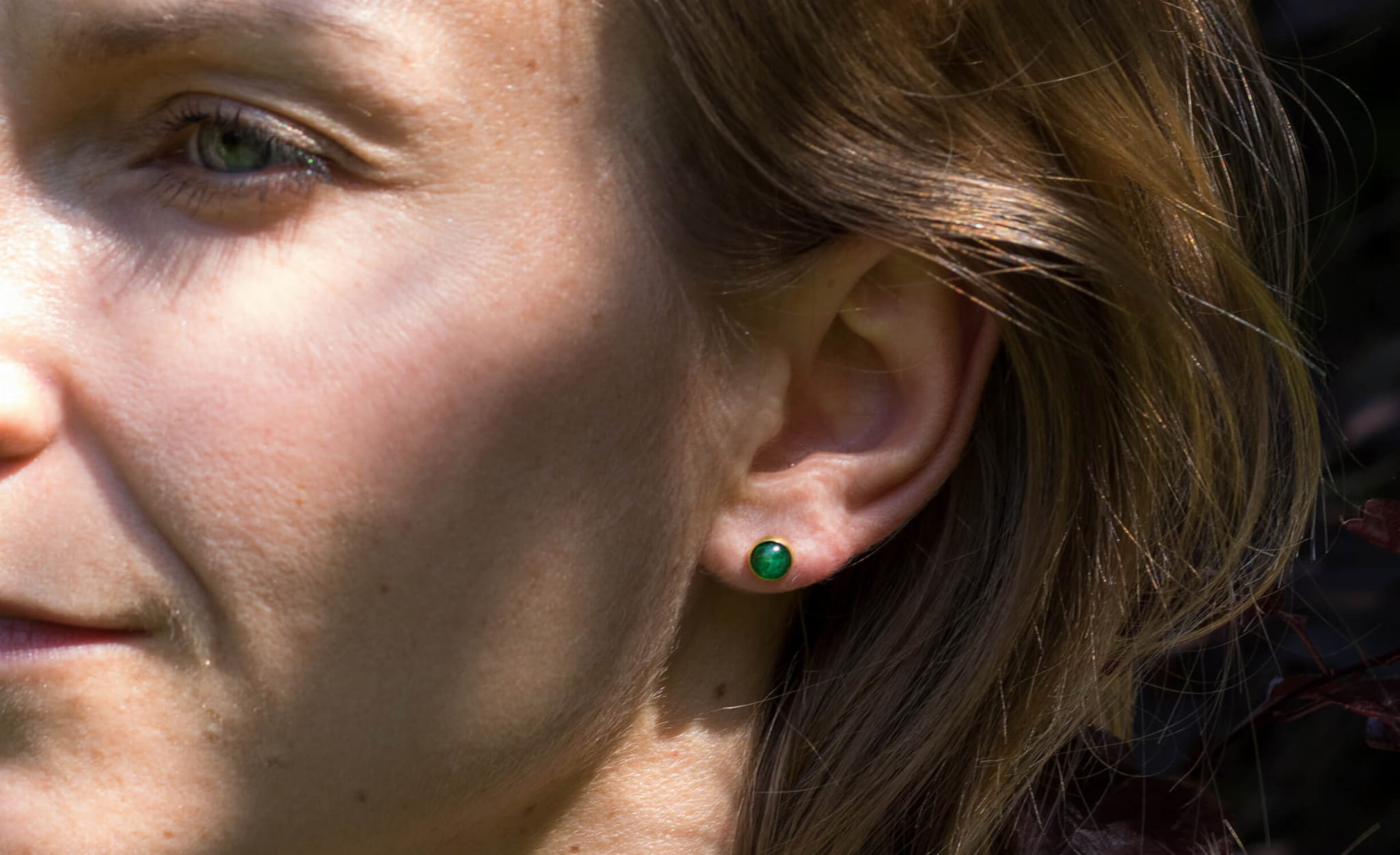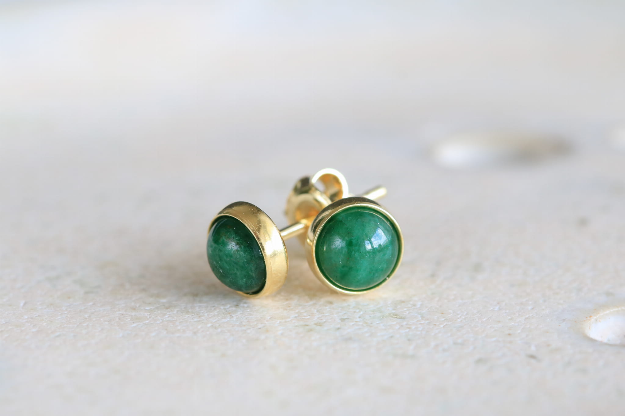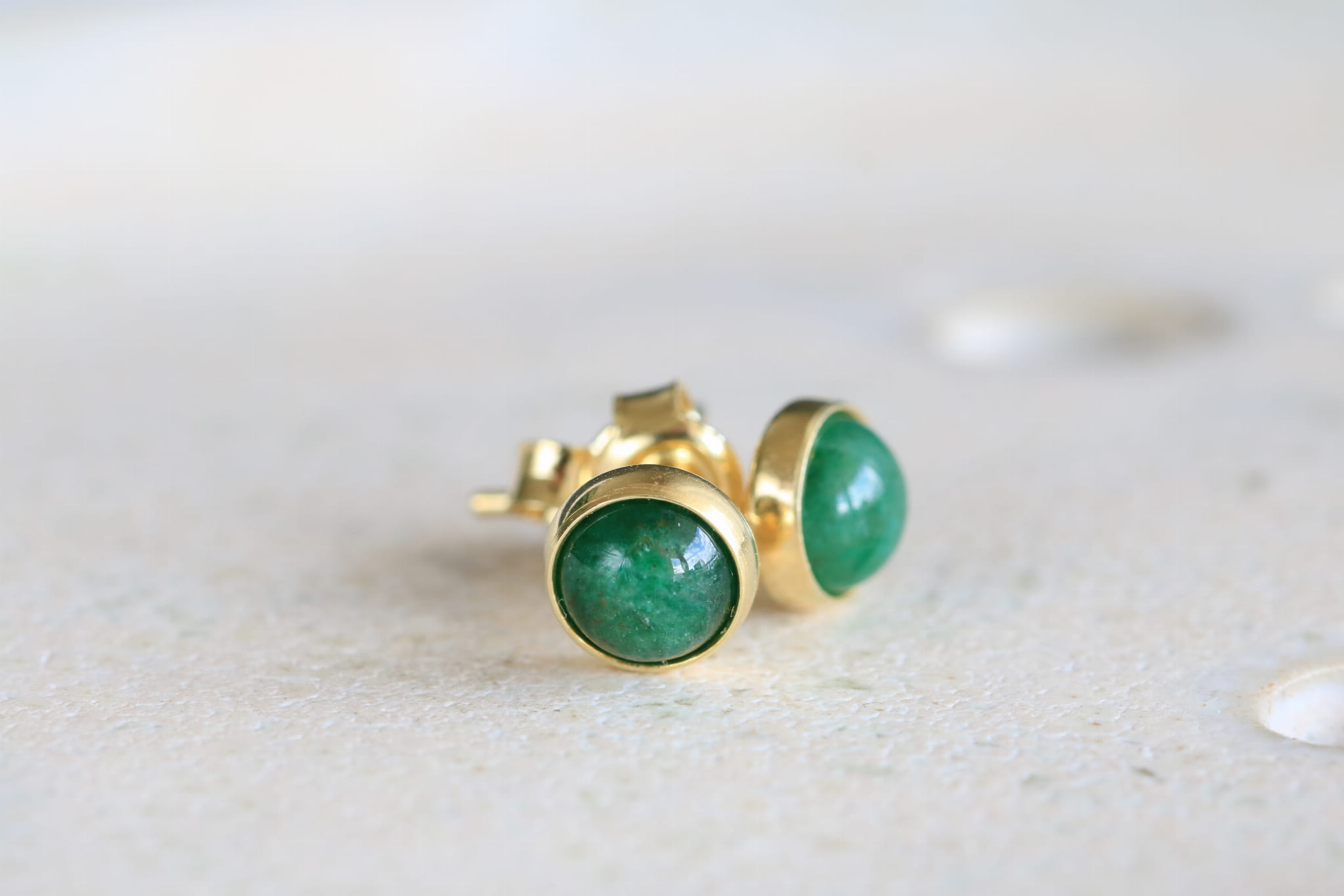 Kolczyki z zielonym awenturynem 6mm w oprawie srebrnej p.925 pokrytej 24k złotem.