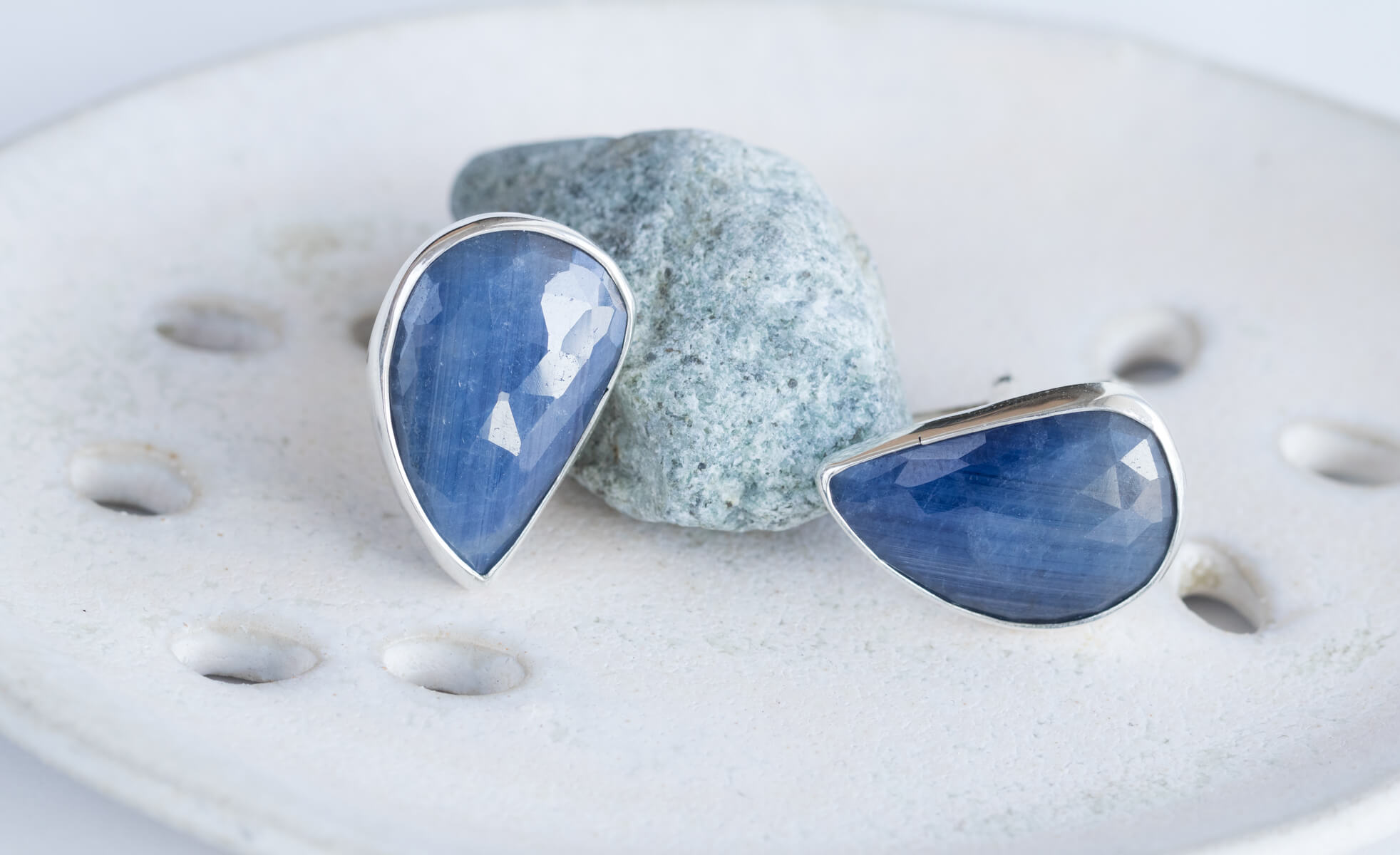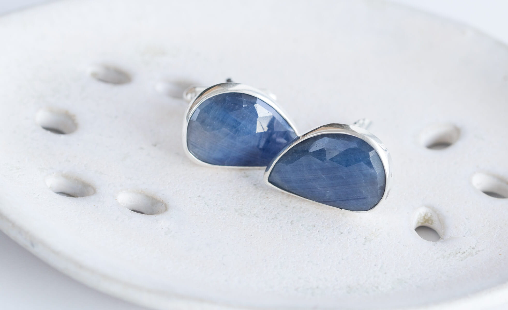Duże srebrne spinki do mankietów z naturalnym, szlachetnym, fasetowanym szafirem o wymiarach 15x24 mm.