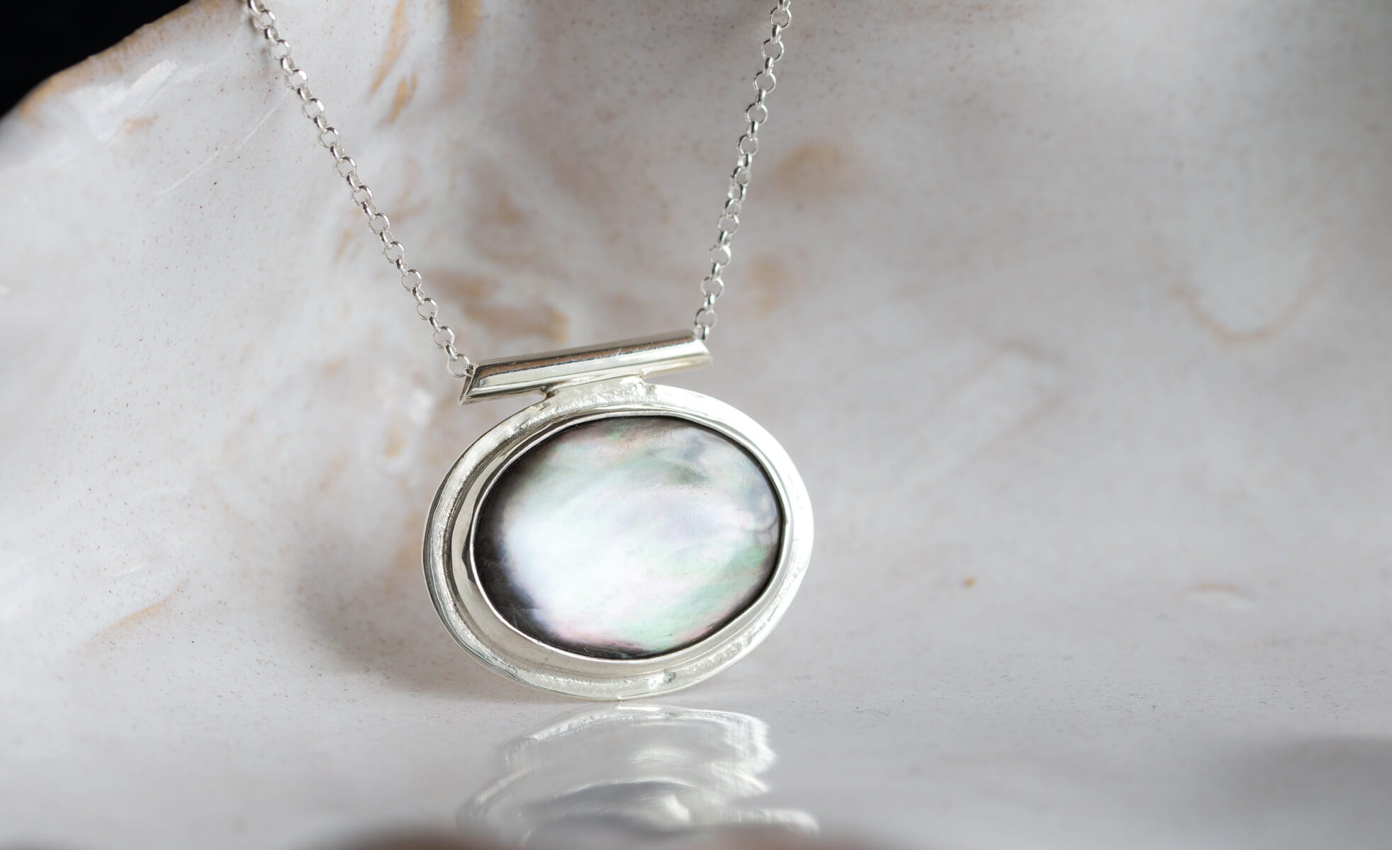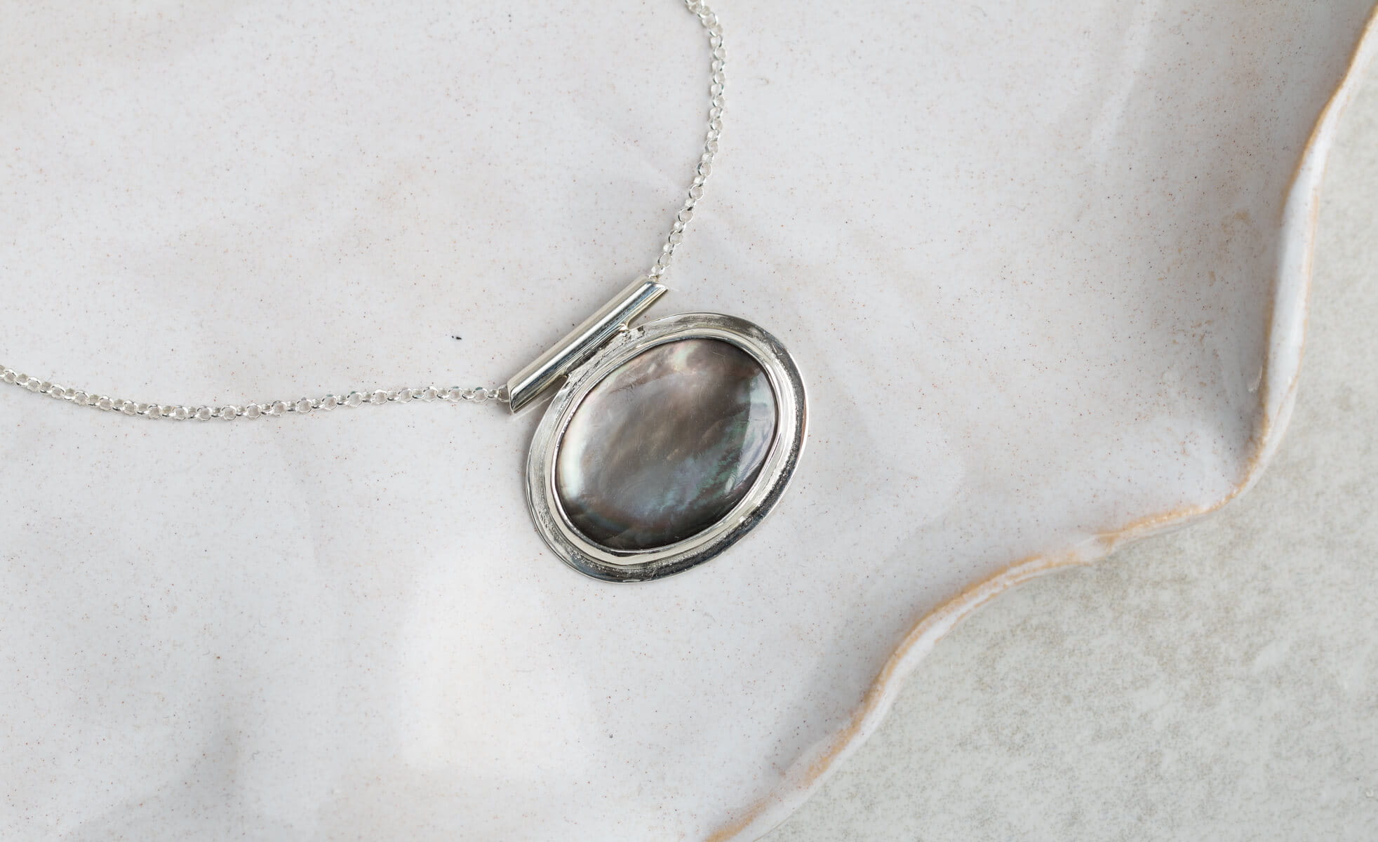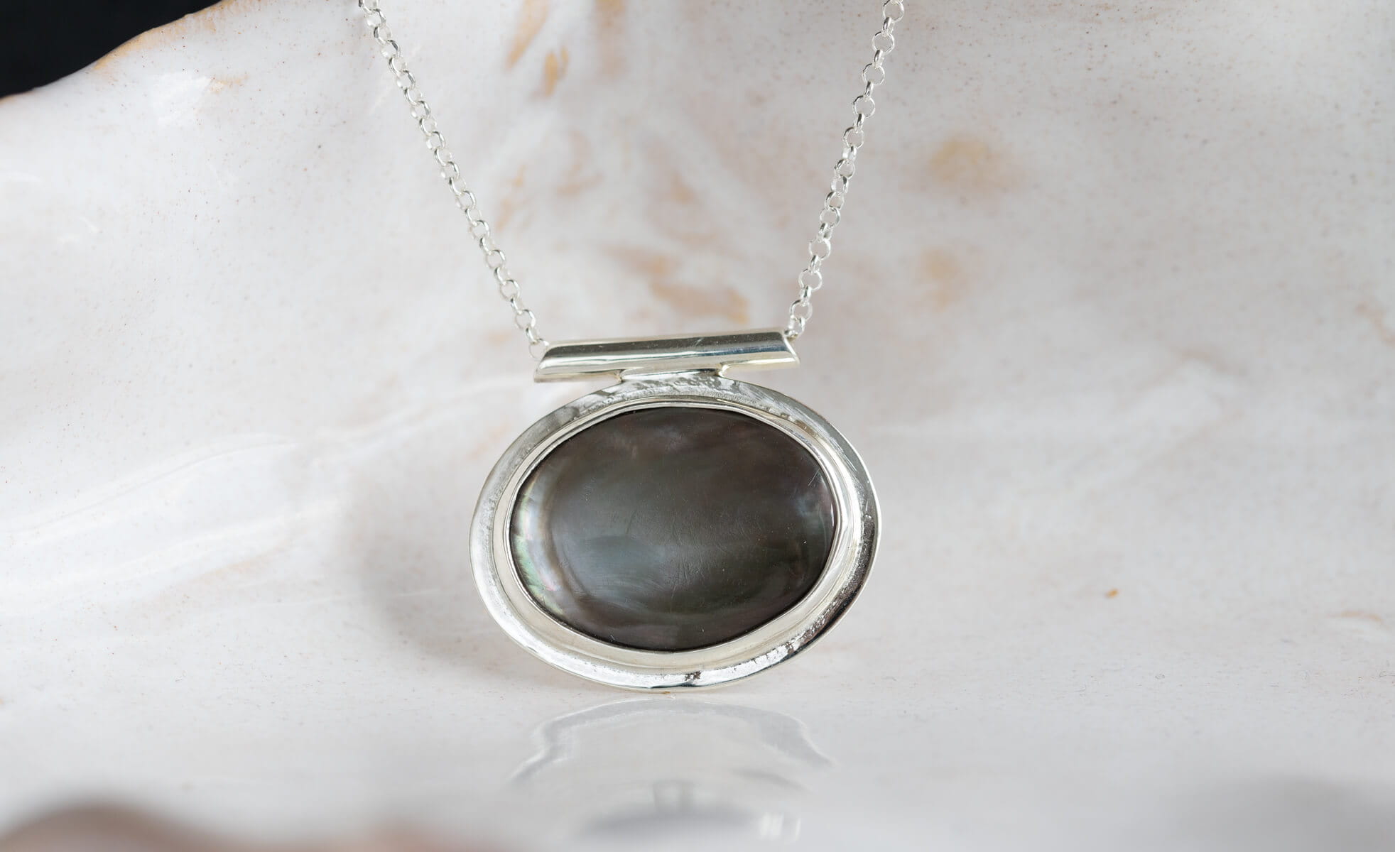 Naszyjnik z owalną czarną muszlą 14x19mm , w srebrnej oprawie p.925, jedyny egzemplarz.