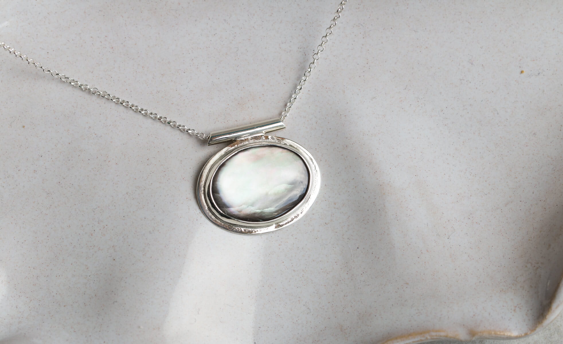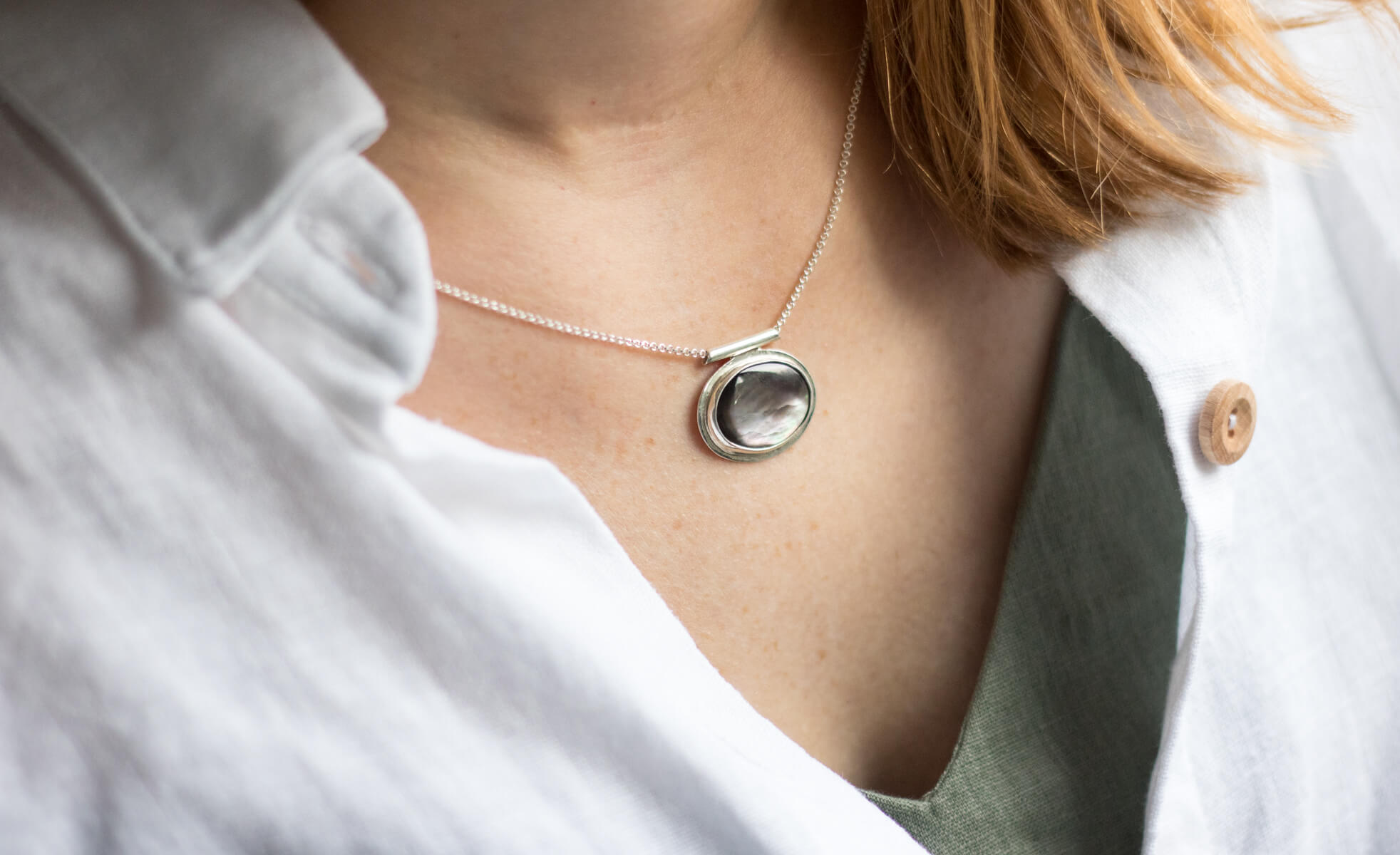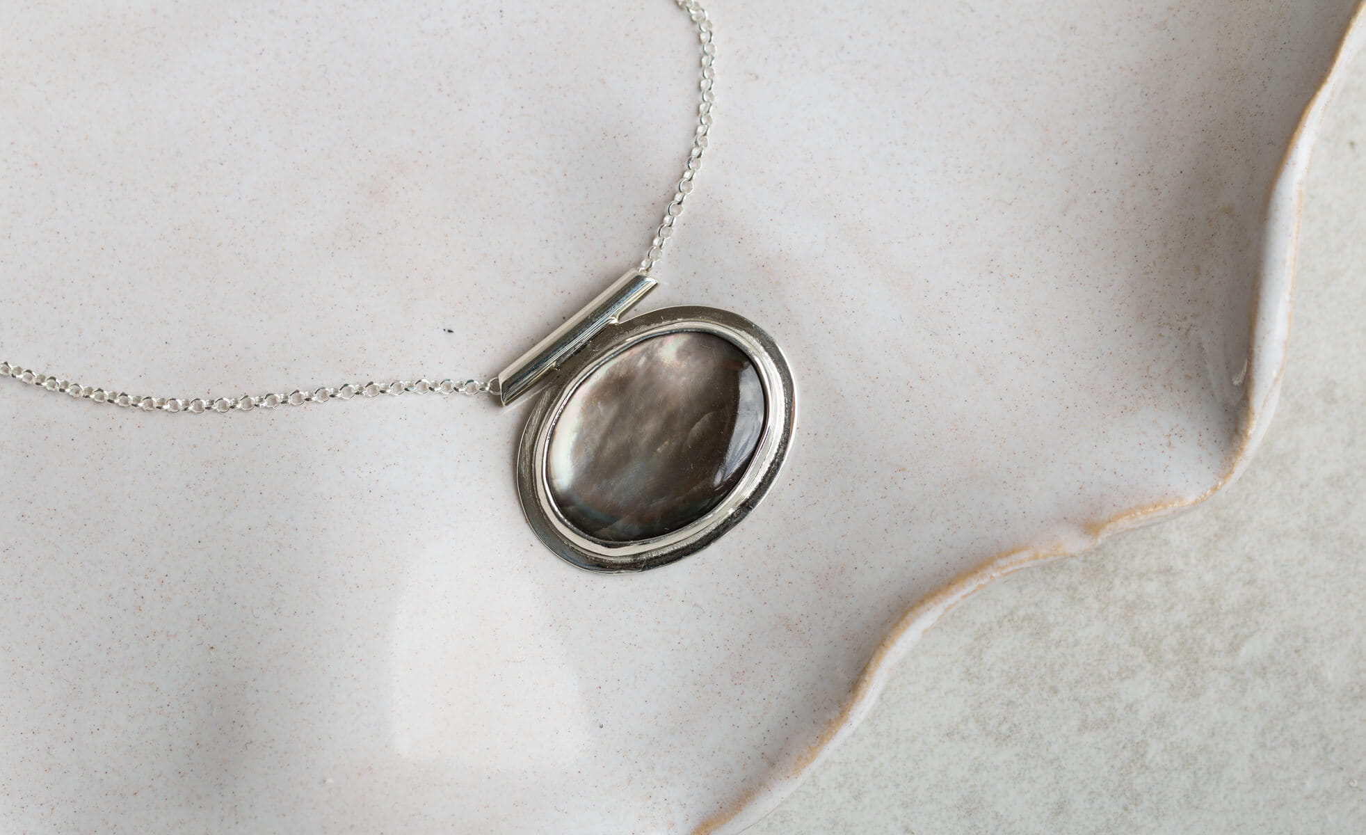 Naszyjnik z owalną czarną muszlą 14x19mm , w srebrnej oprawie p.925, jedyny egzemplarz.