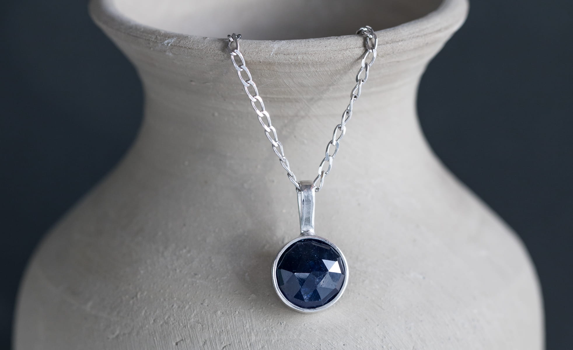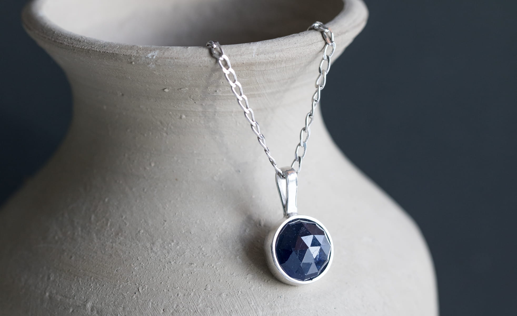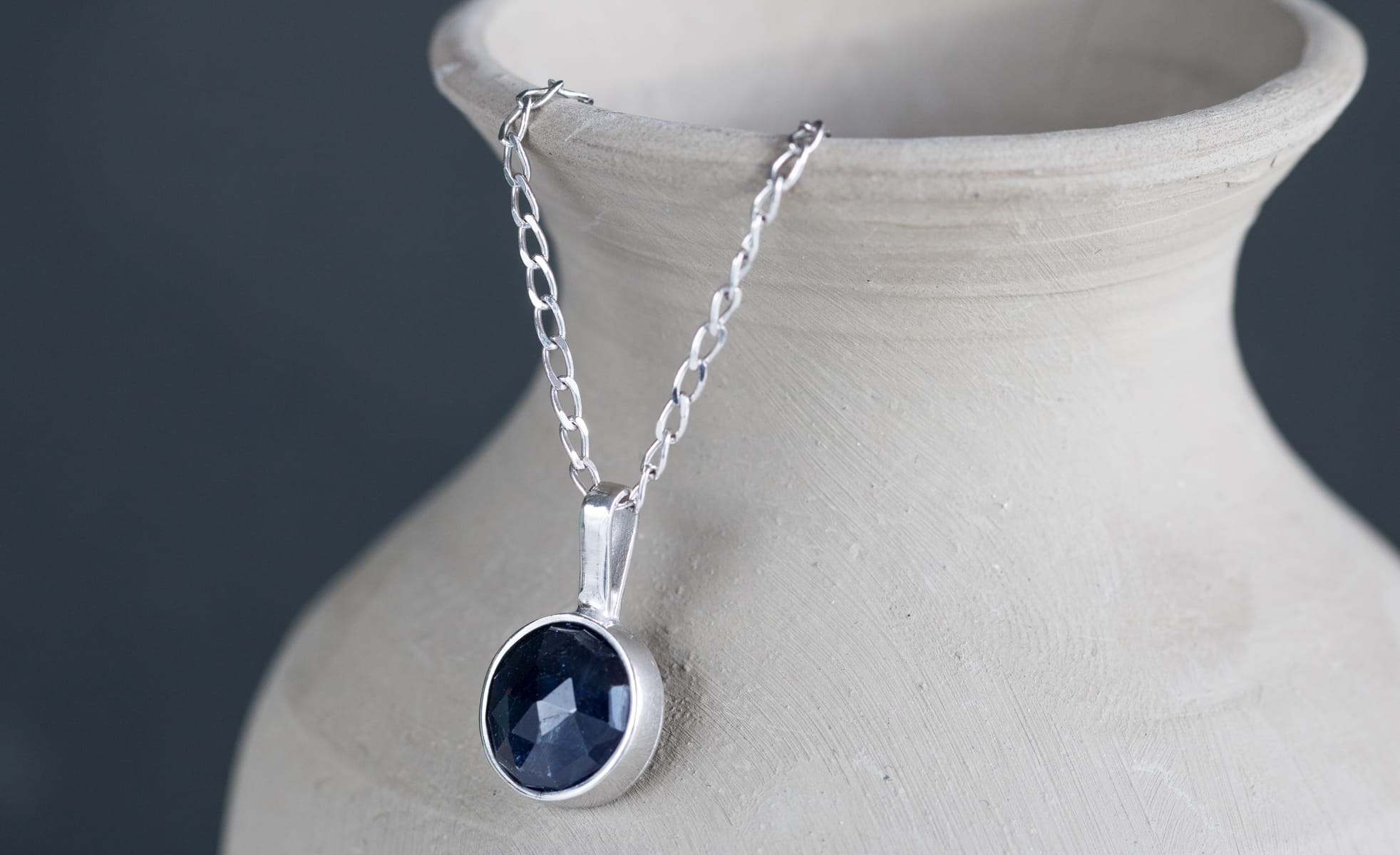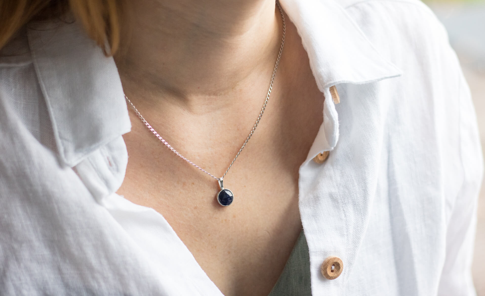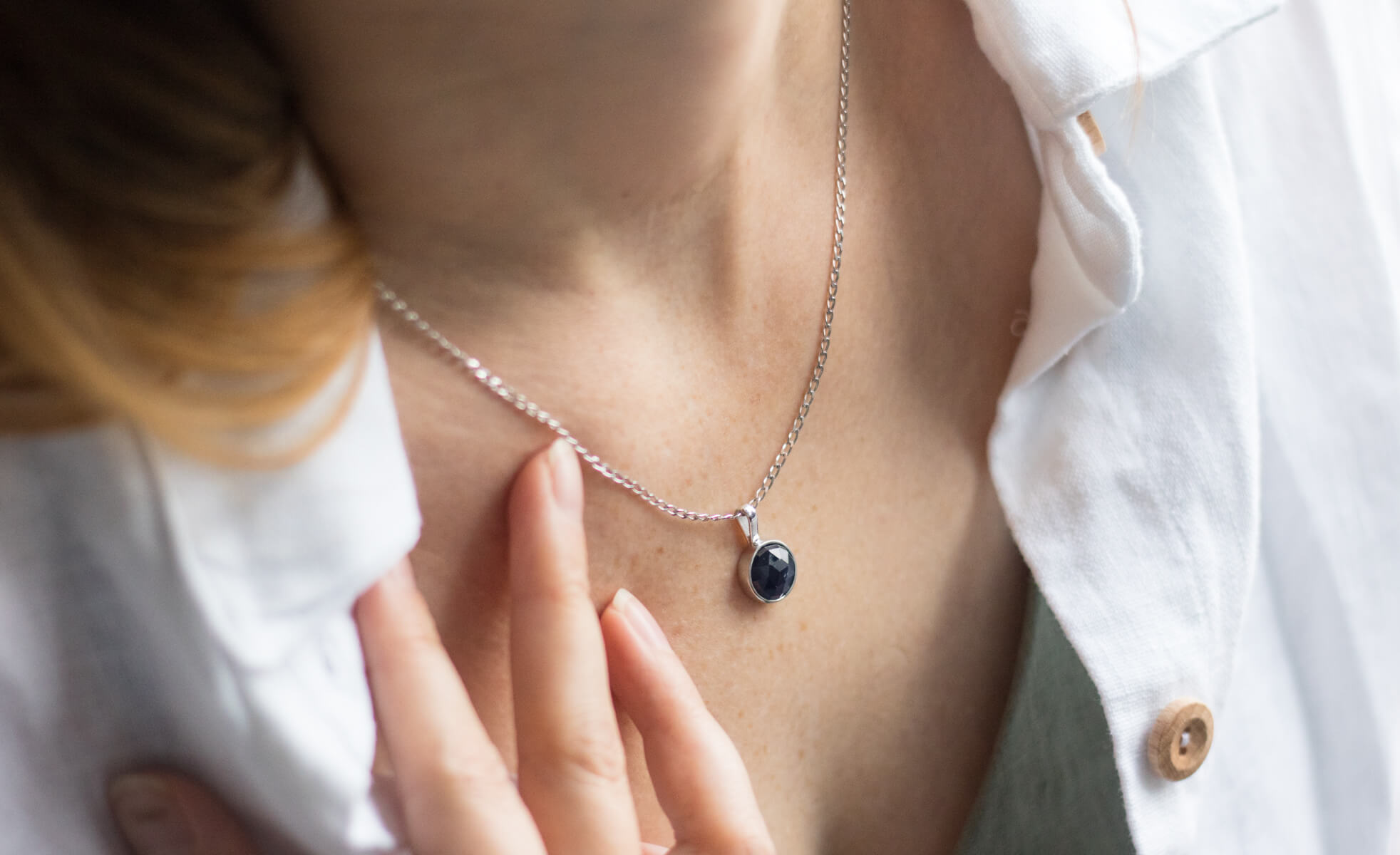 Naszyjnik z fasetowanym szafirem (ciemny granat), średnica zawieszki: 10,7mm w srebrnej oprawie p.925.