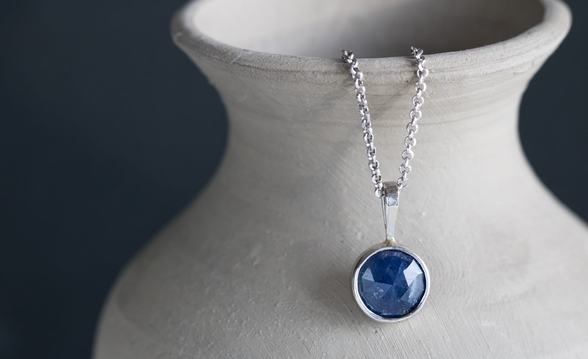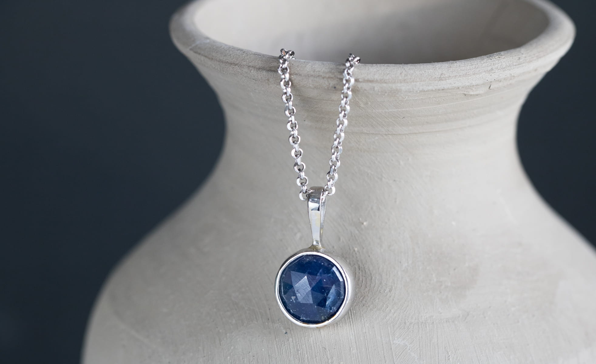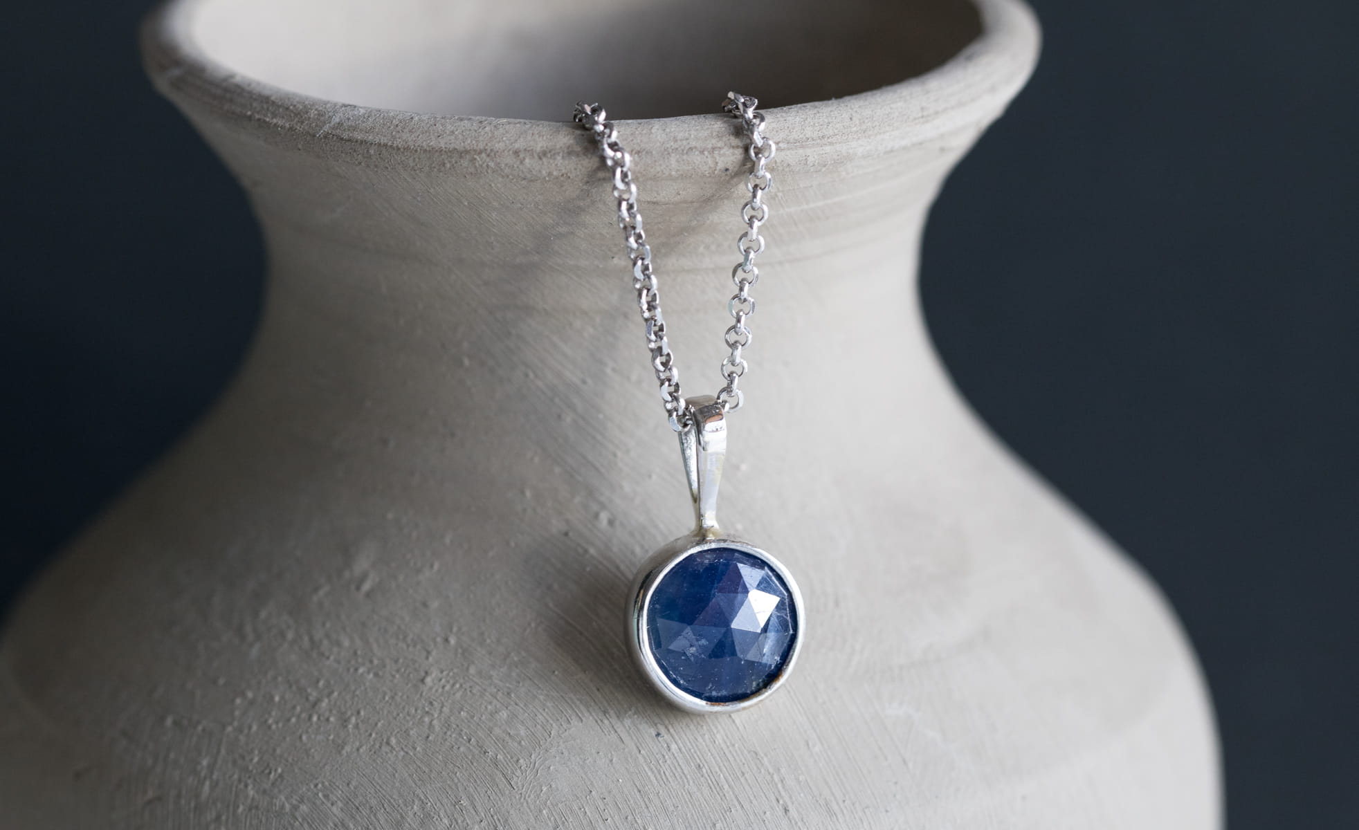 Naszyjnik z fasetowanym szafirem, średnica zawieszki: 10,35mm w srebrnej oprawie p.925.