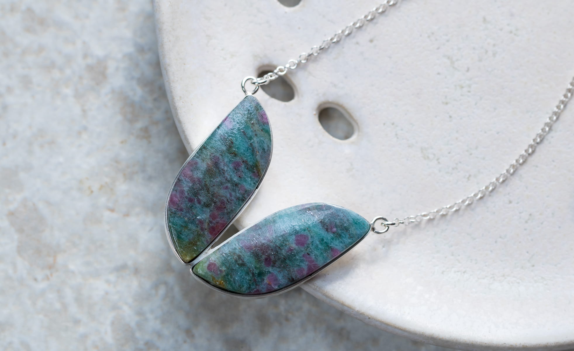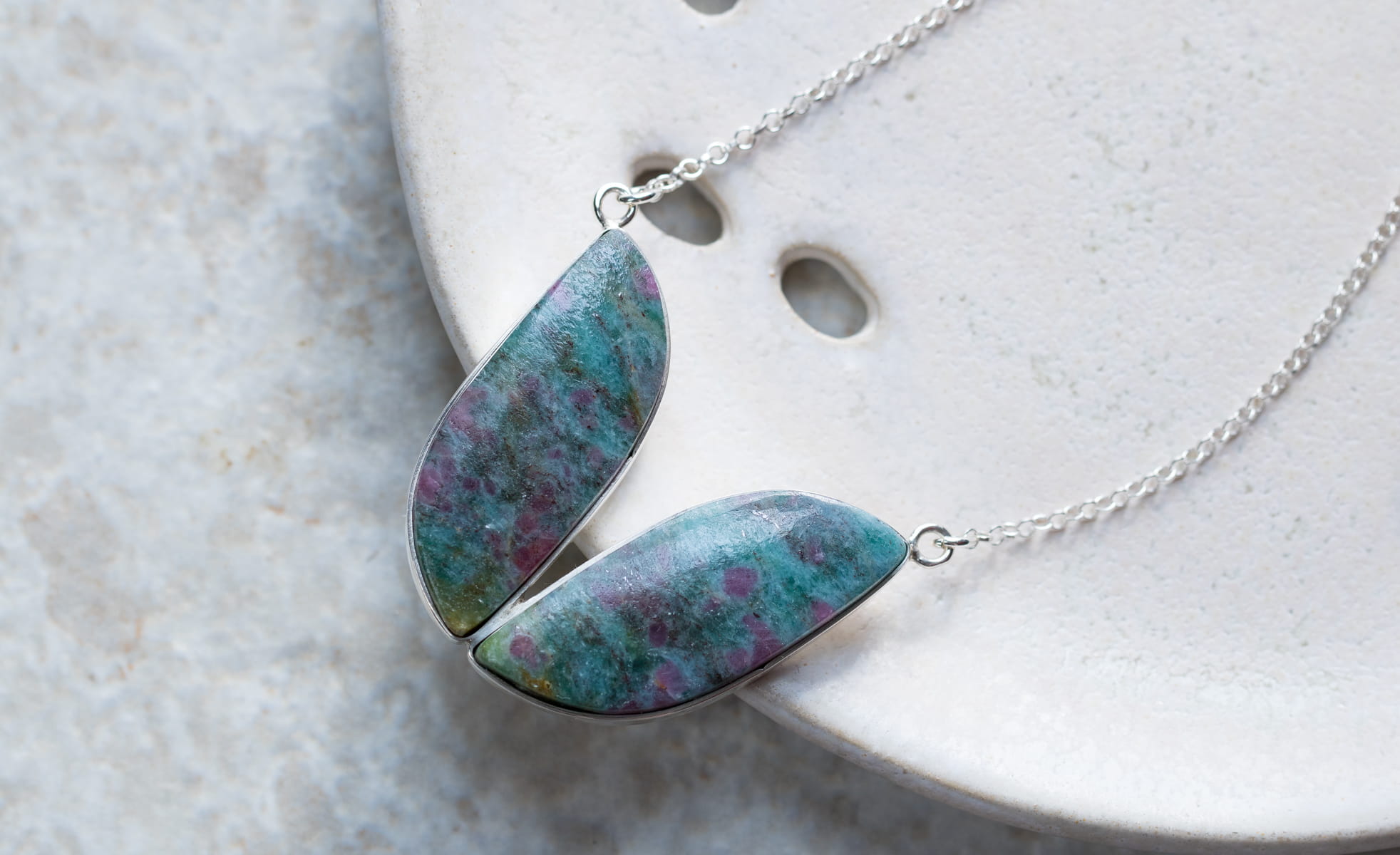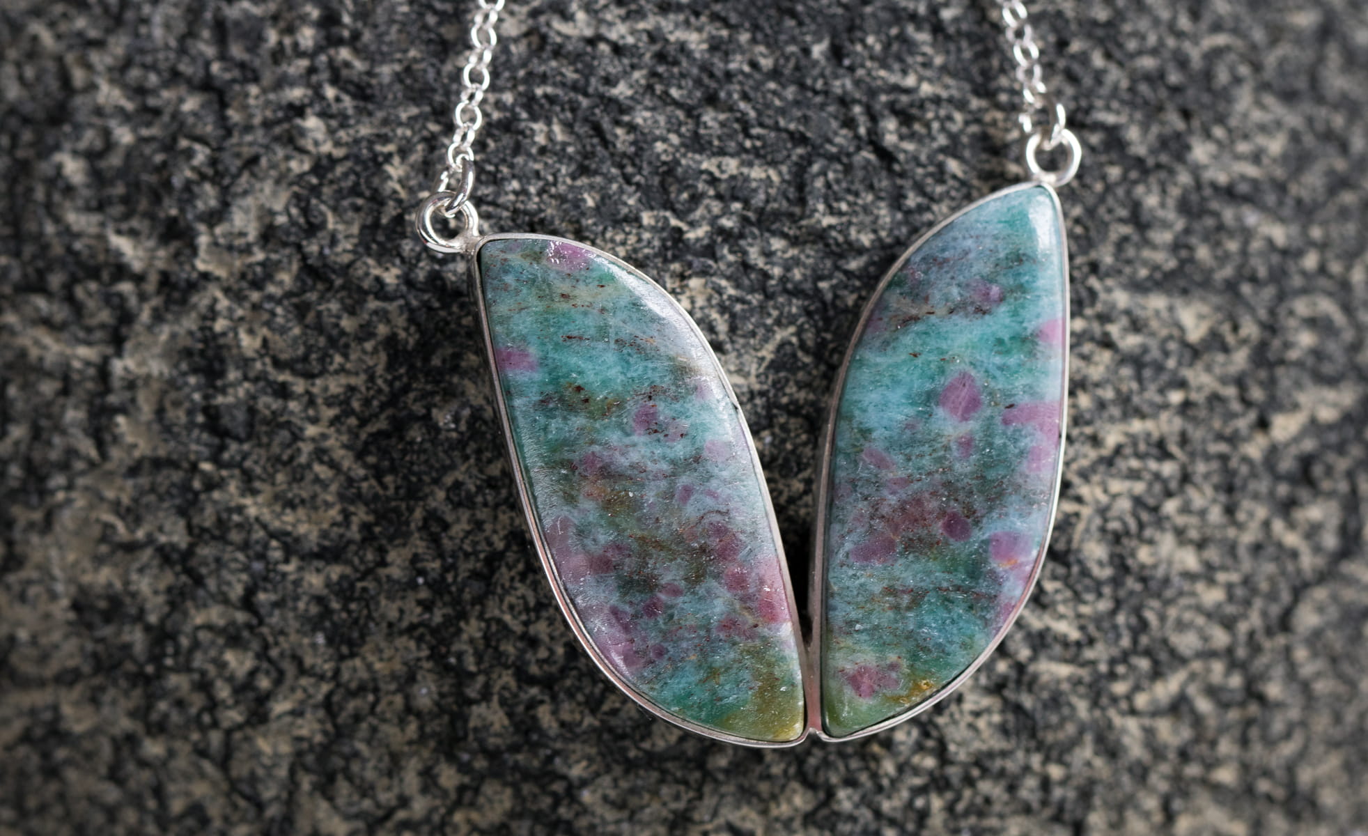 Niezwykły naszyjnik z kyanitami 32x35mm z inkluzjami rubinów w srebrnej oprawie p.925. Długość całkowita naszyjnika 50+5cm.