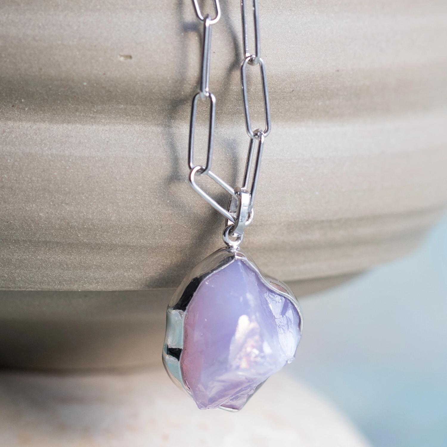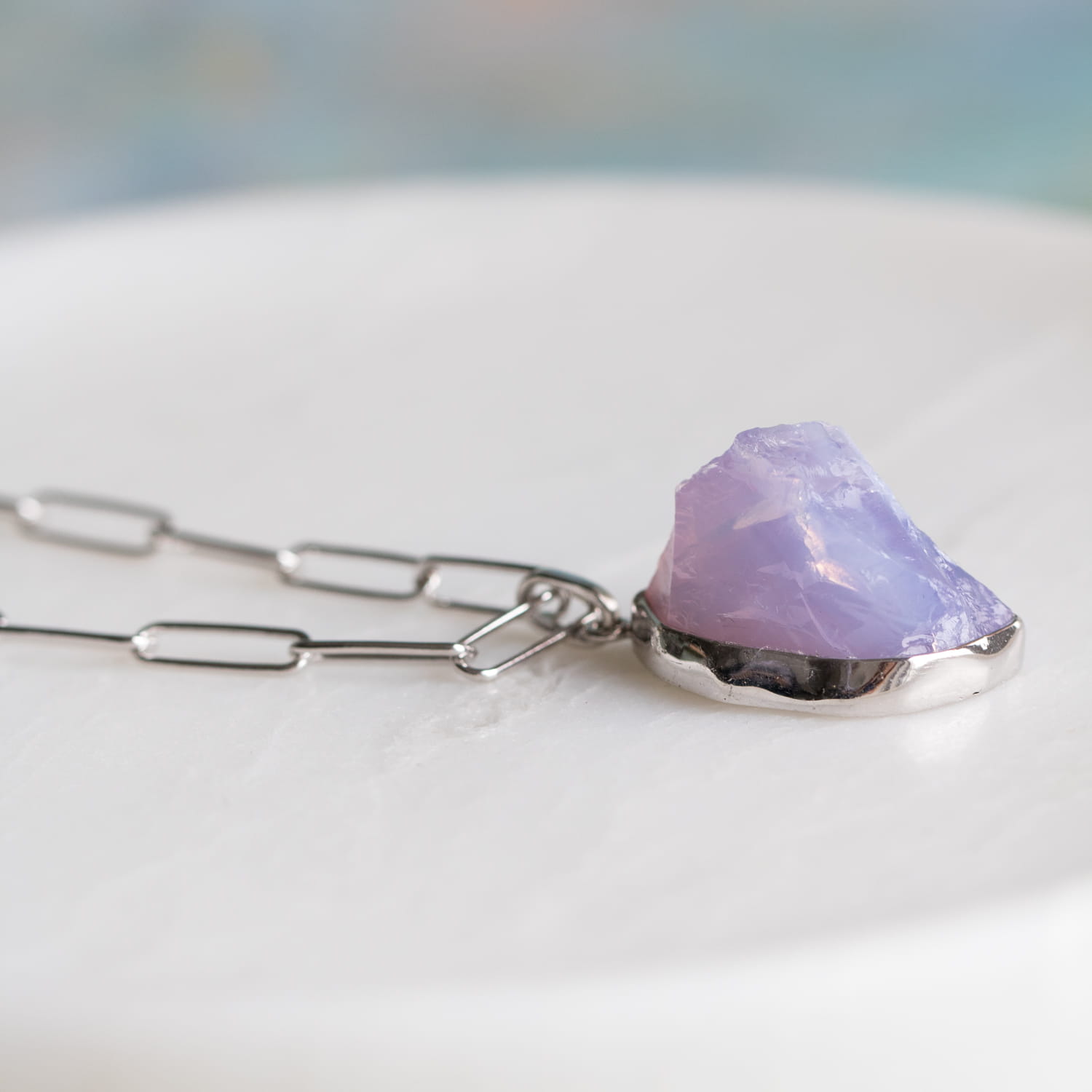Srebrny naszyjnik z surowym kwarcem lawendowym.
