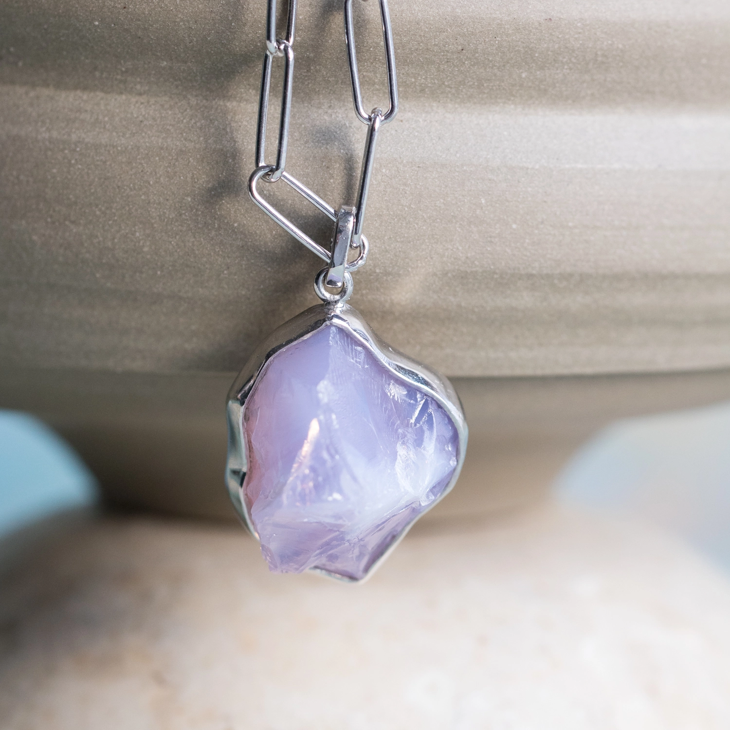 Srebrny naszyjnik z surowym kwarcem lawendowym. Naszyjnik z łańcuszkiem o dużych oczkach 3x10mm.