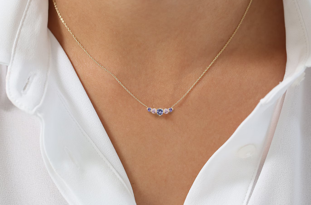 W centrum błyszczy tanzanit o średnicy 3 mm – kamień o zmysłowym, chłodnym odcieniu niebieskofioletowym, przywodzącym na myśl niebo tuż przed świtem. Po jego bokach znajdują się dwa różowe szafiry (2,5 mm), delikatne jak światło rozpraszające się na horyzoncie, oraz dwa najmniejsze ametysty (2 mm), które zamykają kompozycję subtelną nutą cienia i spokoju.