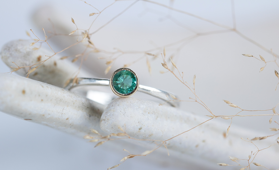 Pierścionek z morskim turmalinem w złocie, ze srebrną obrączką P261