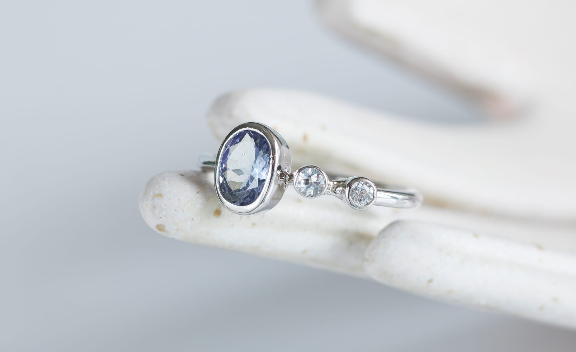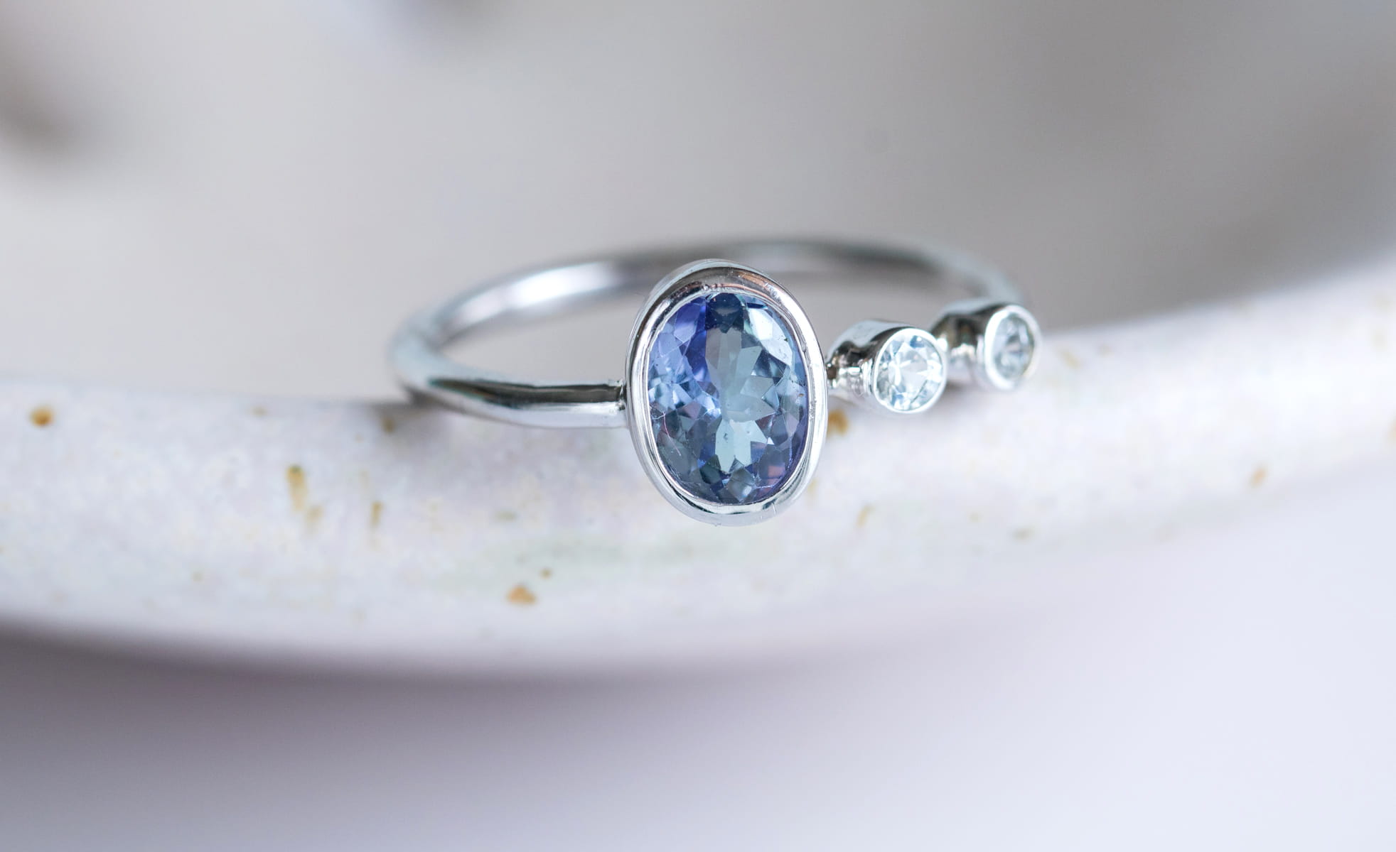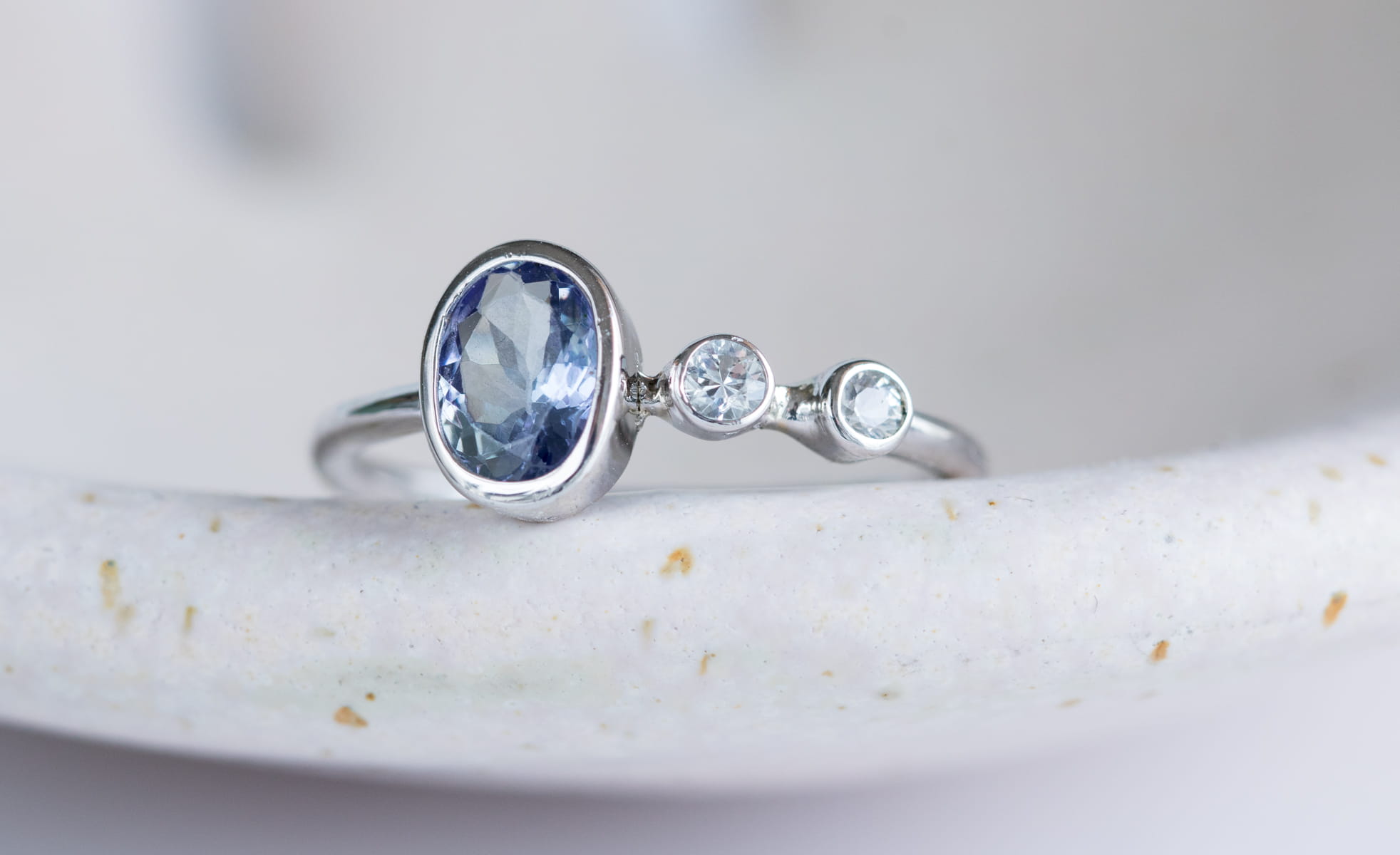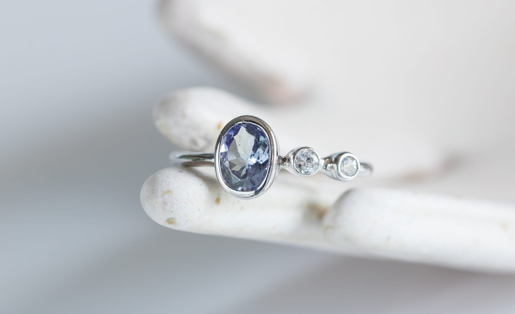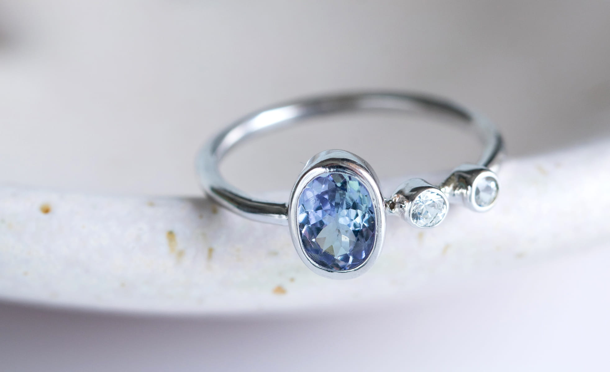Kamienie: tanzanit fasetowany 5x7 mm i 2x biały szafir 2,5mm w szlifie brylantowym