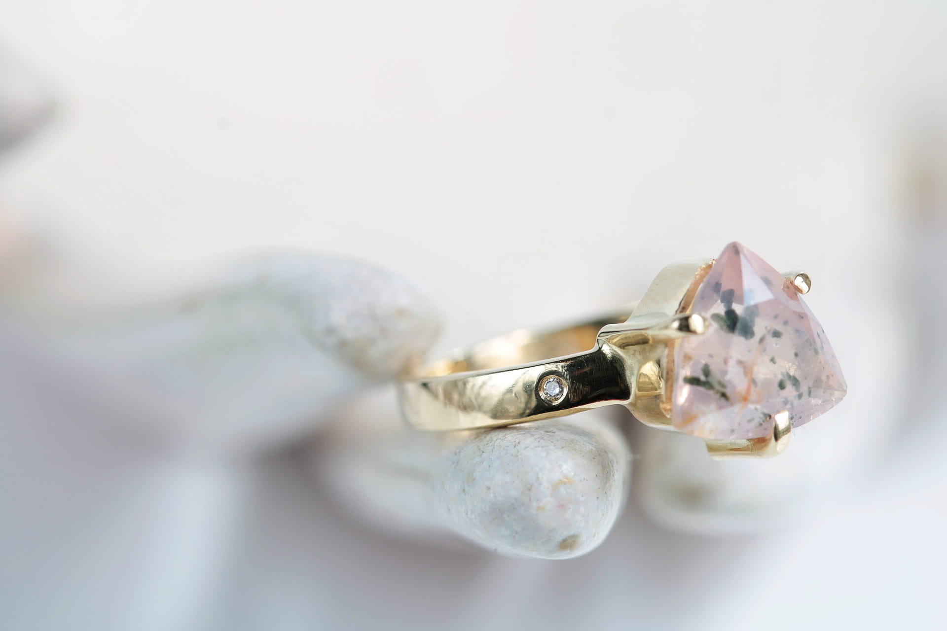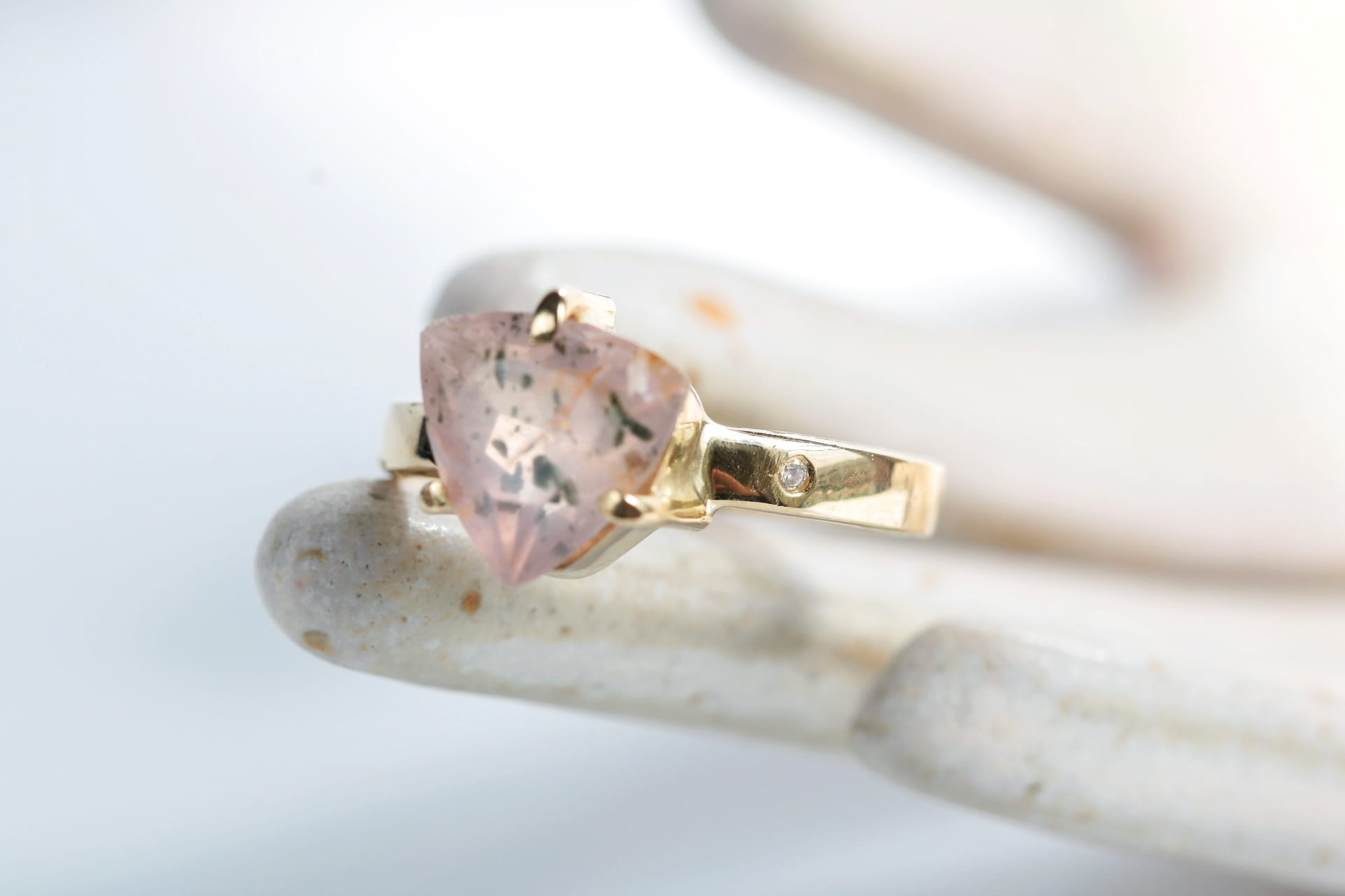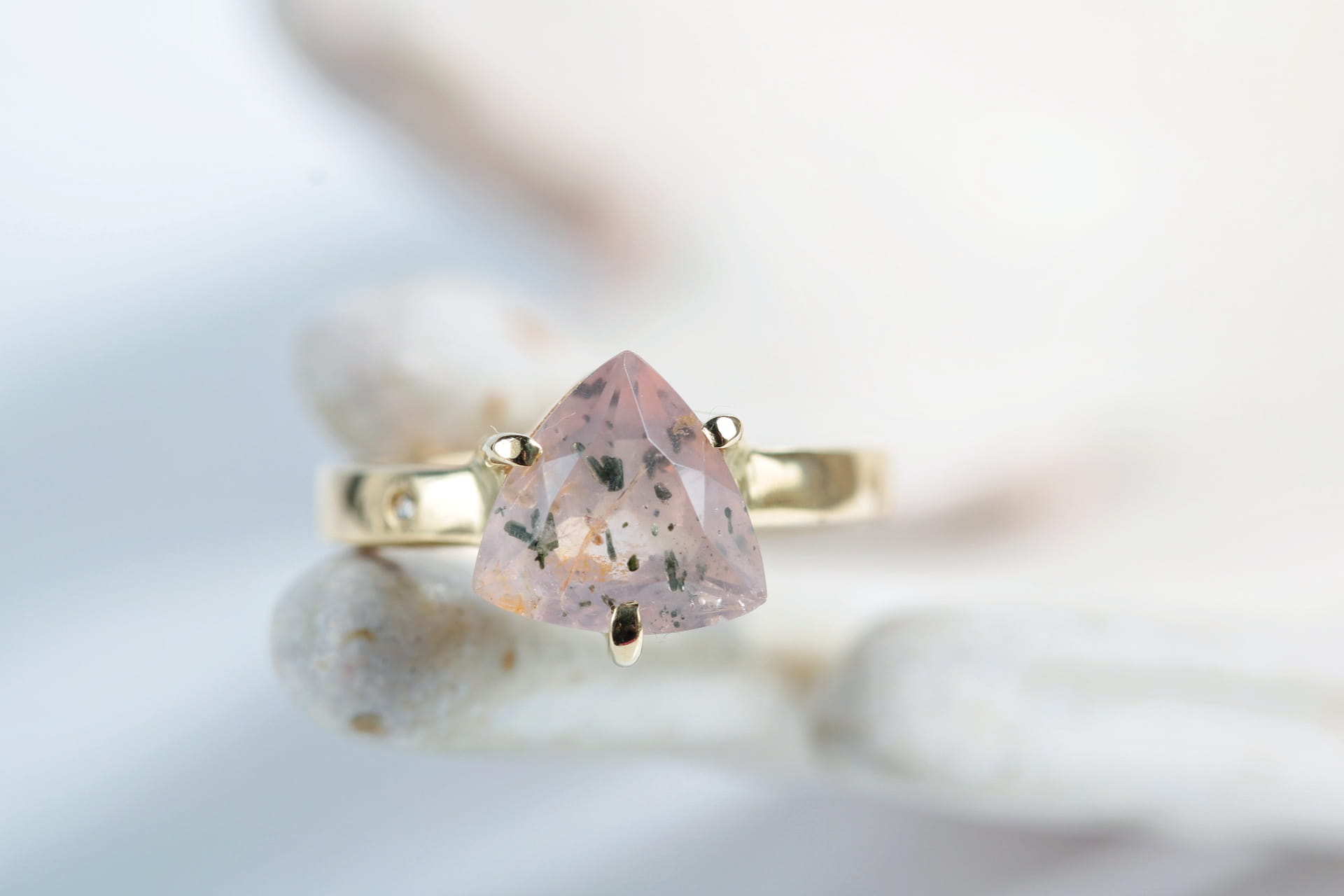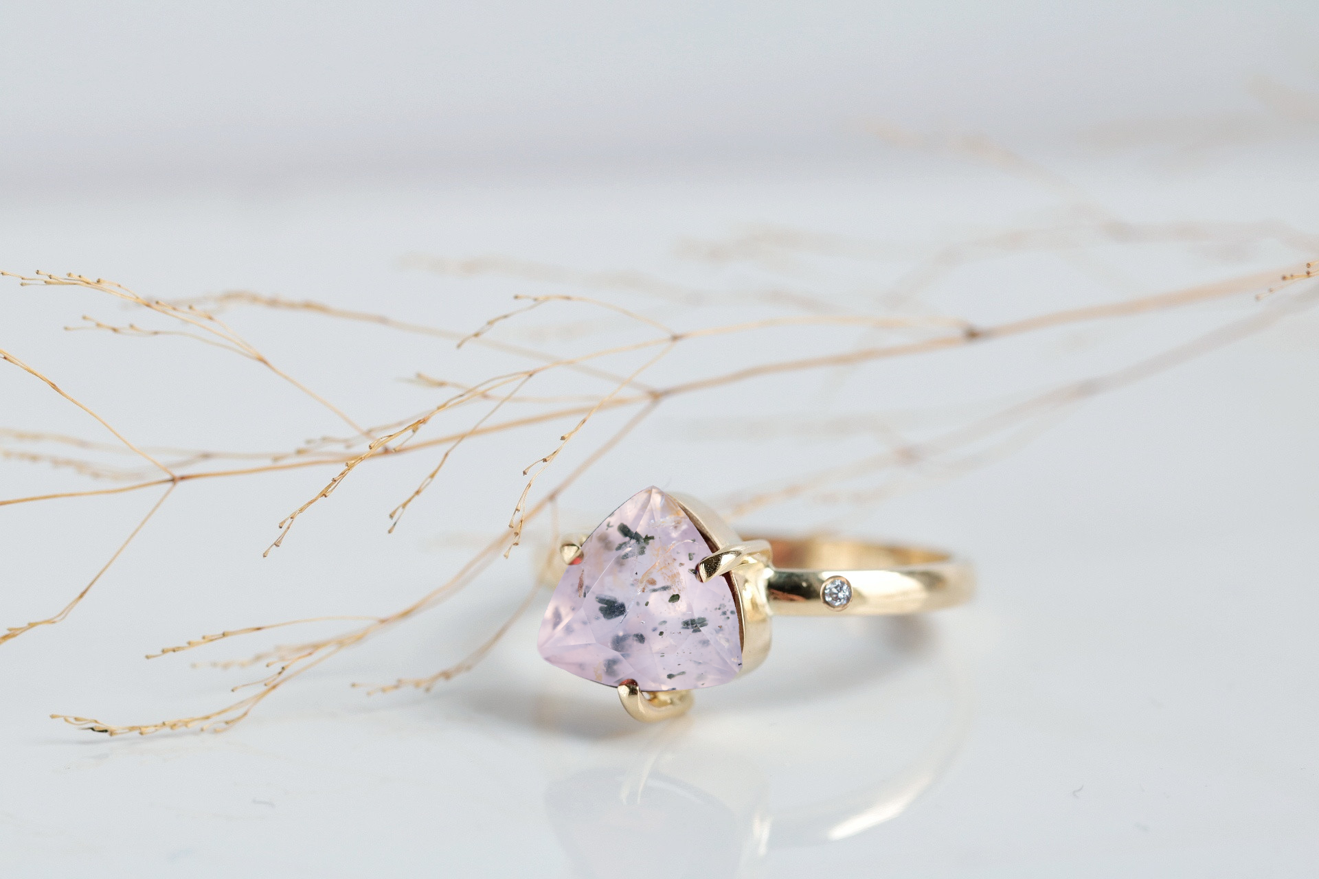 Kamienie: trójkątny kwarc różowy z diopsydem o boku 8,8mm oraz brylantem 1mm w obrączce
