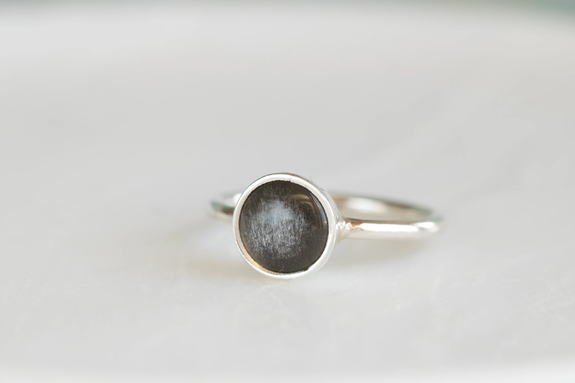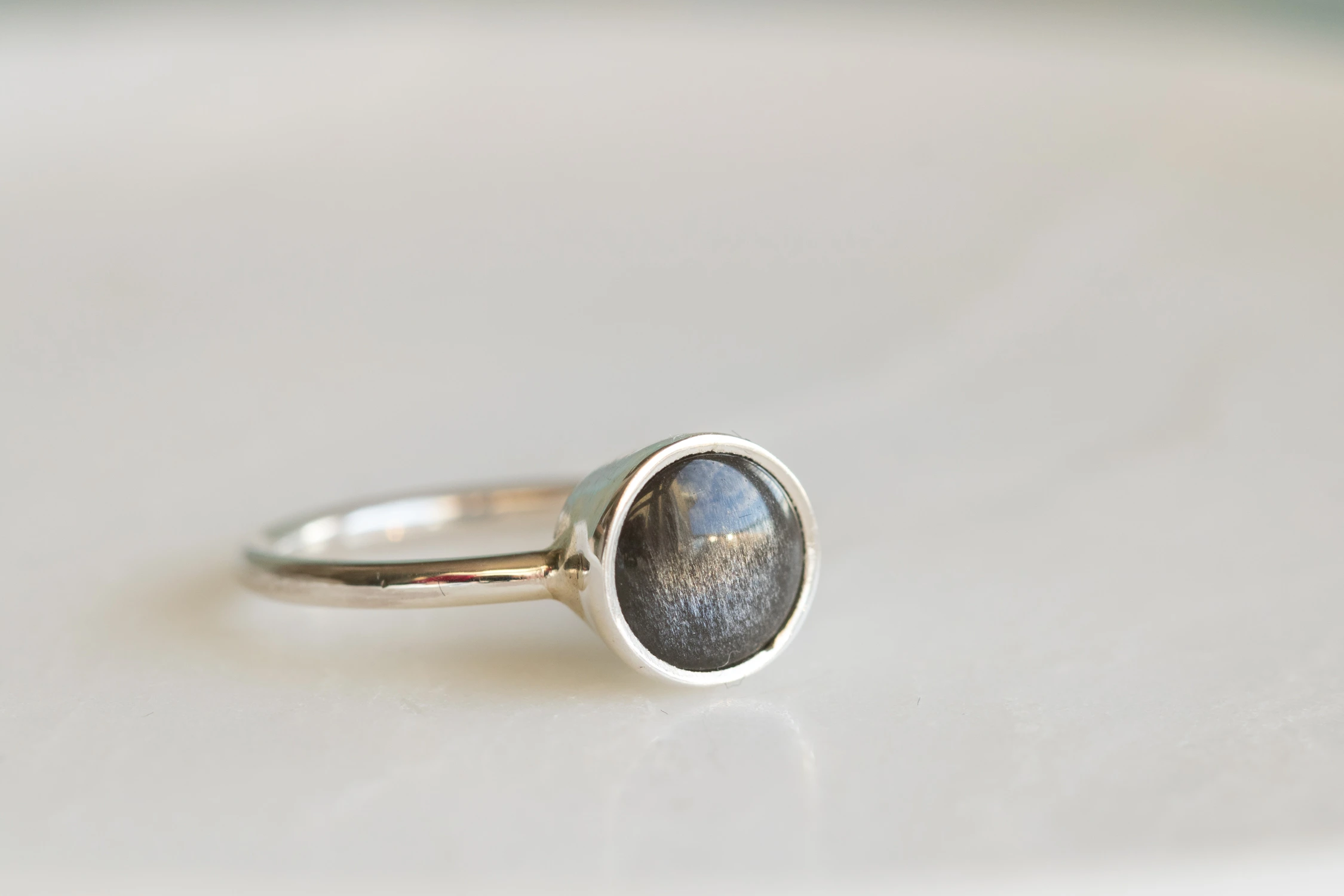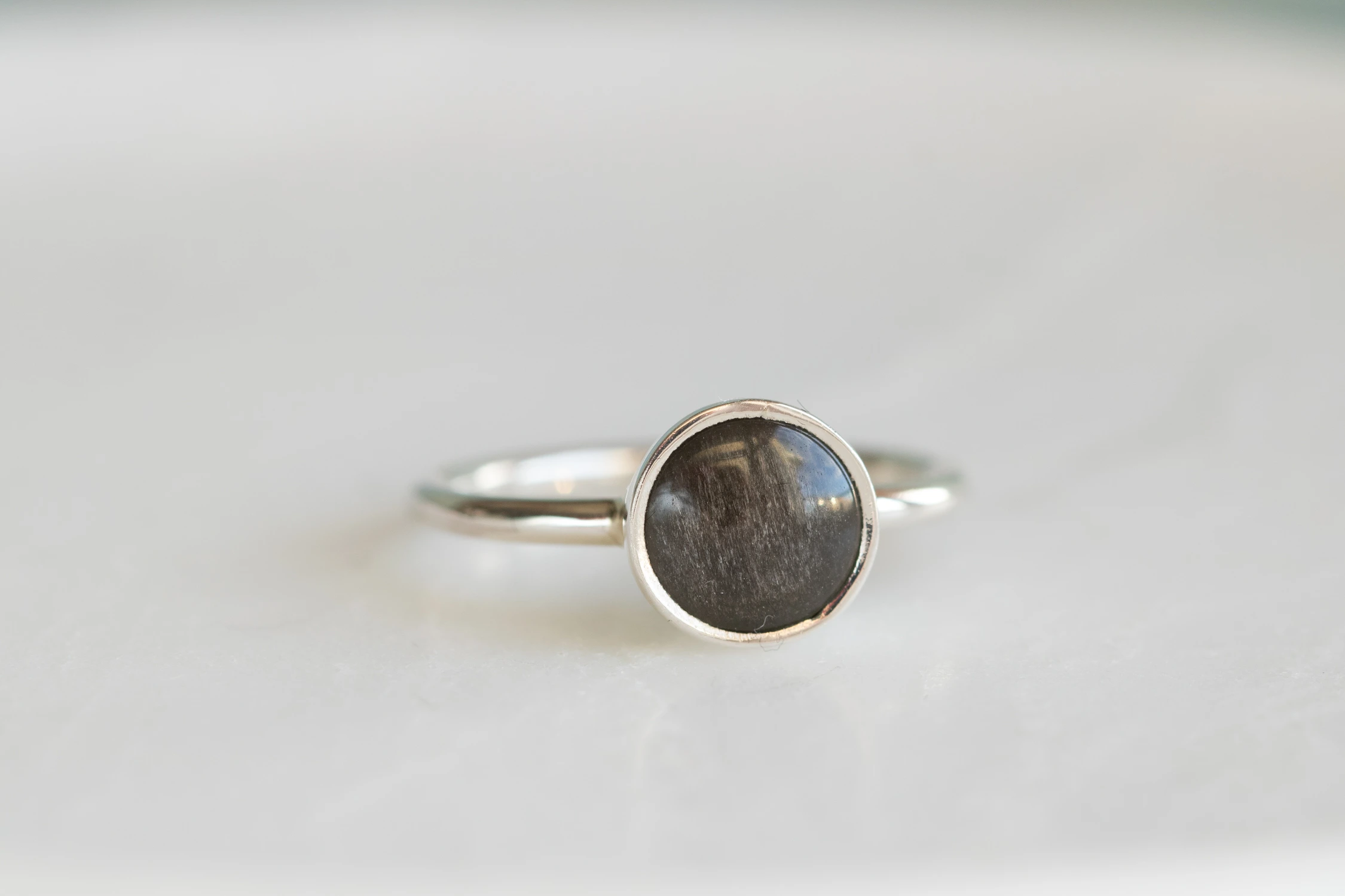 Srebrny pierścionek z okrągłym obsydianem srebrzystym. Jedyny egzemplarz, wykonany w rozmiarze 15 (możliwa modyfikacja 1-3 rozmiary)