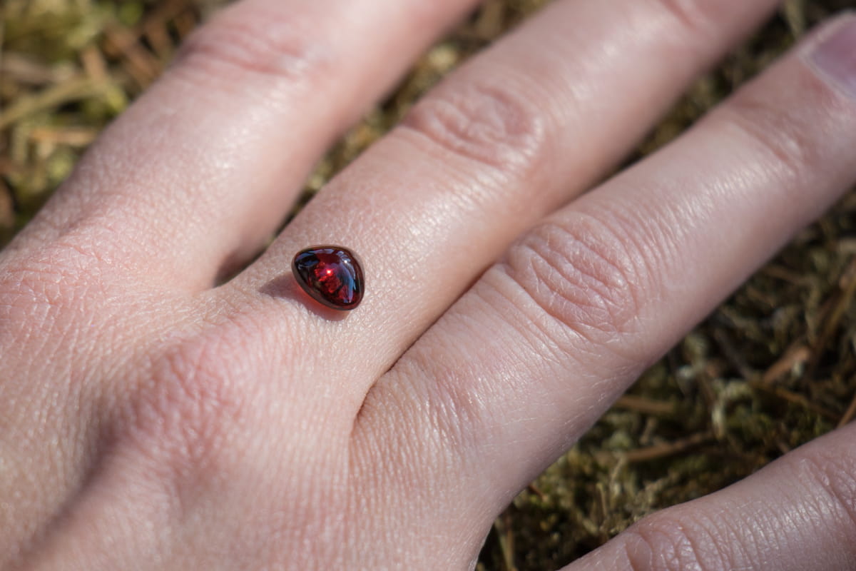 Kamienie: granat 6x6 mm w kształcie trójkąta o zaokrąglonych wierzchołkach w głębokiej barwie ciemnej czerwieni
