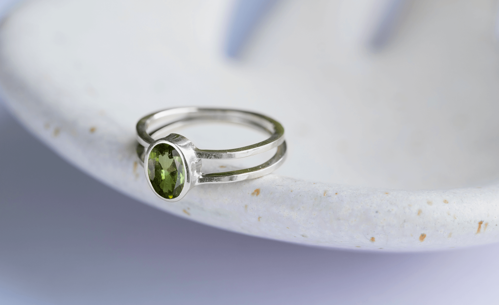 Srebrny pierścionek z zielonym turmalinem z podwójną obrączką P282g