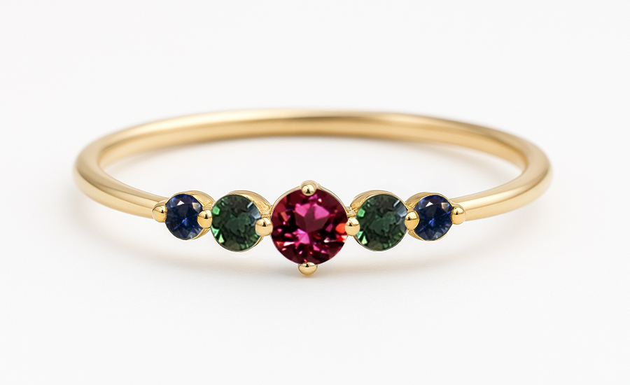 Złoty pierścionek z rodolitem, turmalinami i szafirami