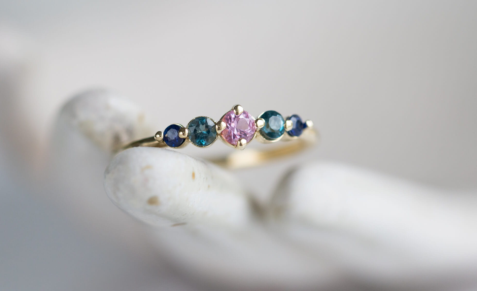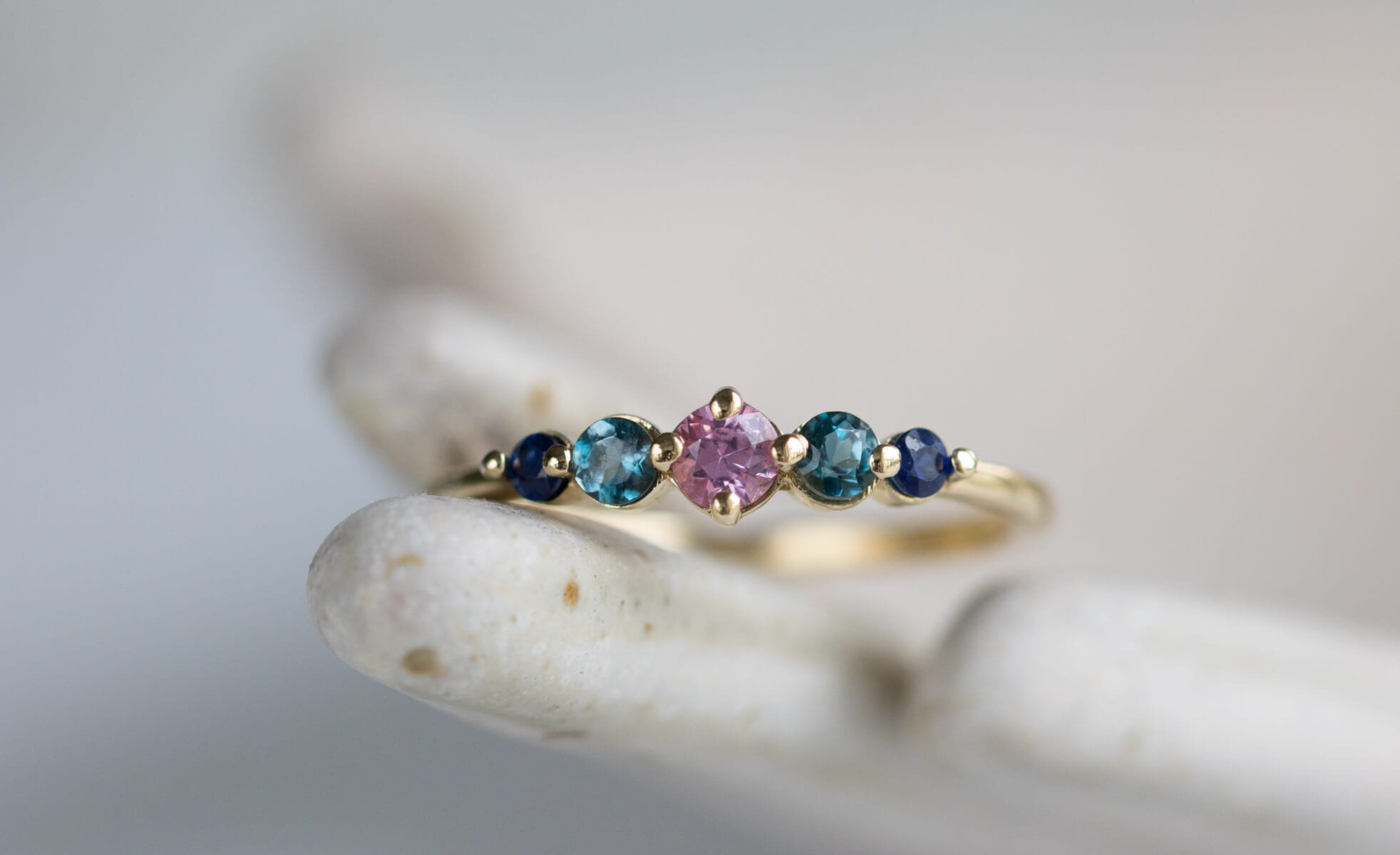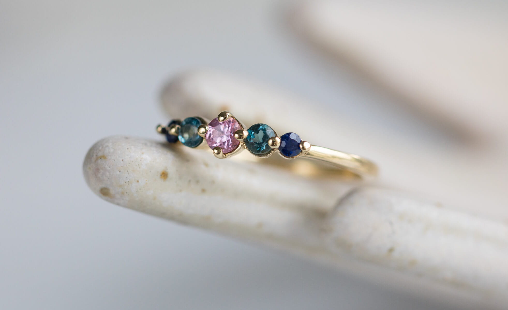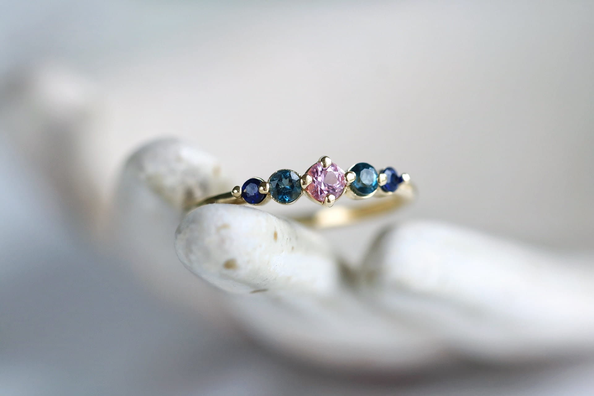W centrum oprawiono różowy szafir o średnicy 3 mm – jak ostatni ciepły promień zachodzącego słońca. Towarzyszą mu dwa topazy London Blue (2,5 mm) – chłodne i głębokie niczym zanikające niebo tuż po zmierzchu. Na skrajach oprawy błyszczą granatowe szafiry (2 mm), przywołujące noc, która powoli otula świat spokojem. Wszystkie kamienie zostały osadzone w delikatnych łapkach w oprawie z żółtego złota 585, a całość oprawy zaprojektowana z myślą o subtelności i wygodzie noszenia.