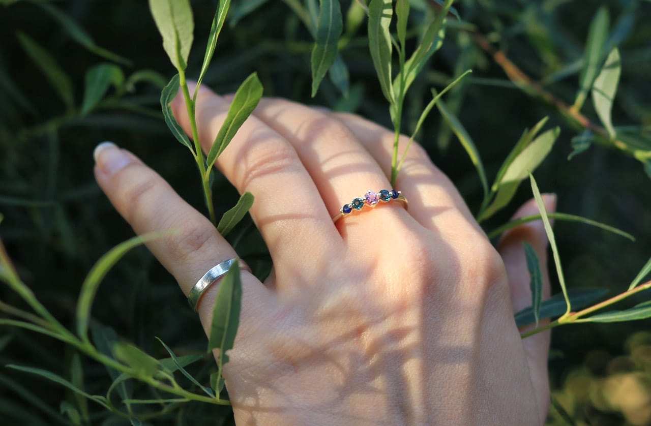 Miękkie światło zapadającego wieczoru. Różowy szafir w centrum iskrzy się ciepło, otoczony przez chłodne błękity, tworzy kontrast przypominający niebo podczas zachodu – przechodzące z różu w granat. To pierścionek pełen równowagi między delikatnością a siłą.