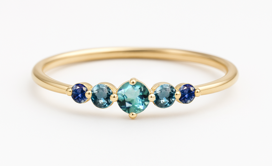 Złoty pierścionek z 5 kamieniami - Migotanie morza P381