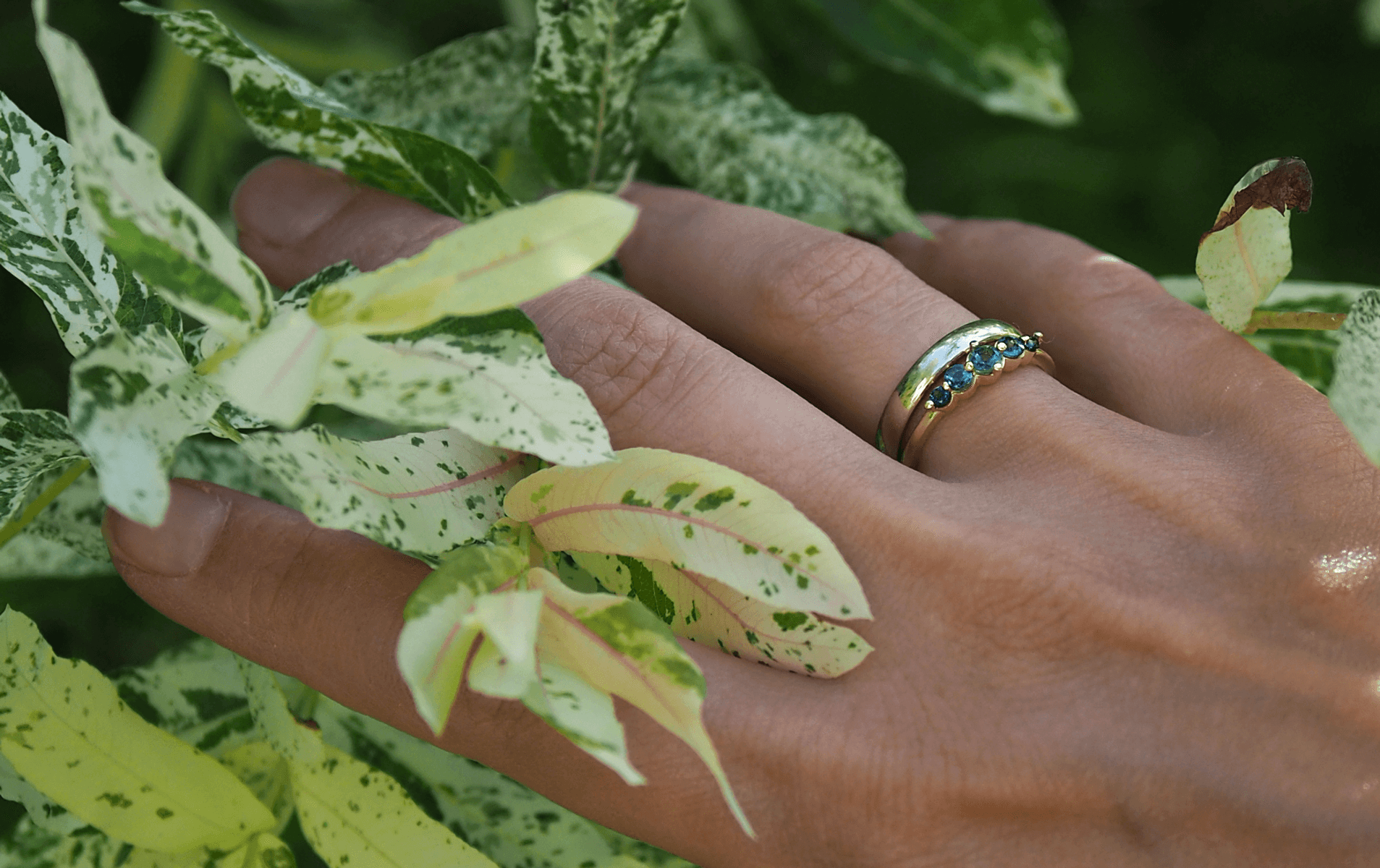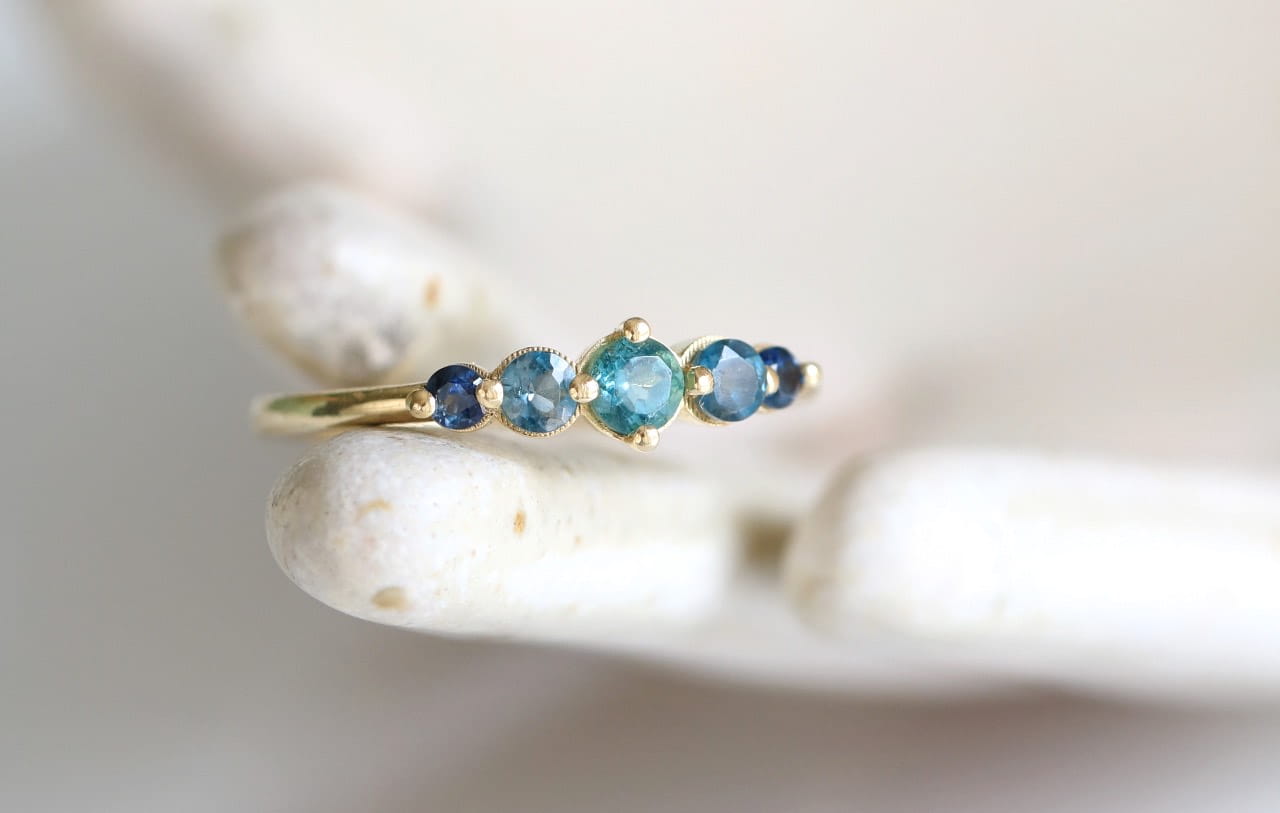 Błękity o wielu odcieniach – jak morze, które lśni w słońcu i zmienia się z każdą falą. To pierścionek o ruchu, głębi i zachwycie. O wspomnieniach zamkniętych w roziskrzonych kroplach wody.