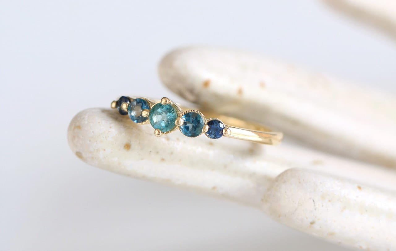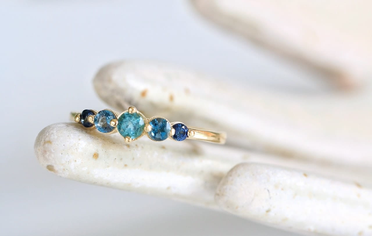 Delikatny złoty pierścionek wykonany ze złota próby 585, inspirowany światłem odbitym na morskiej tafli o poranku. W centrum oprawiony został morski turmalin o średnicy 3 mm, hipnotyzujący głębią barw. Towarzyszą mu dwa topazy London Blue (2,5 mm), przywodzące na myśl błękitne światło przenikające przez wodę, oraz dwa najmniejsze granatowe szafiry (2 mm), jak cienie fal chowających się pod powierzchnią.