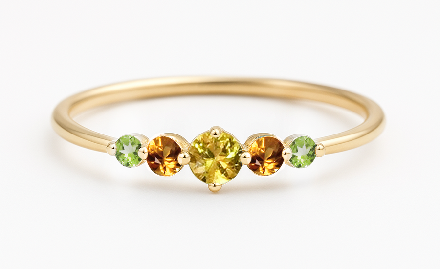 Ciepło, które rozgrzewa, ale nie parzy. Żółty szafir świeci niczym letni promień, a pomarańczowy granat hessonit przywołuje smak dojrzewających owoców i bezchmurne niebo w południe. Zieleń perydotu dopełnia całość niczym zieleń liści w pełnym słońcu. Delikatny i pełen życia – ten pierścionek nosi w sobie wspomnienie letniego śmiechu. Ten pierścionek przypomina, że lato może trwać dłużej – jeśli je zachowasz w pamięci (lub na palcu).