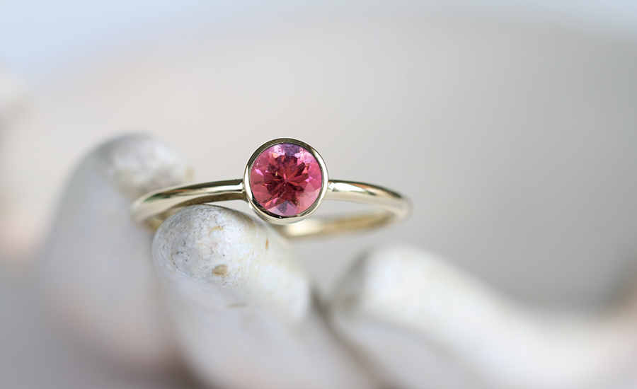 Minimalistyczna forma i szlachetny blask – ten pierścień to połączenie klasyki i nowoczesnej elegancji. Jego sercem jest fasetowany różowy kamień o średnicy 5,1 mm, którego barwa urzeka ciepłymi odcieniami różu, przechodzącymi subtelnie w głębsze tony w zależności od światła.