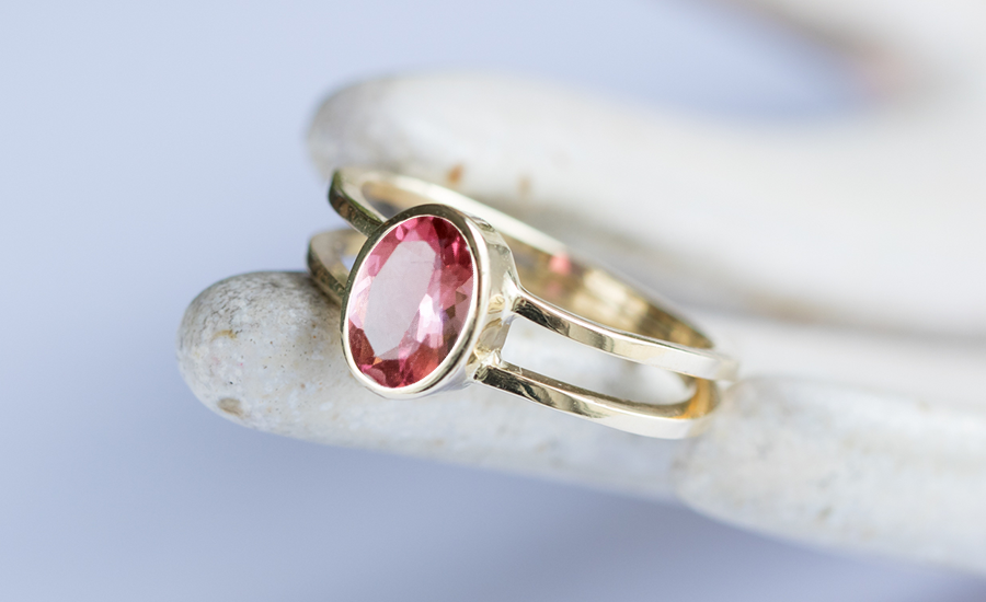 Złoty pierścionek z różowym turmalinem z podwójną obrączką P298