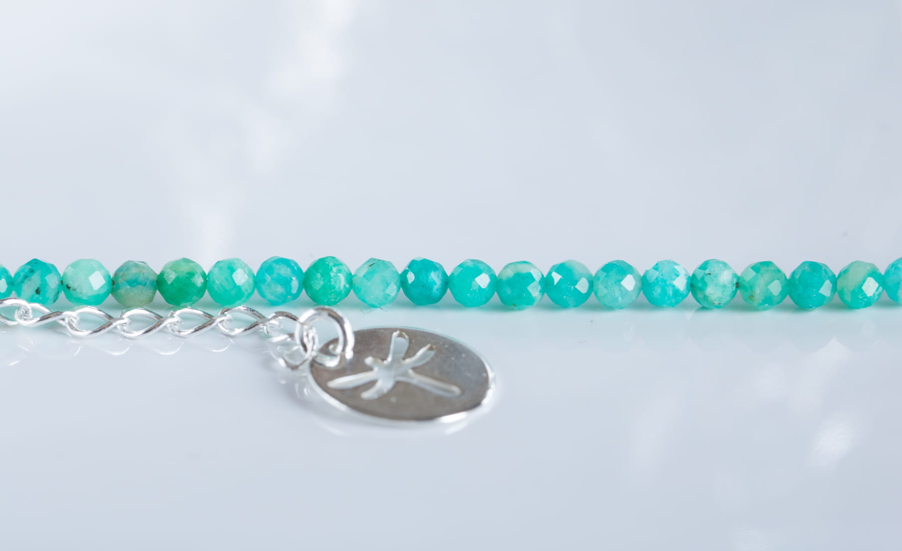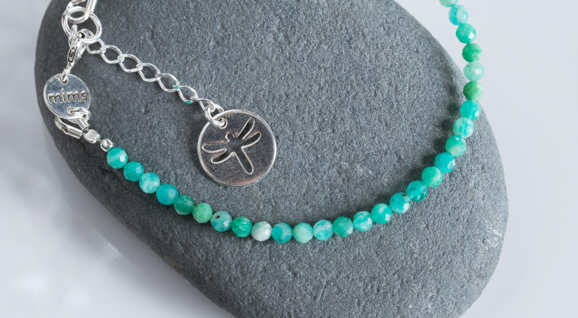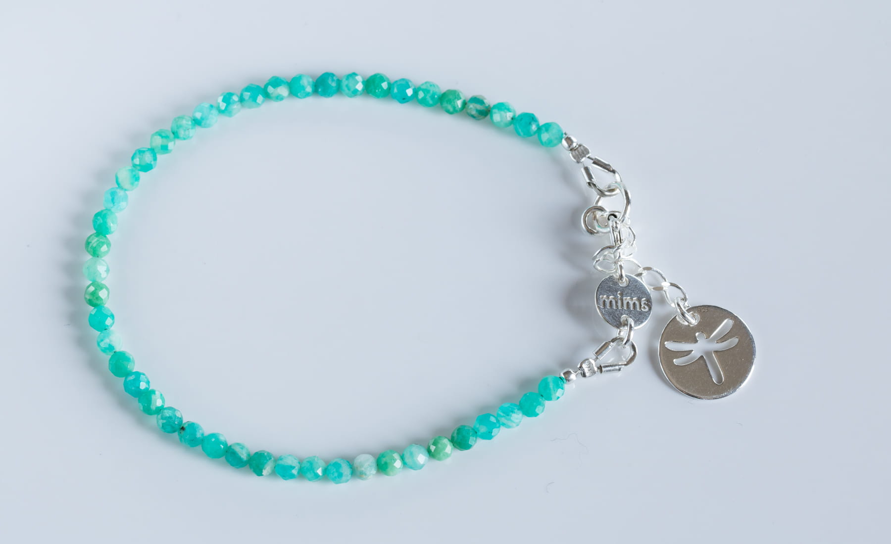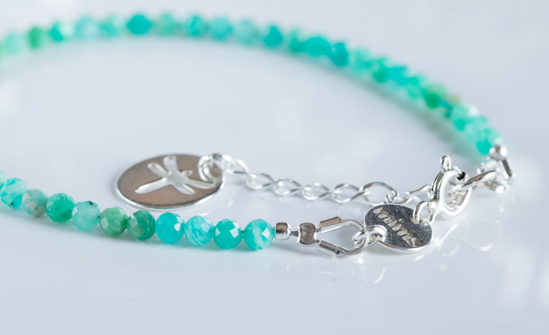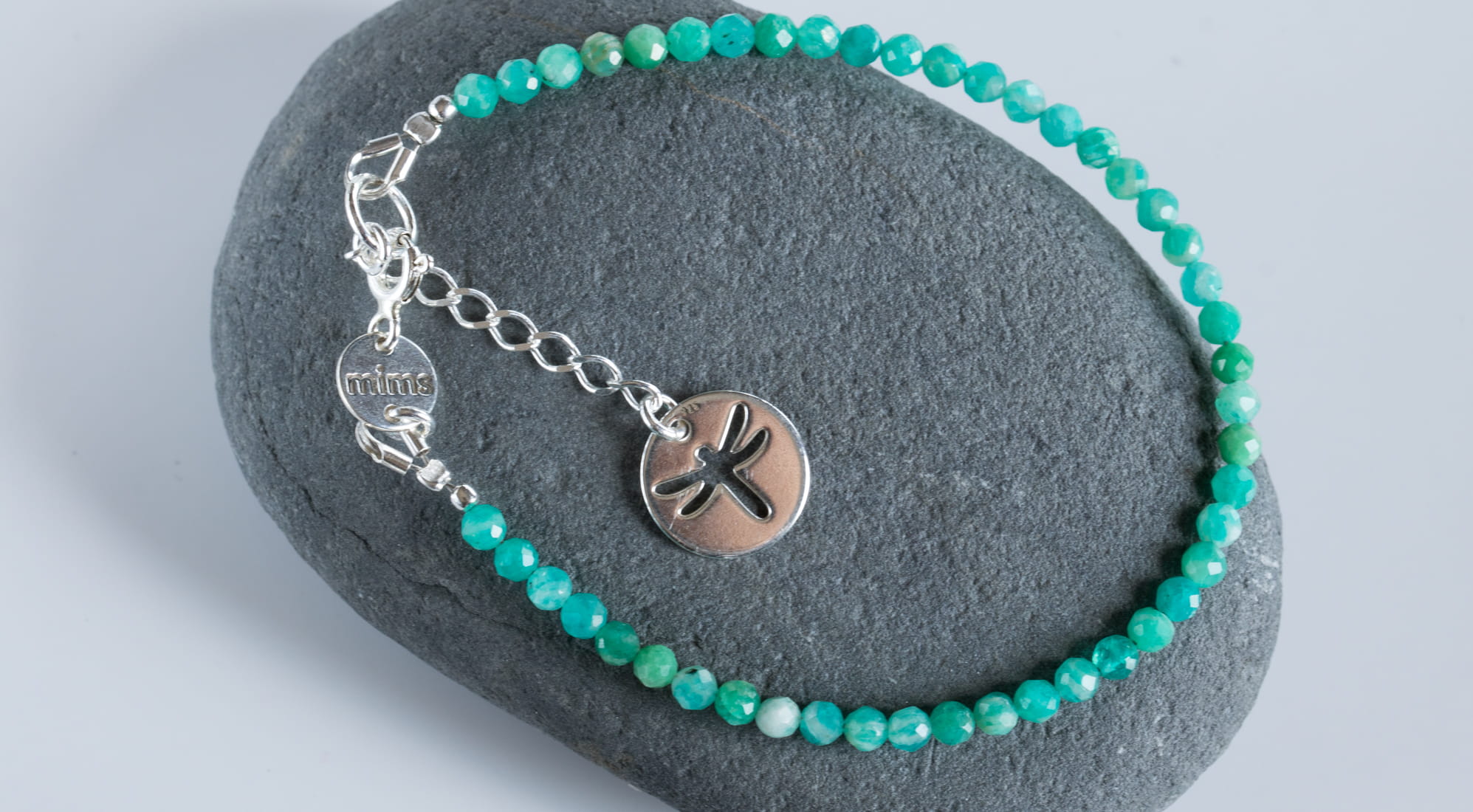 Bransoletka na lince jubilerskiej ze srebrnym zapięciem i zawieszką z ważką z amazonitami rosyjskimi (bardziej zielonkawy odcień niż w tradycyjnych amazonitach) 3 mm, fasetowane kuleczki.