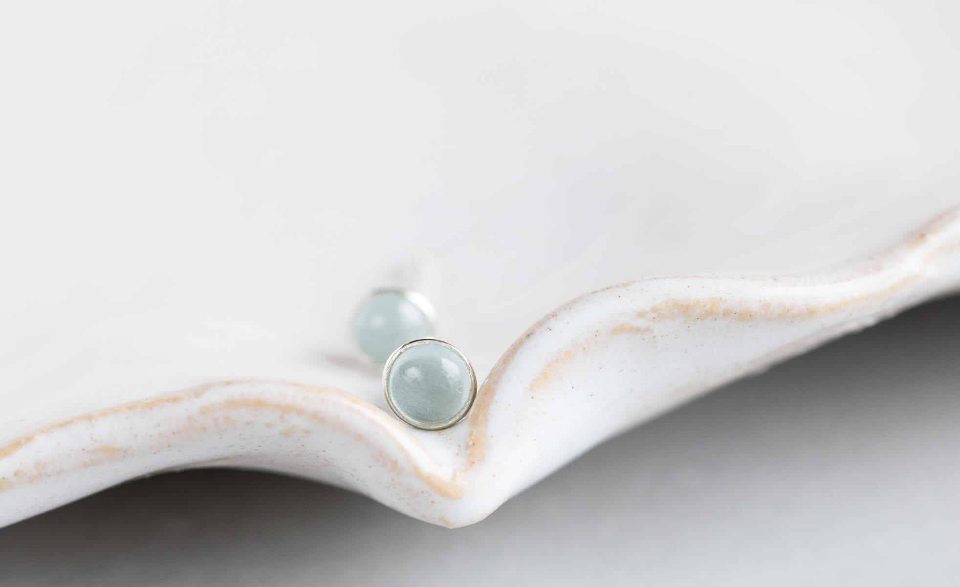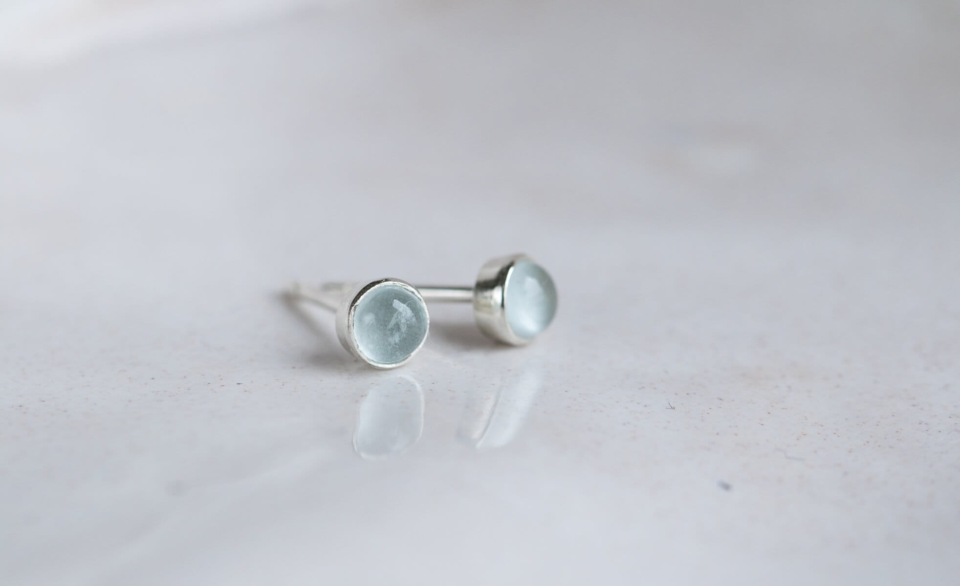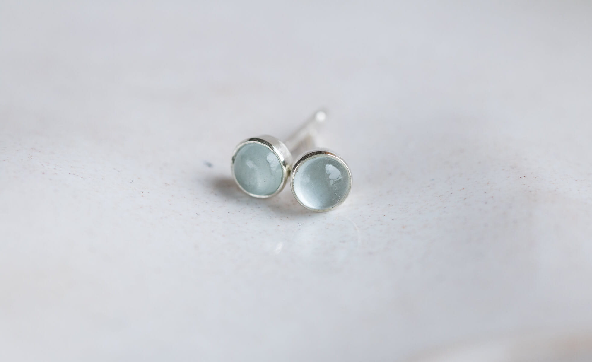 Sztyfty z okrągłym akwamarynem 4mm w srebrnej oprawie p.925. Kamień w odcieniu jasno błękitnym, lekko srebrzystym.