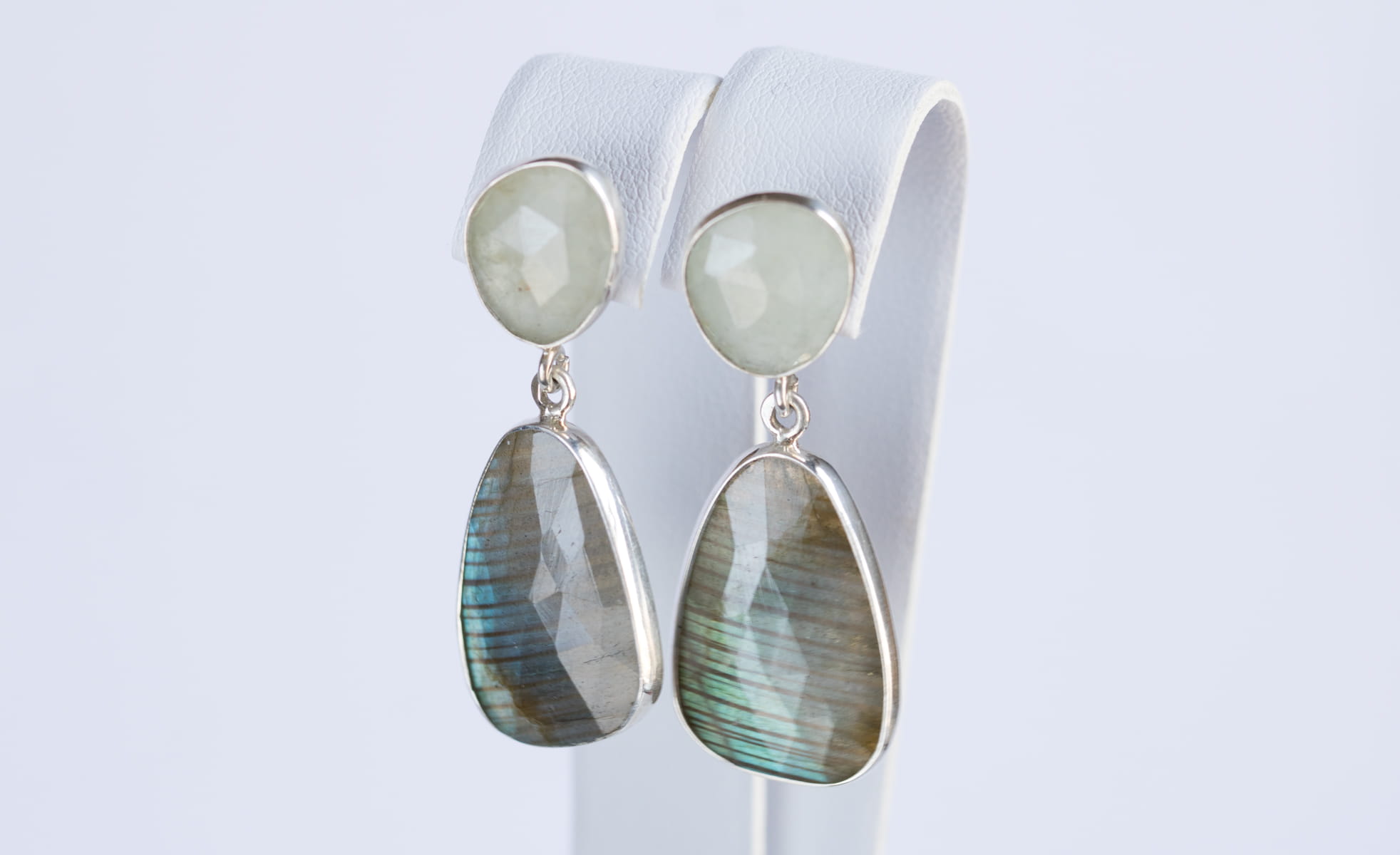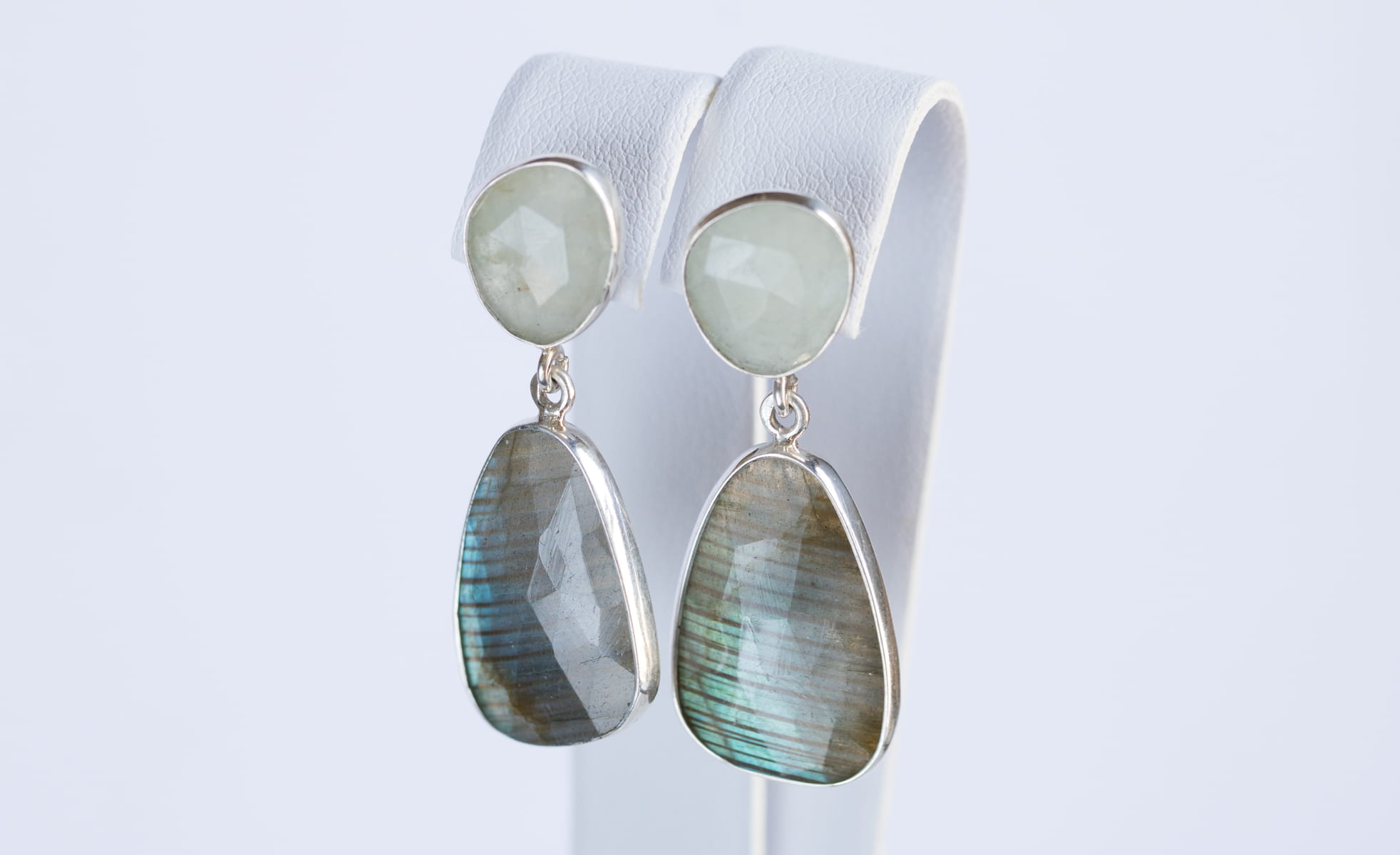 Wiszące kolczyki z fasetowanymi akwamarynami i labradorytami w srebrnej oprawie p.925, na sztyft. Długość całkowita kolczyków 35mm.