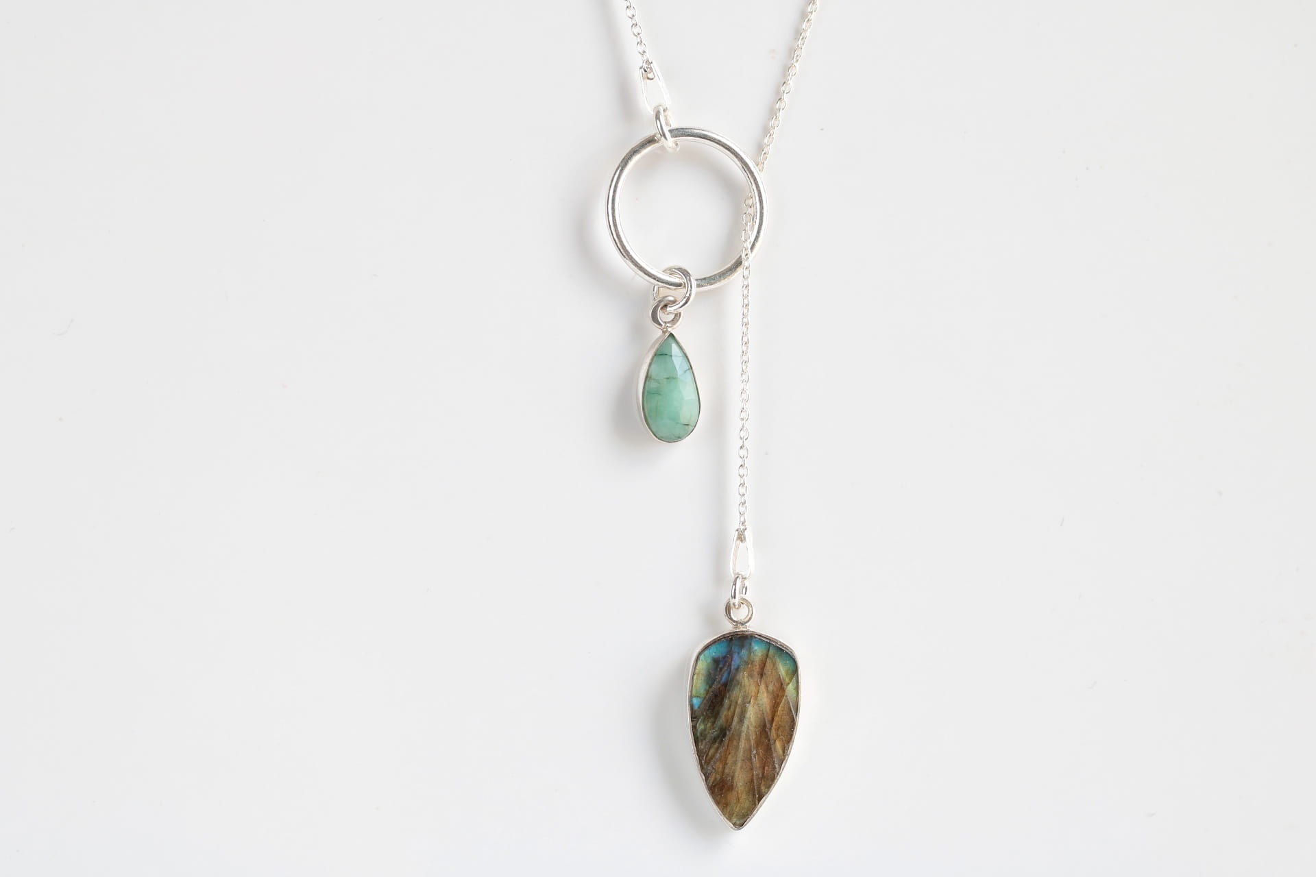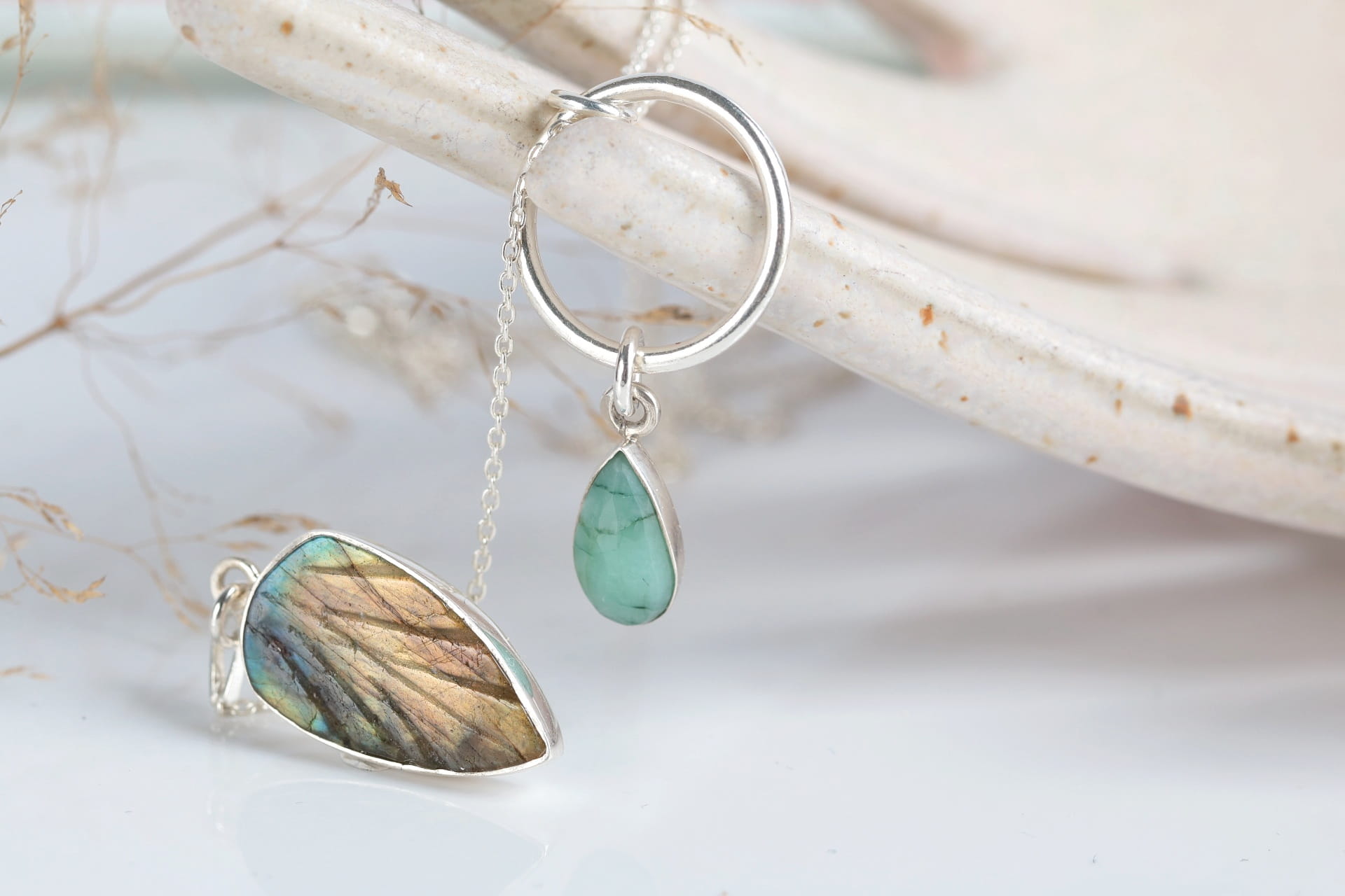 Labradoryt 10x19mm z ręcznym rzeźbieniem użyłkowania liścia w oprawie srebrnej p.925 na łańcuszku z kółkiem o regulowanej długości. Dodatkowa zawieszka z fasetowanym, jasnym szmaragdem 5x10mm.