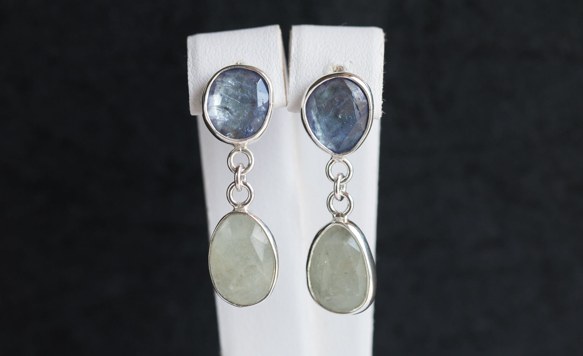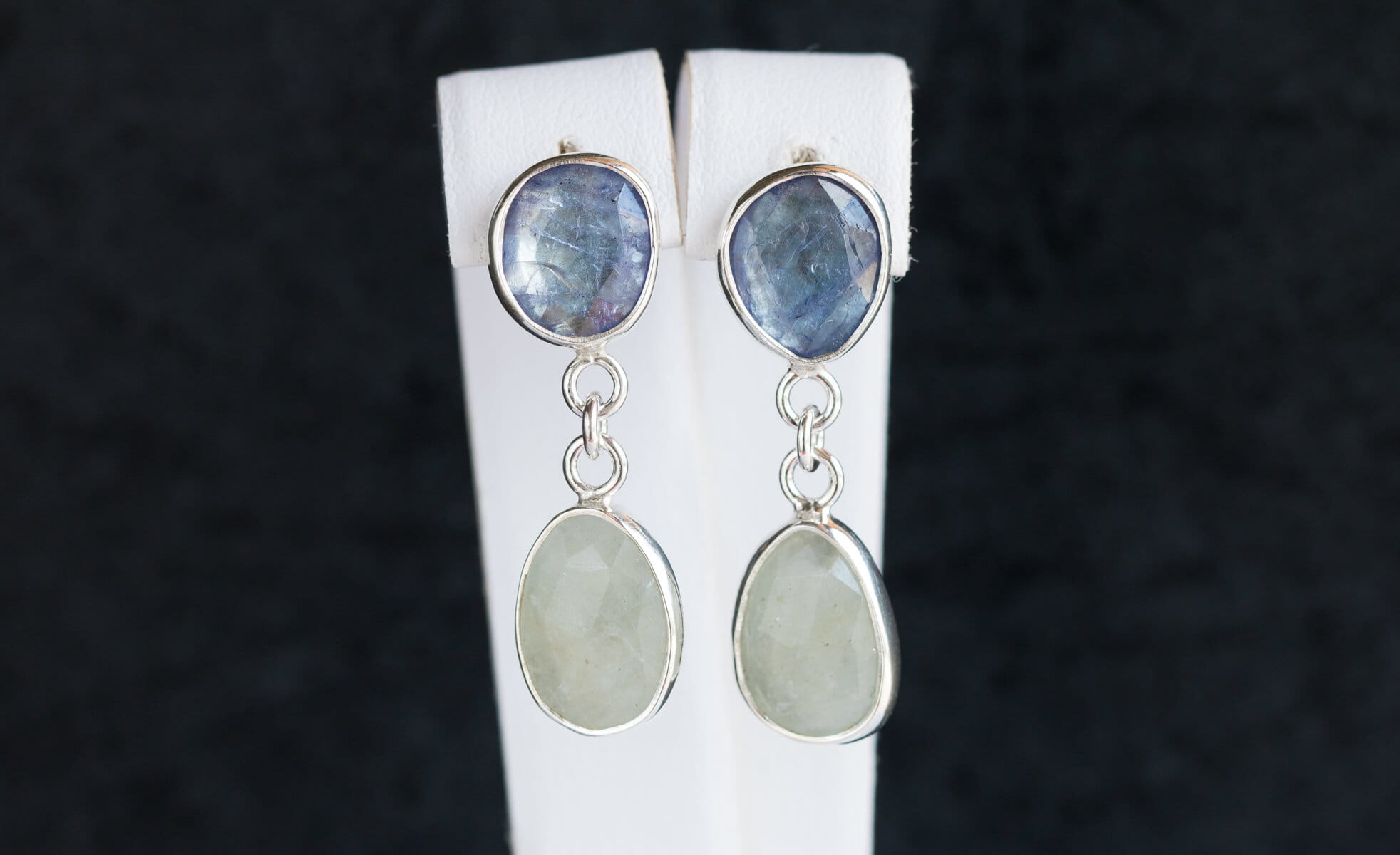 Wiszące kolczyki z fasetowanymi z tanzanitami i akwamarynami o nieregularnych kształtach, w srebrnej oprawie p.925, na sztyft. Długość całkowita kolczyków 32mm.