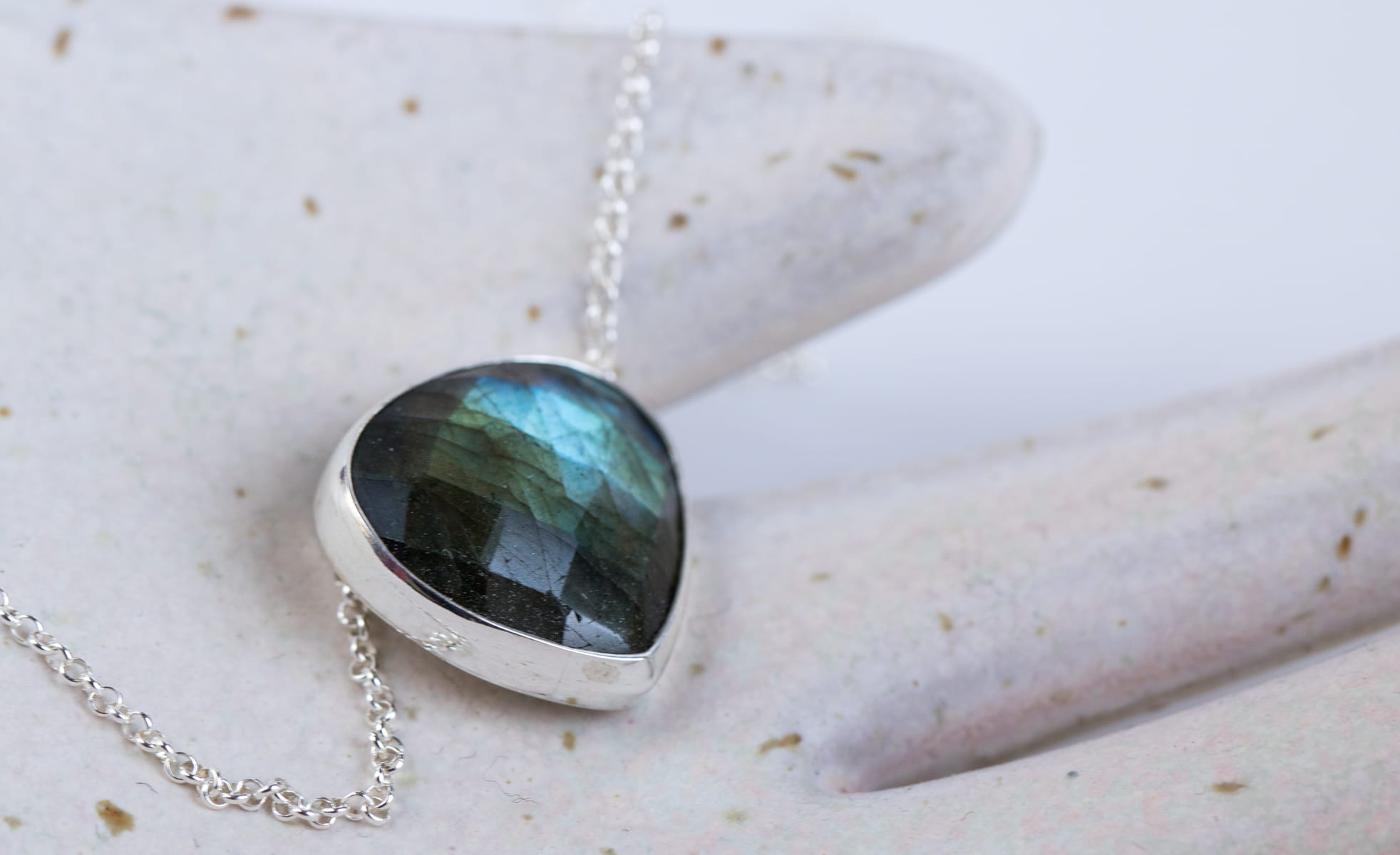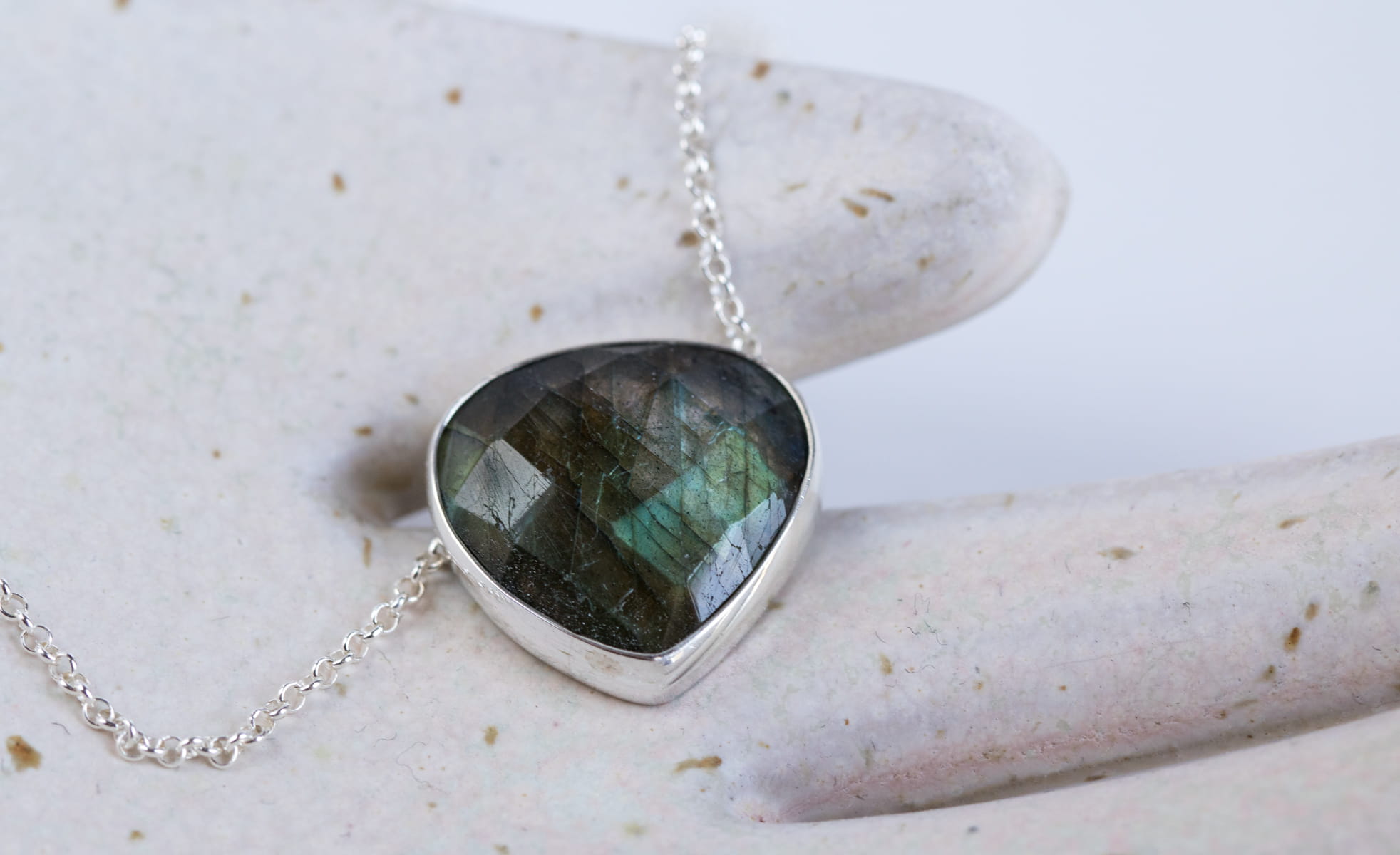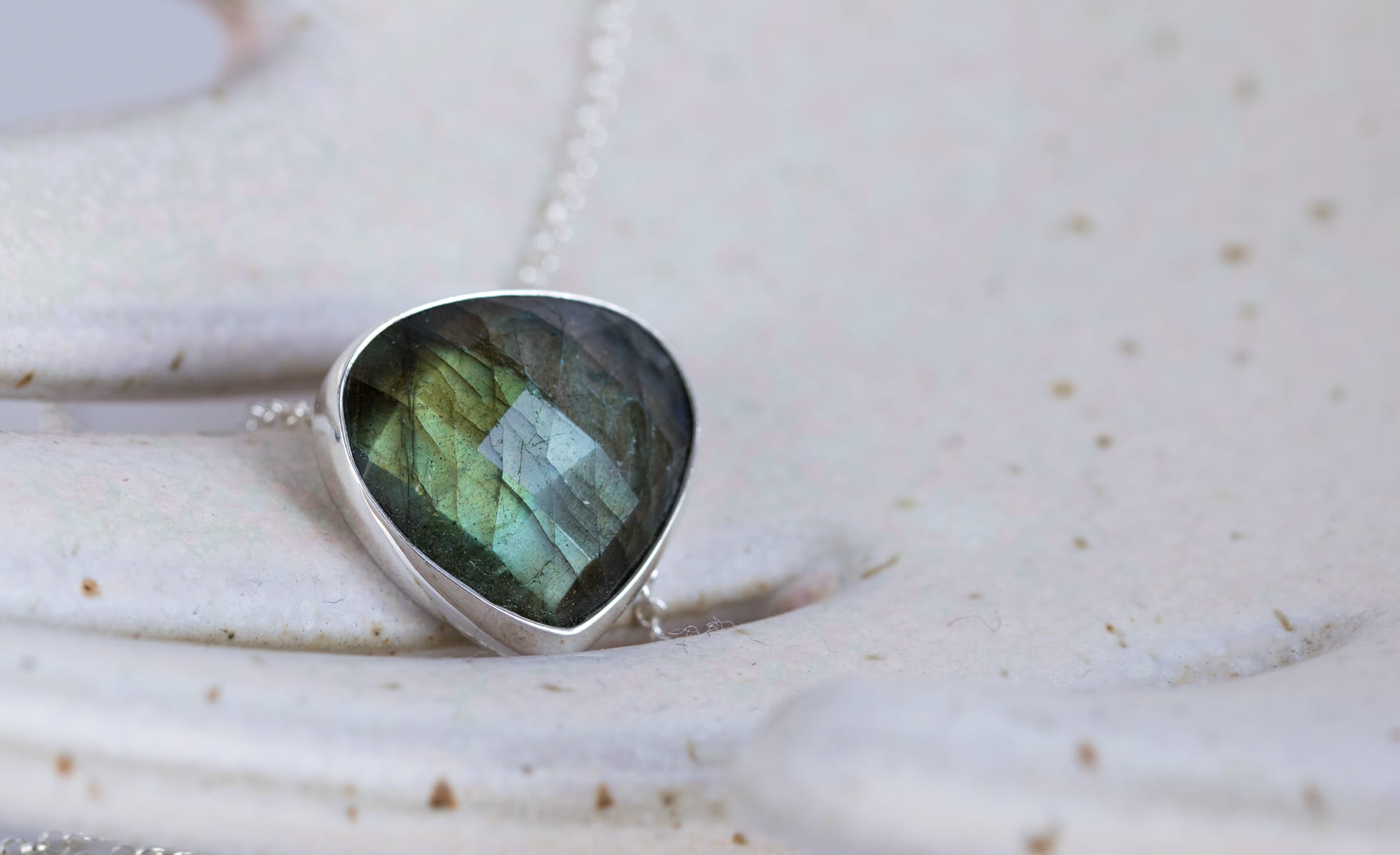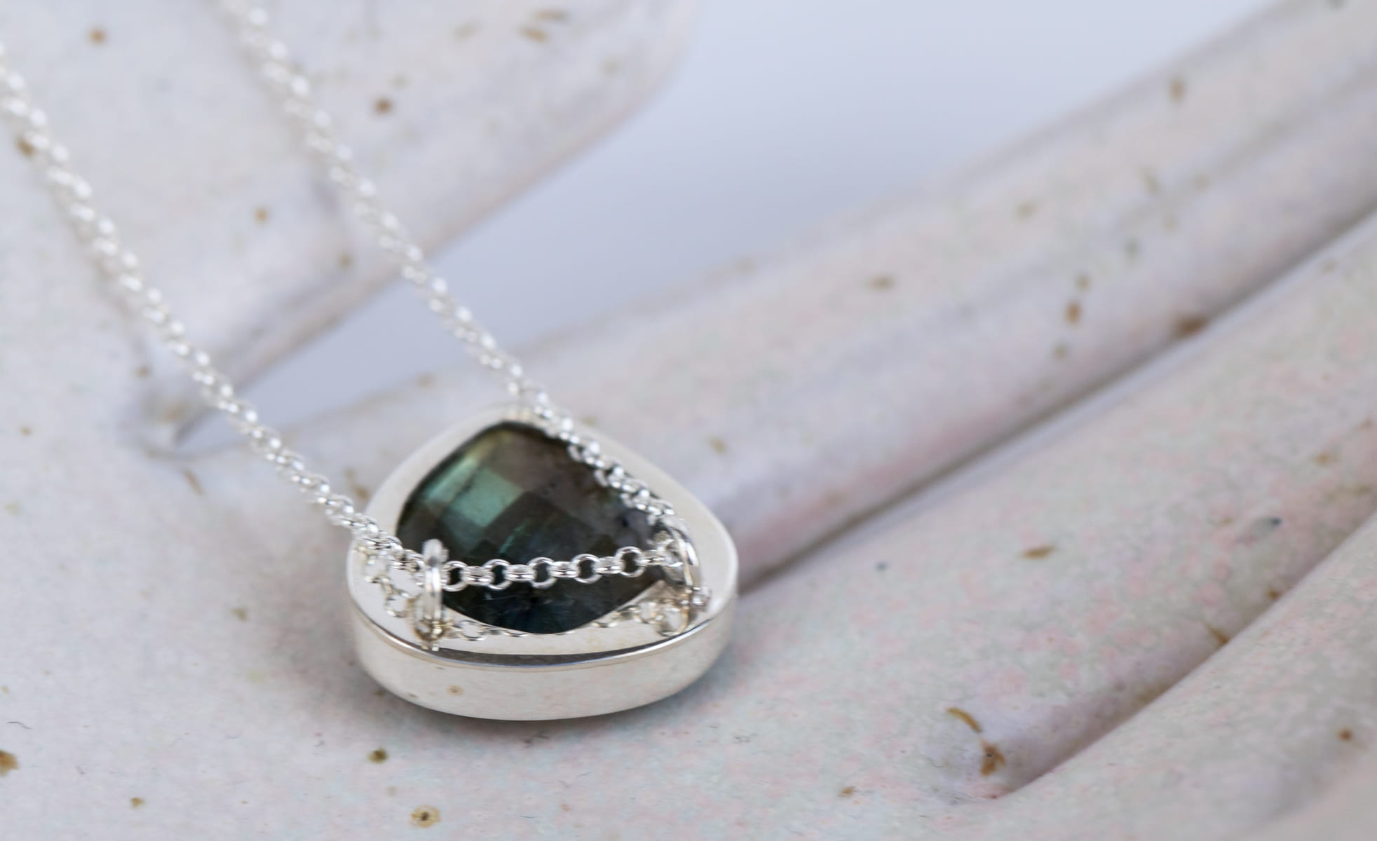 Srebrny naszyjnik z fasetowanym labradorytem 16x16mm, z krytym miejscem mocowania łańcuszka z tyłu. Długość łańcuszka 45cm.