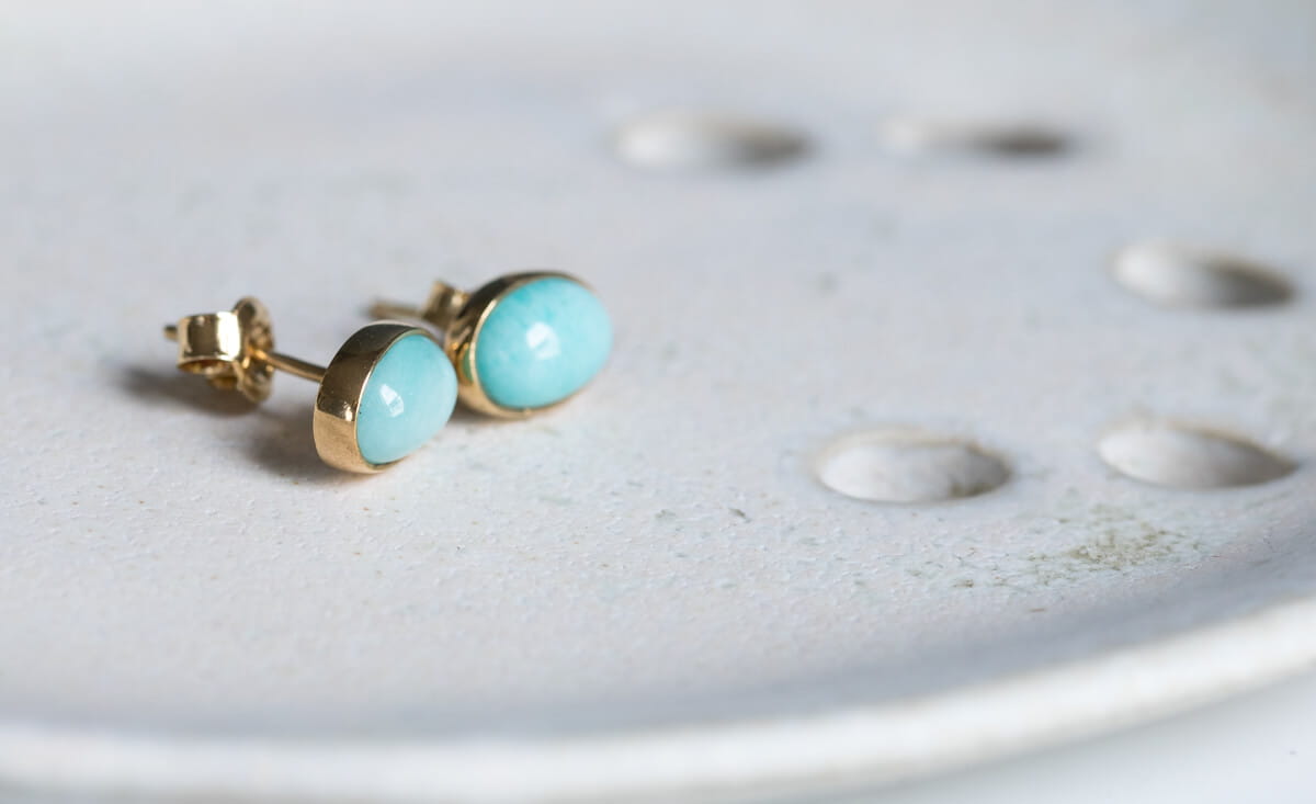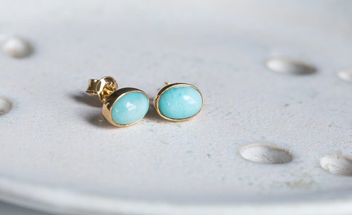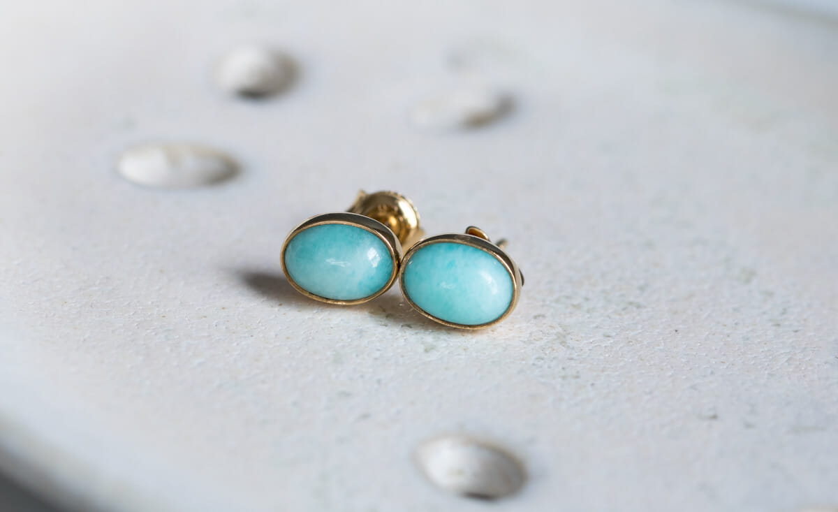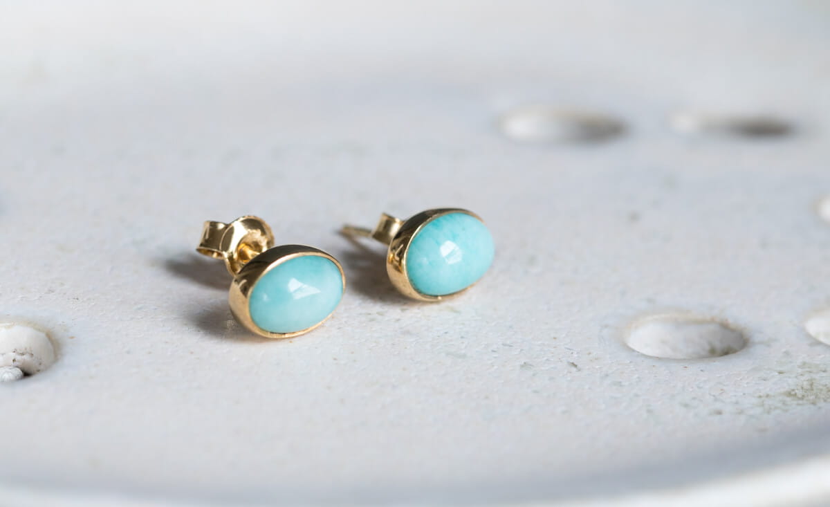 Kolczyki: srebro p.925 pokryte 24k złotem, amazonit w srebrnej oprawie., 6x8mm
